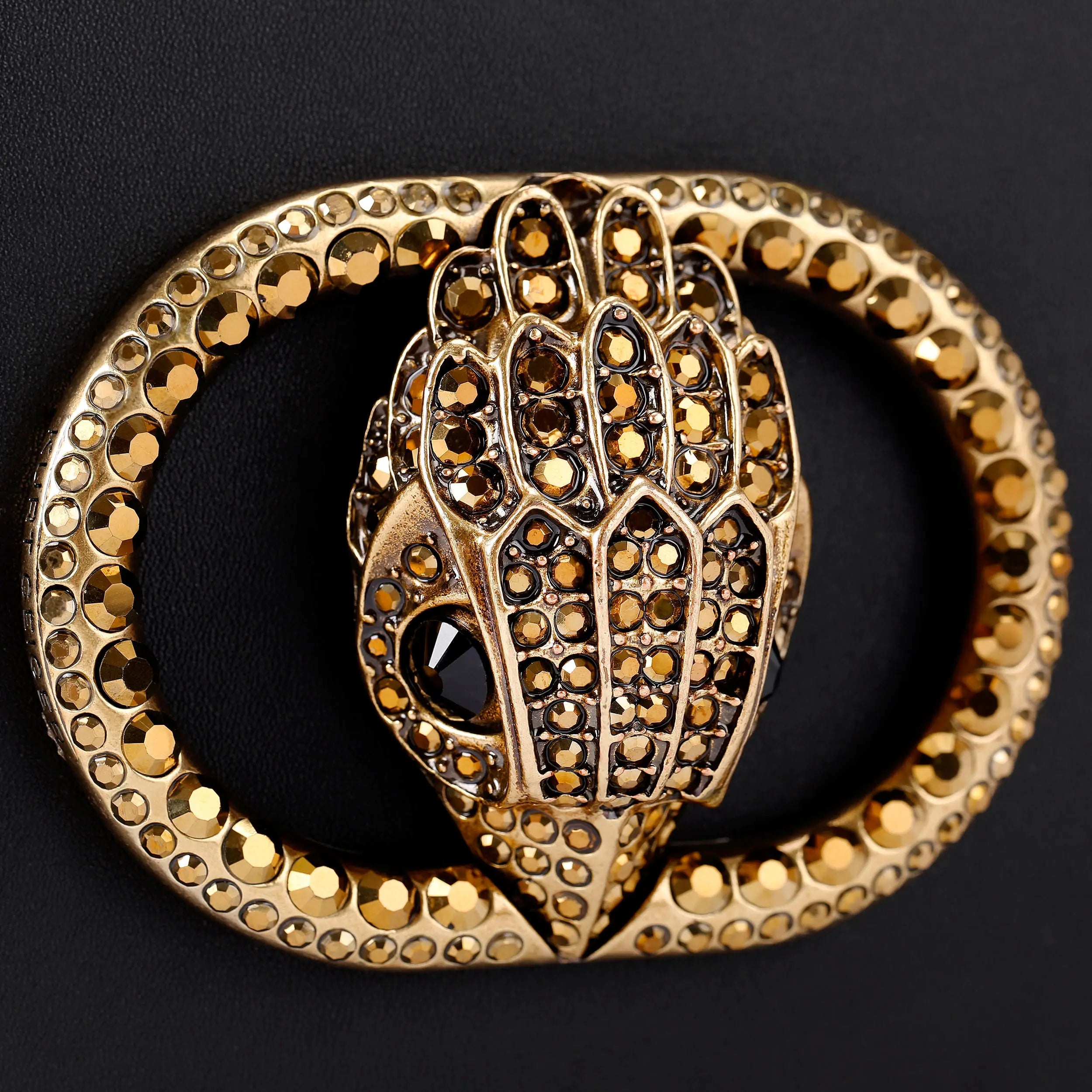 This Small Chelsea Camera purse features a black leather structured exterior. There is a crystal embellished antiqued brass oval trim with central eagle head on the front.