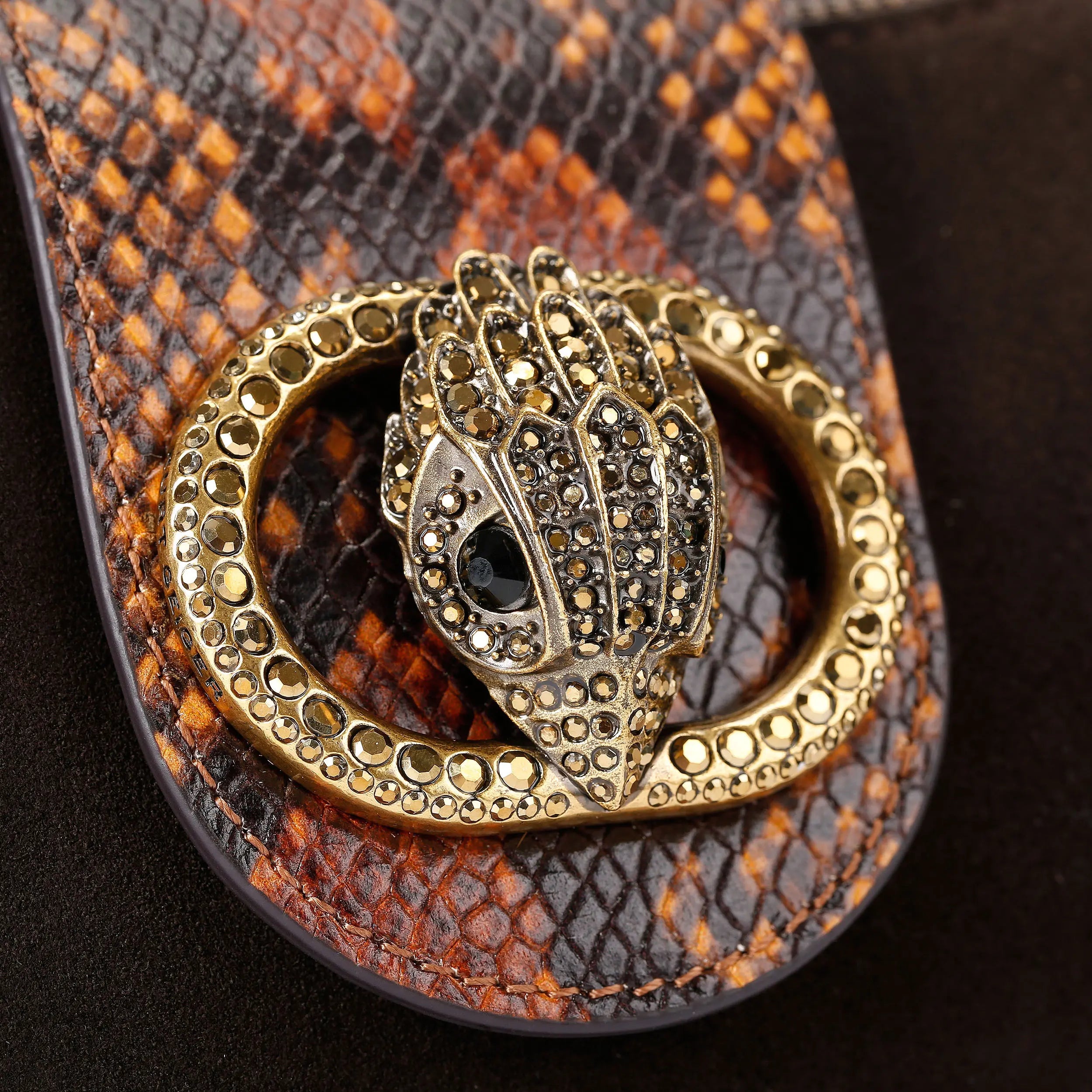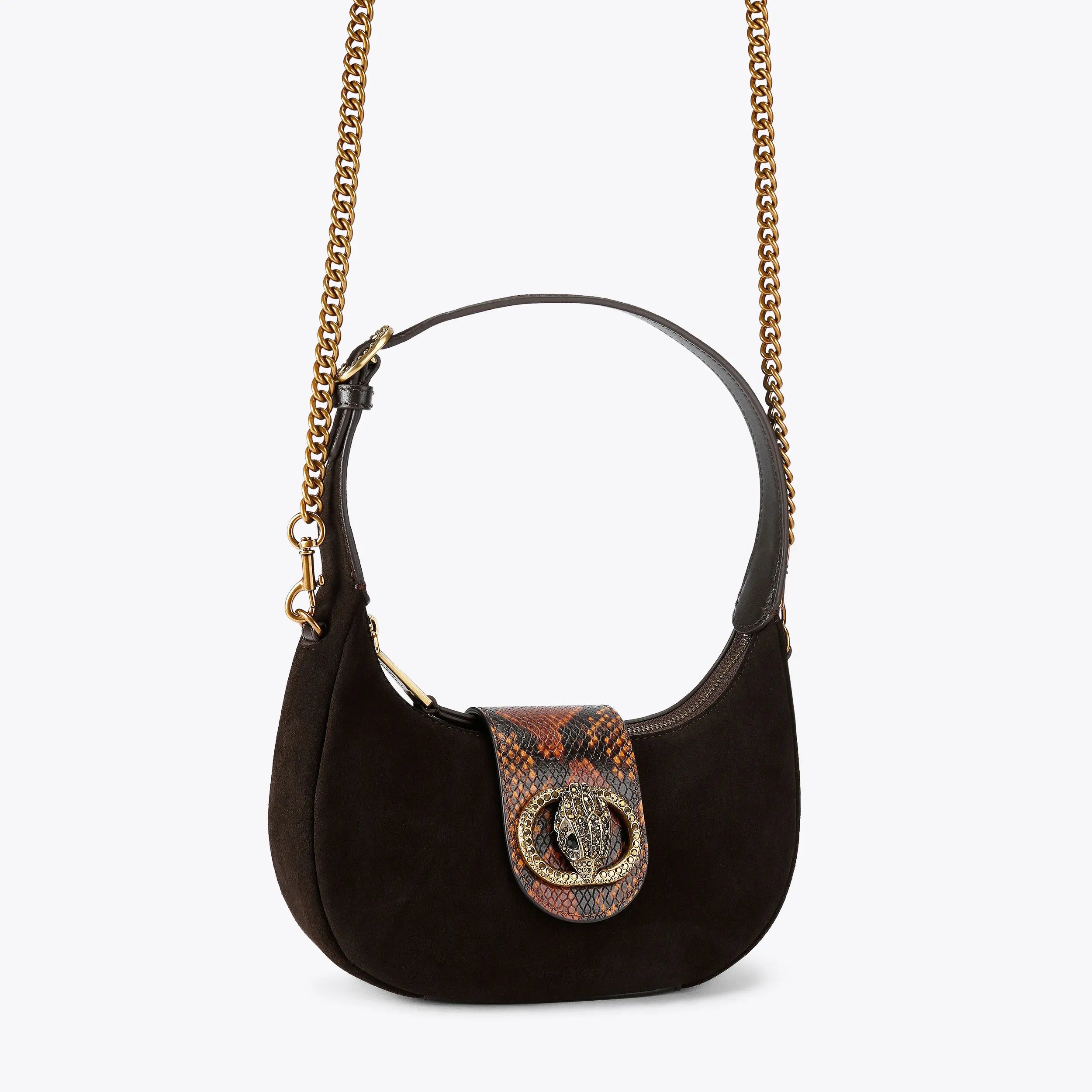 This Small Chelsea Hobo purse features a brown suede exterior which is accented with a brown lizard embossed flap. There is a crystal embellished antique brass oval trim with central eagle head on the front.