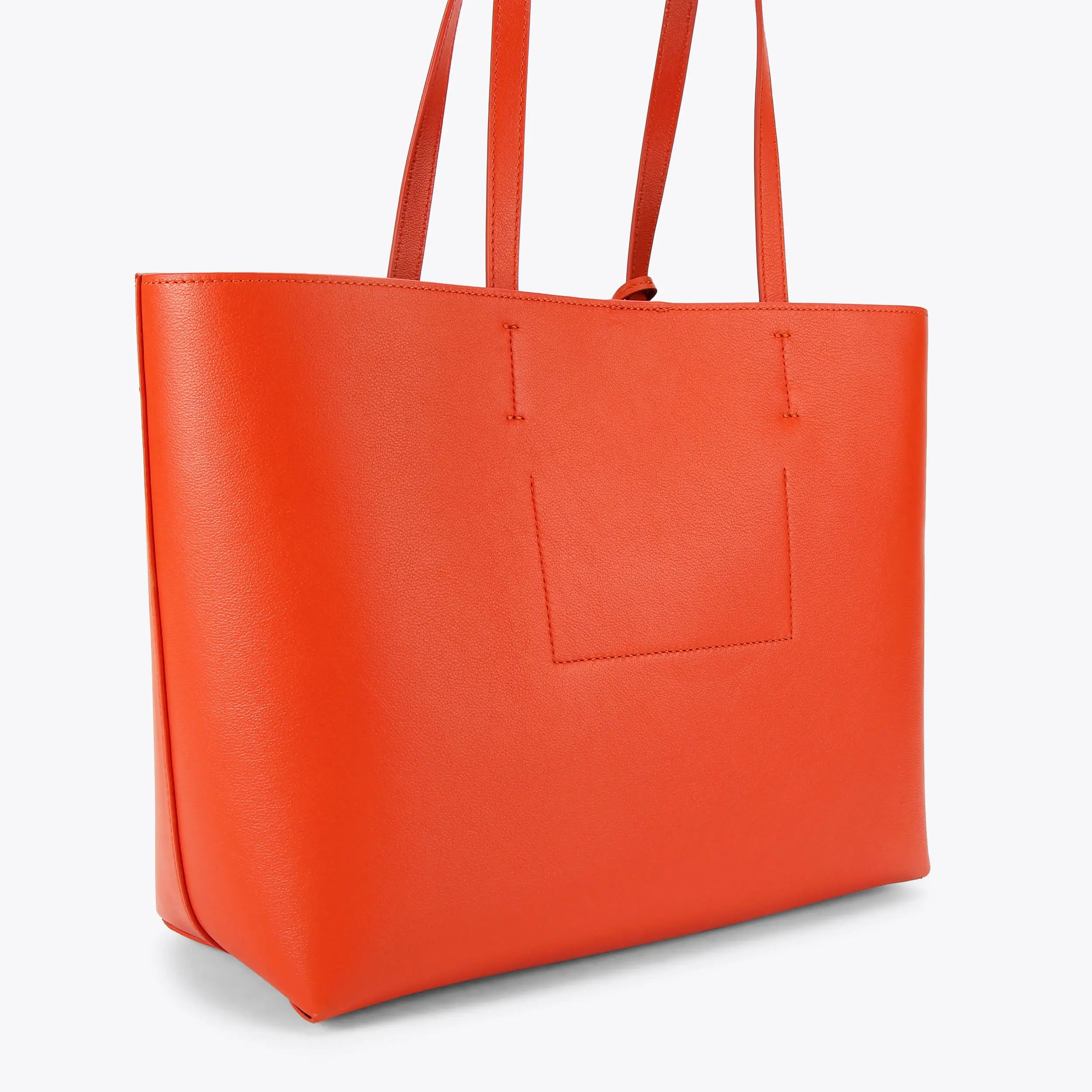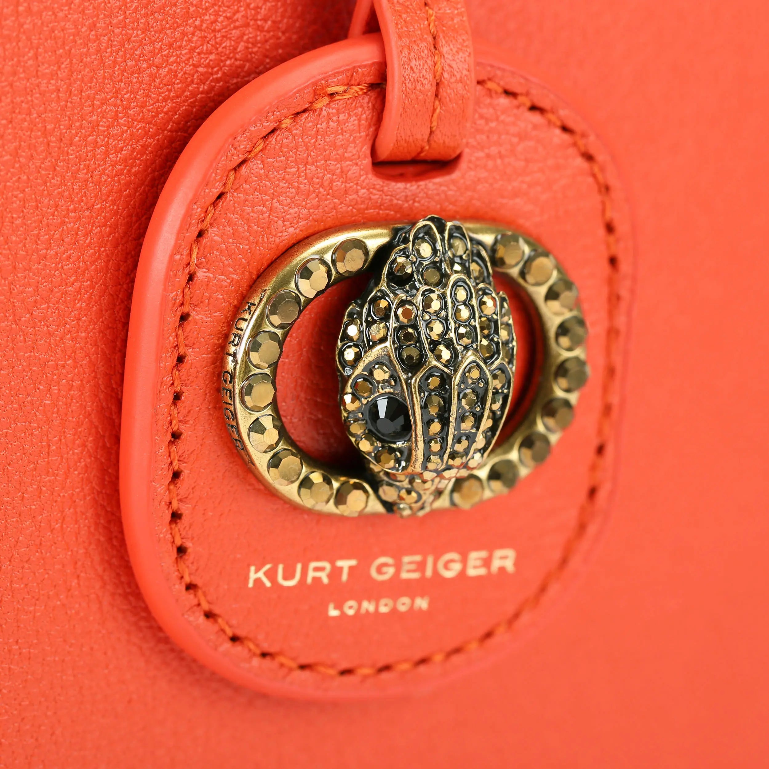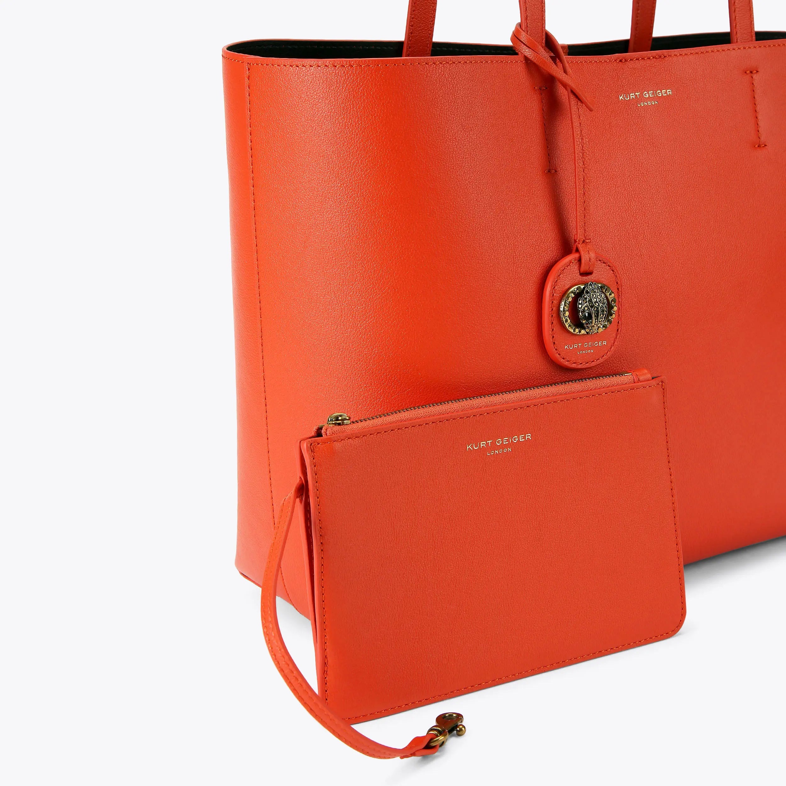 The Chelsea Shopping Purse features an orange leather exterior with slight structure. There is subtle gold foil branding on the front and a crystal embellished antiqued brass oval trim with central eagle head on the luggage tag.