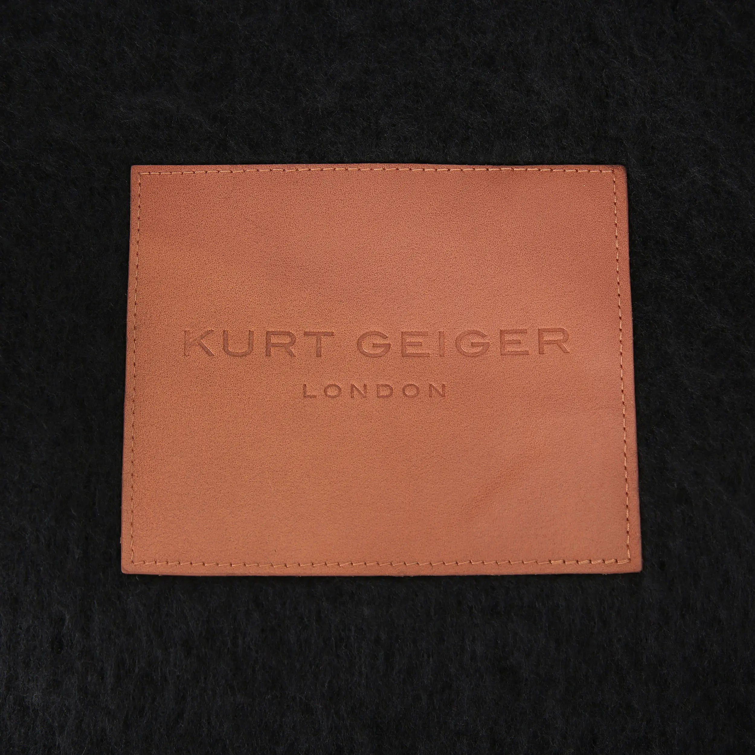 This Yarndye scarf is crafted in a fluffy black fabric. There is a brown faux leather embossed patch at one end with statement tassel details at both.