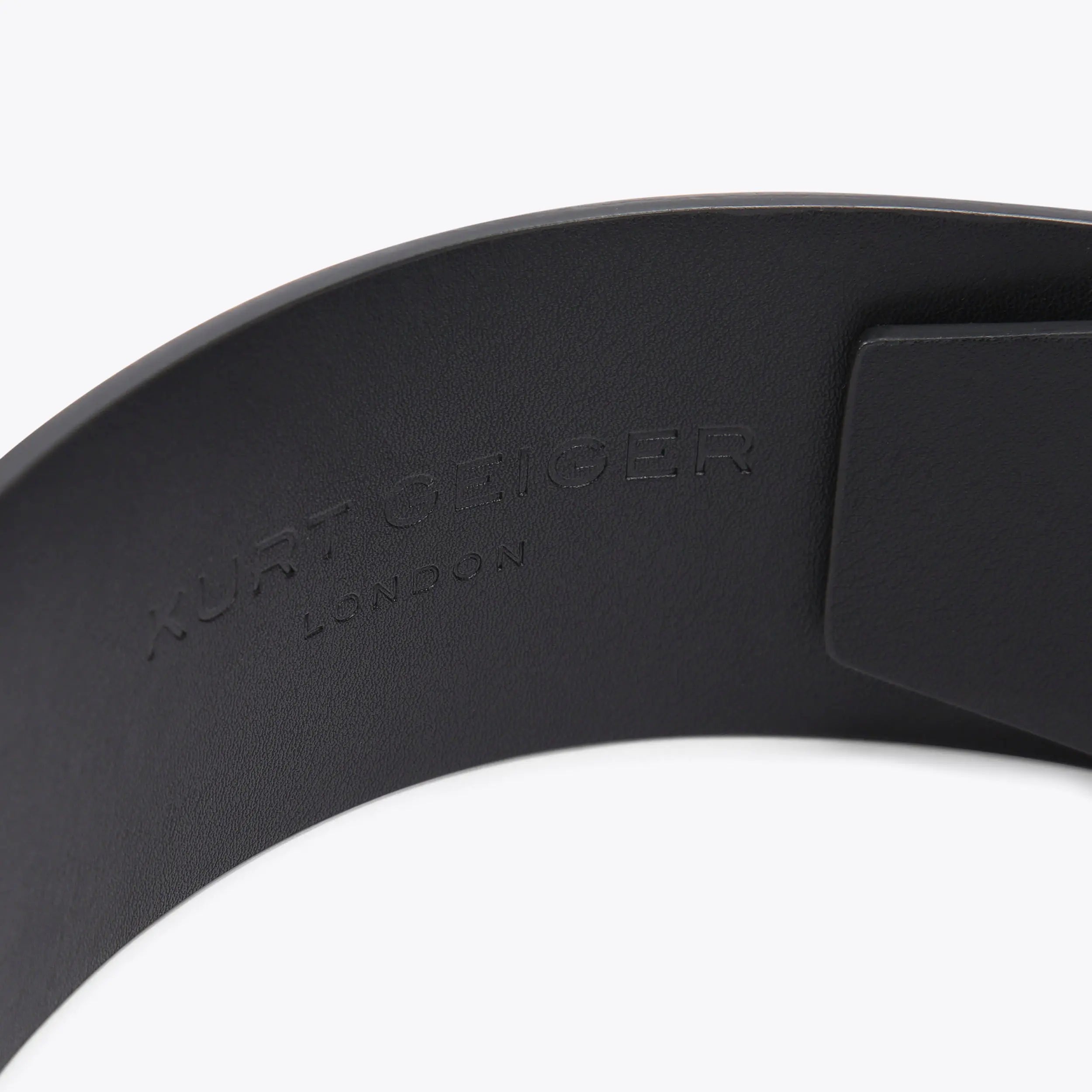 This Mayfair 60 Belt features a smooth black leather belt. The antiqued brass eagle head features crystals and fastens the belt.