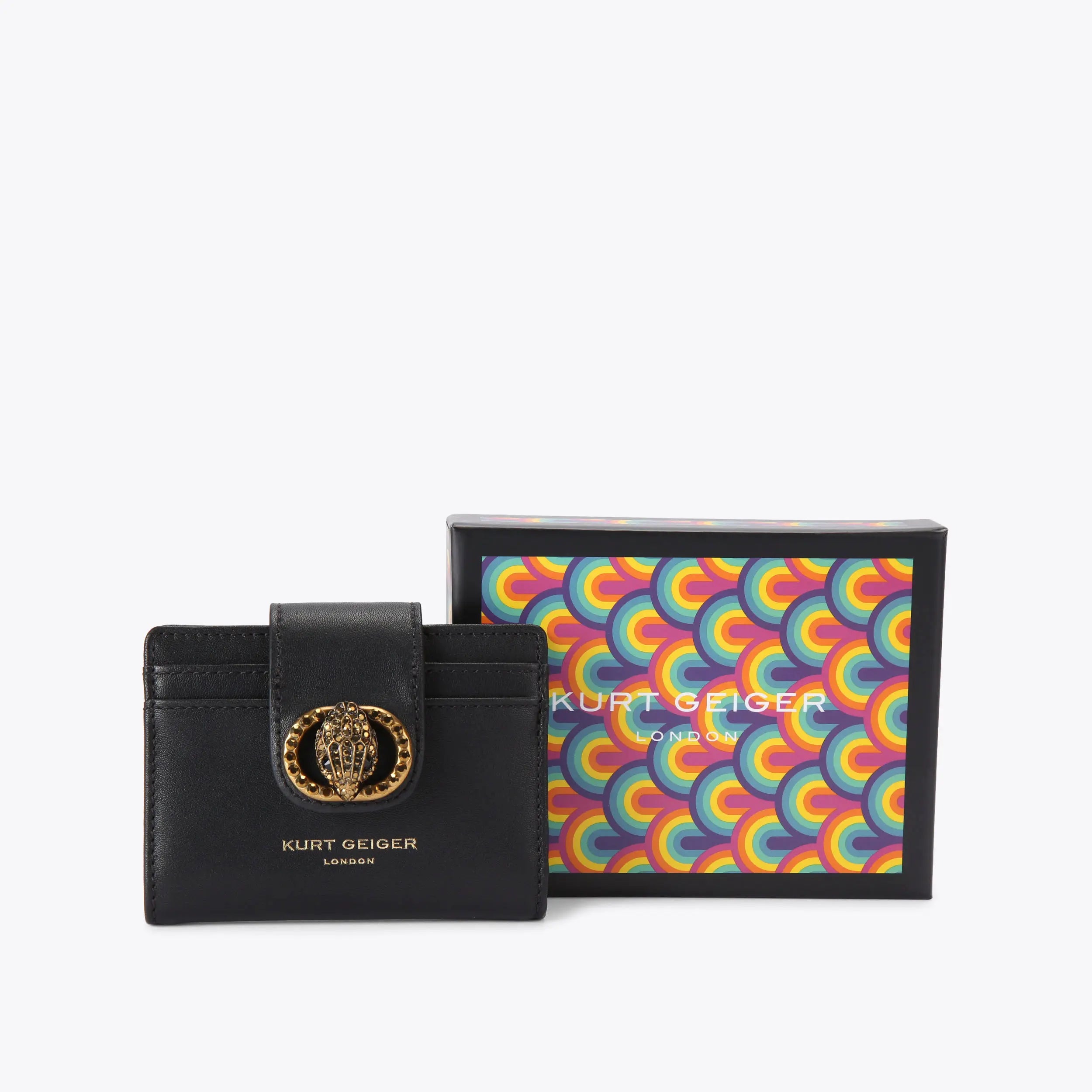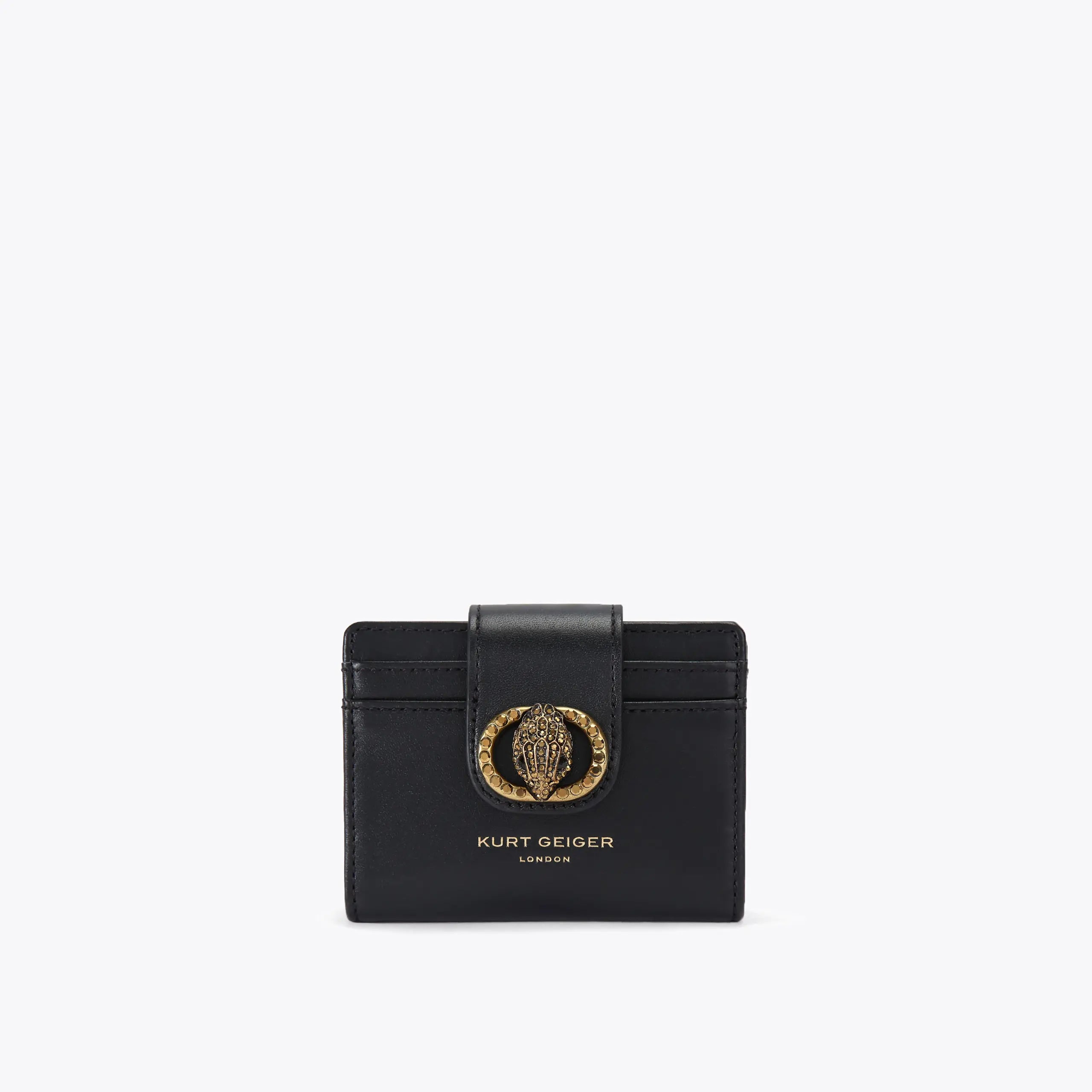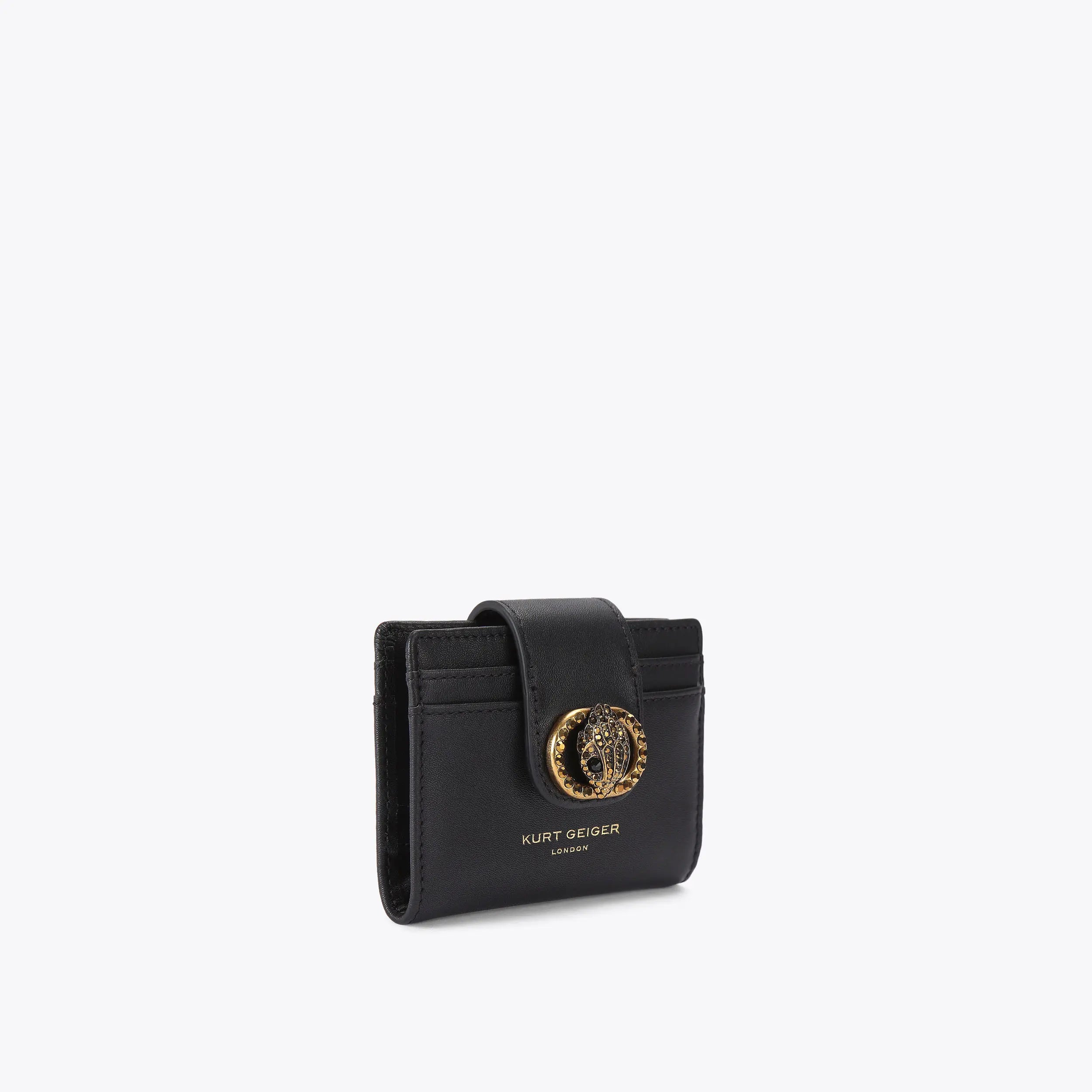 This Chelsea Card Wallet is crafted from a black leather. There are four card slots on the exterior and a flap closure. There is an antiqued brass oval trim and eagle head embellished with crystals on the flap closure.