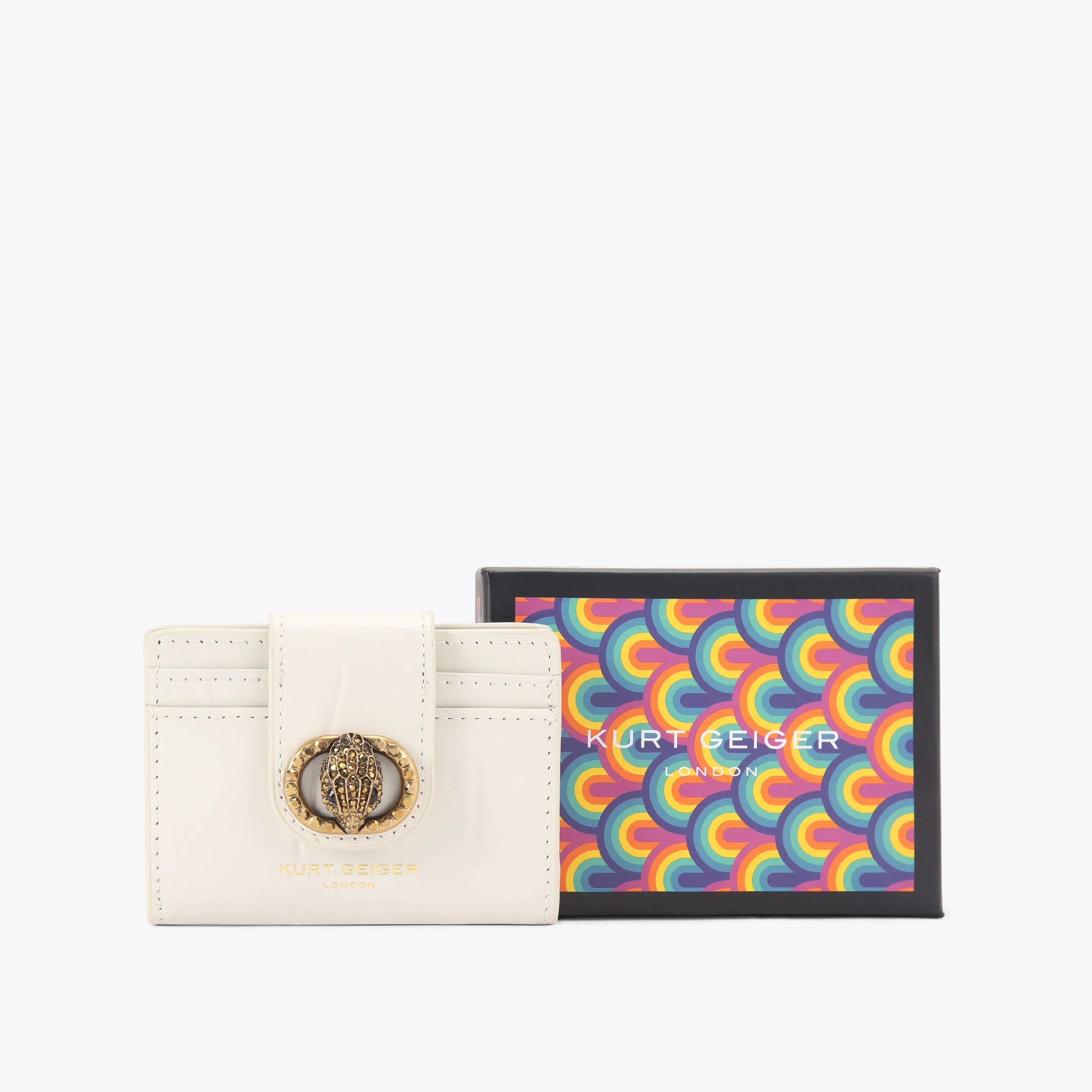 This Chelsea Card Wallet is crafted from a soft croc embossed bone leather. There are four card slots on the exterior and a flap closure. There is an antiqued brass oval trim and eagle head embellished with crystals on the flap closure.