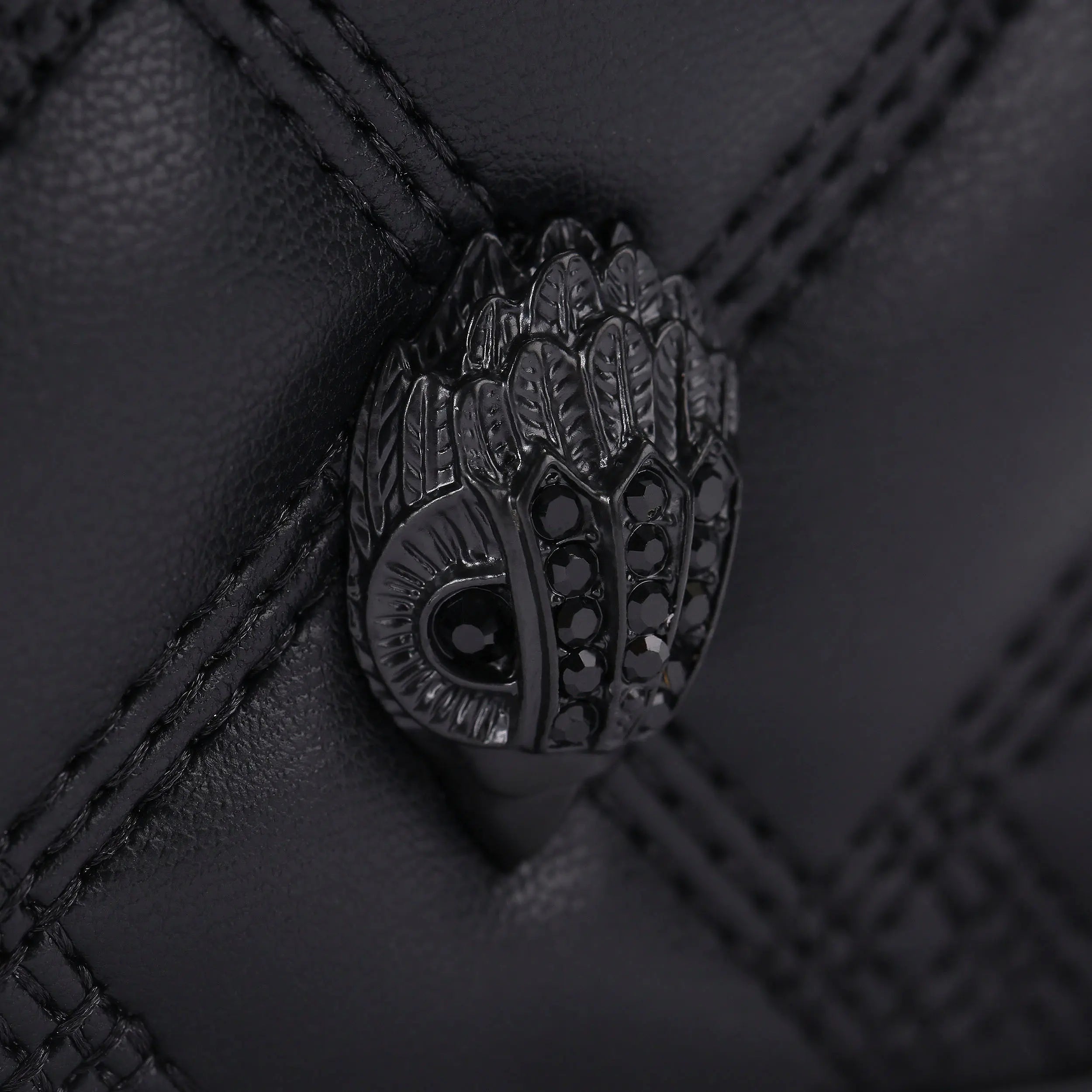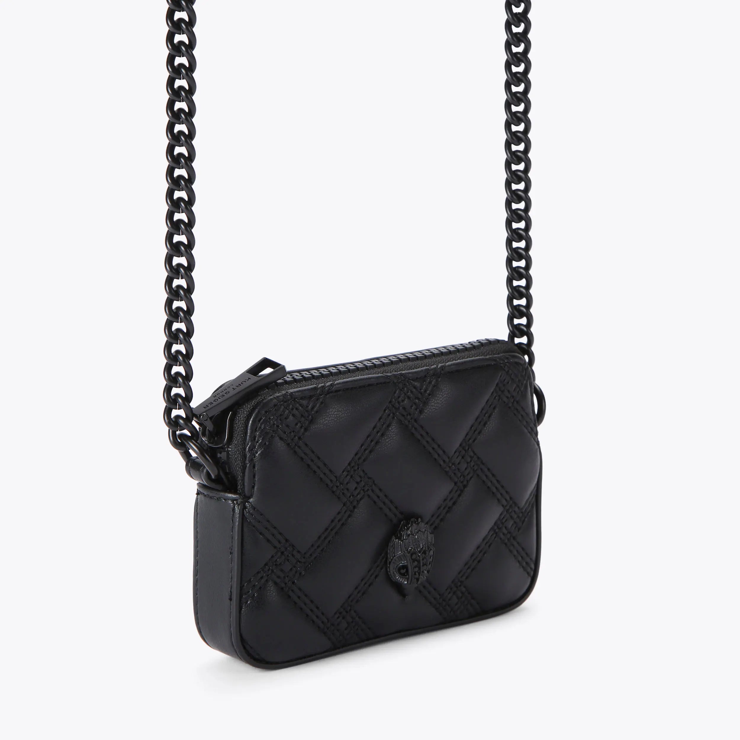 This Micro Kensington Camera purse with signature parquet padded overstitch quilt with three rows of weave pattern on the front. There is also a black eagle head with crystals sitting on the front.