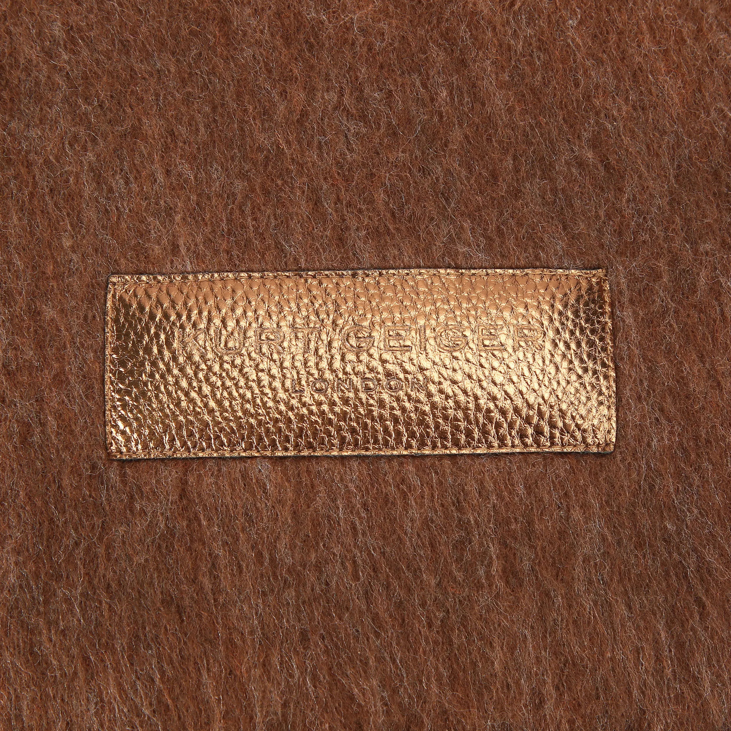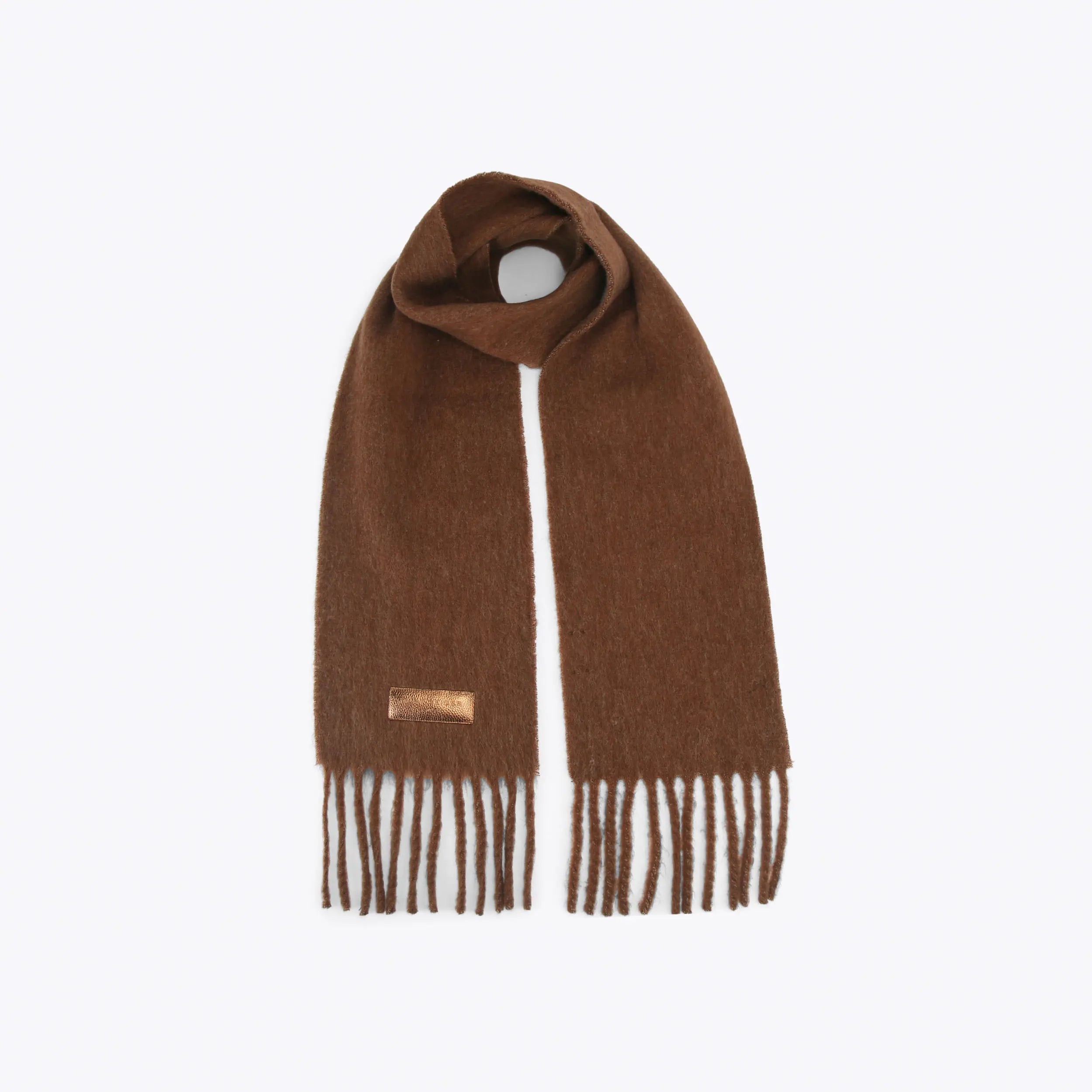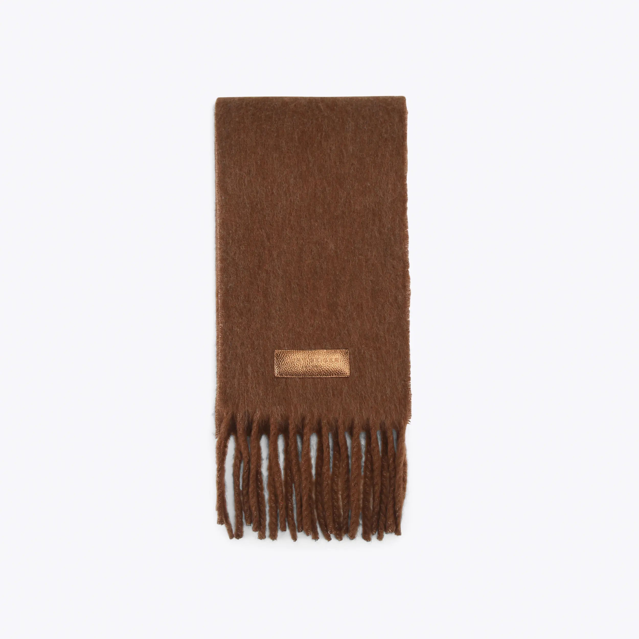 This Small Yarndye Scarf is knitted in a brown wool blend fabric. Each end features statement tassels and there is a pebble grained bronze branded patch at one end.