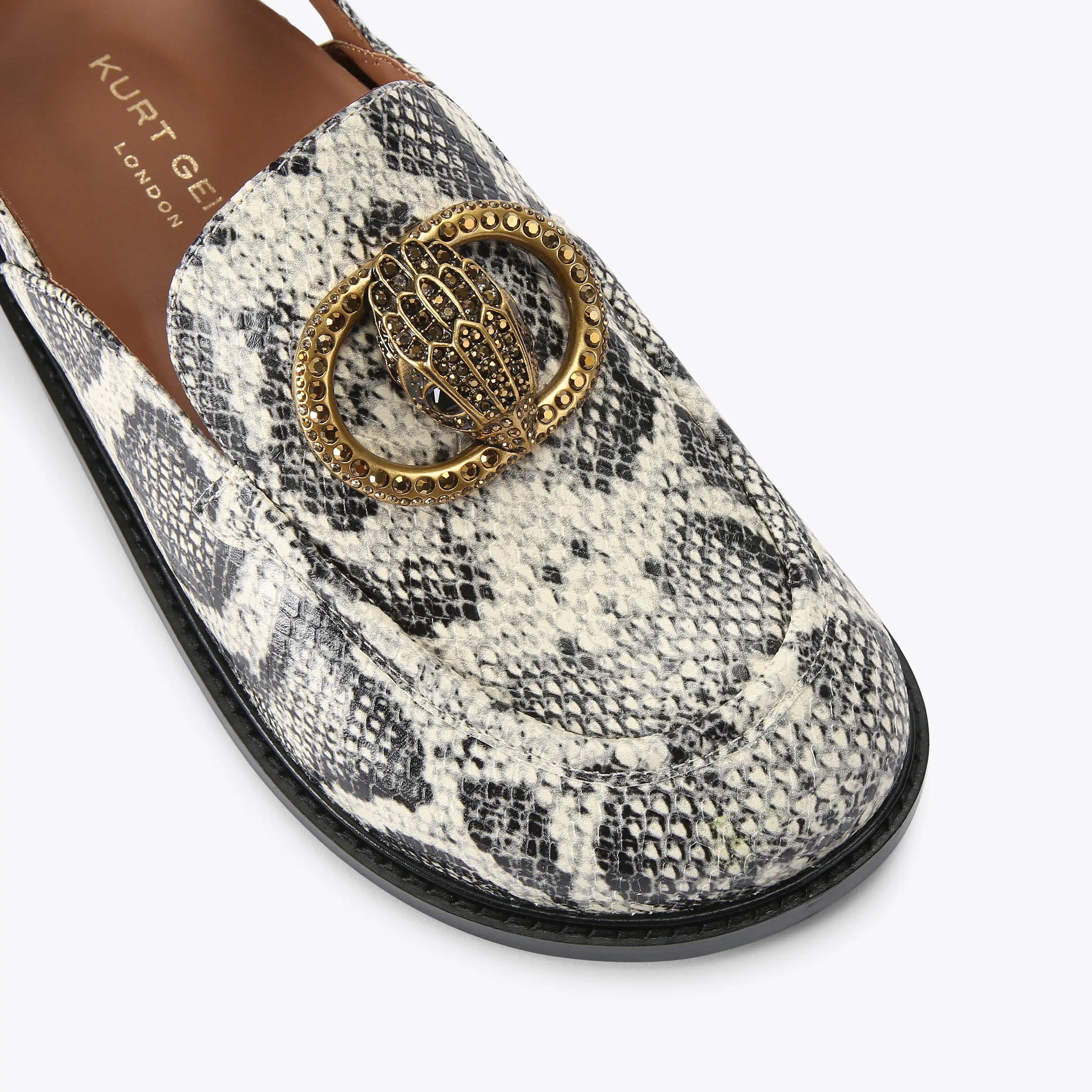This Chelsea Mule Slingback sandal features a snake printed shoe with rounded toe. There is an antiqued brass oval trim with eagle head at the centre of the vamp.