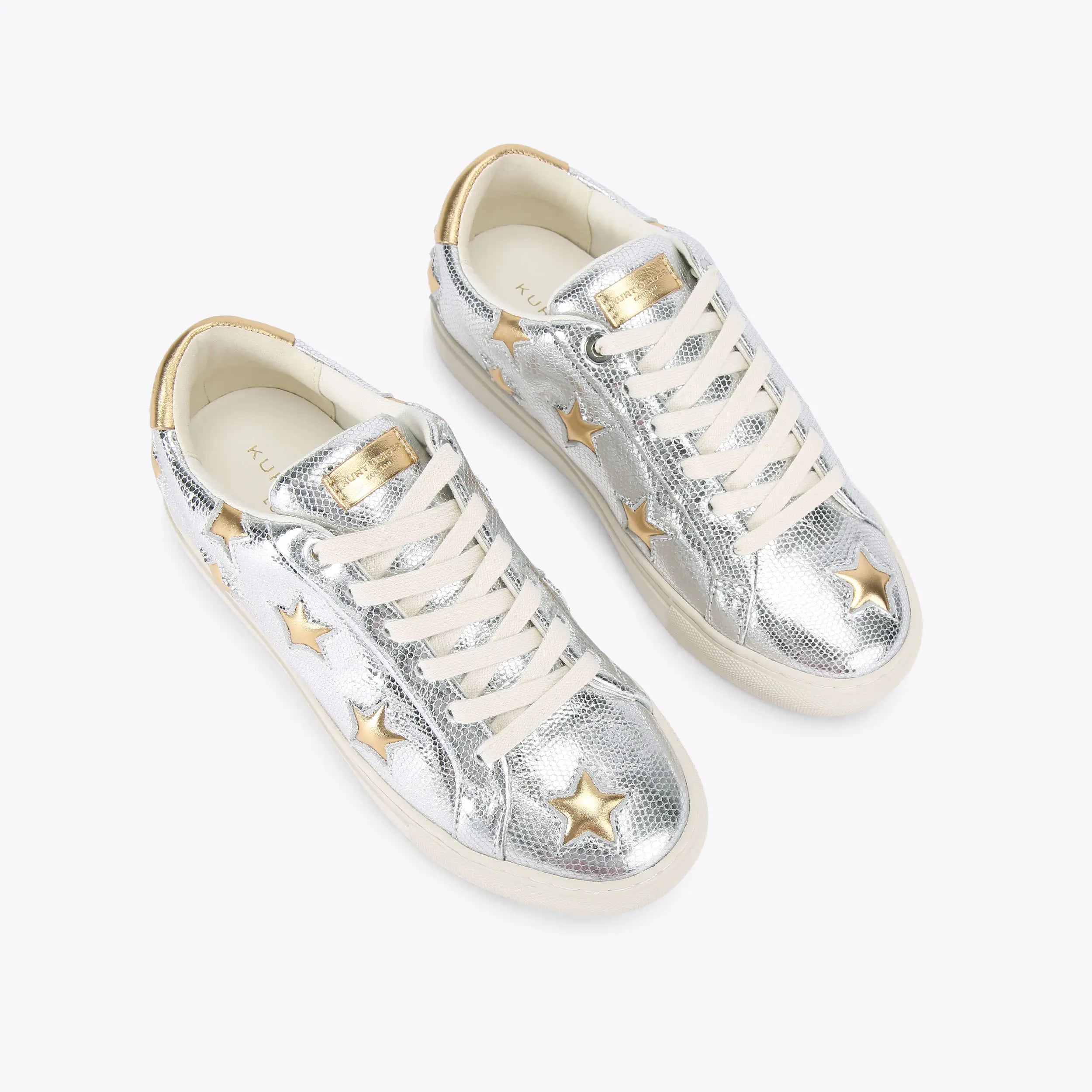 The Lane Star sneaker is crafted from a metallic snake embossed leather with gold metallic leather cut out stars. There is a gold branded patch on the tongue.
