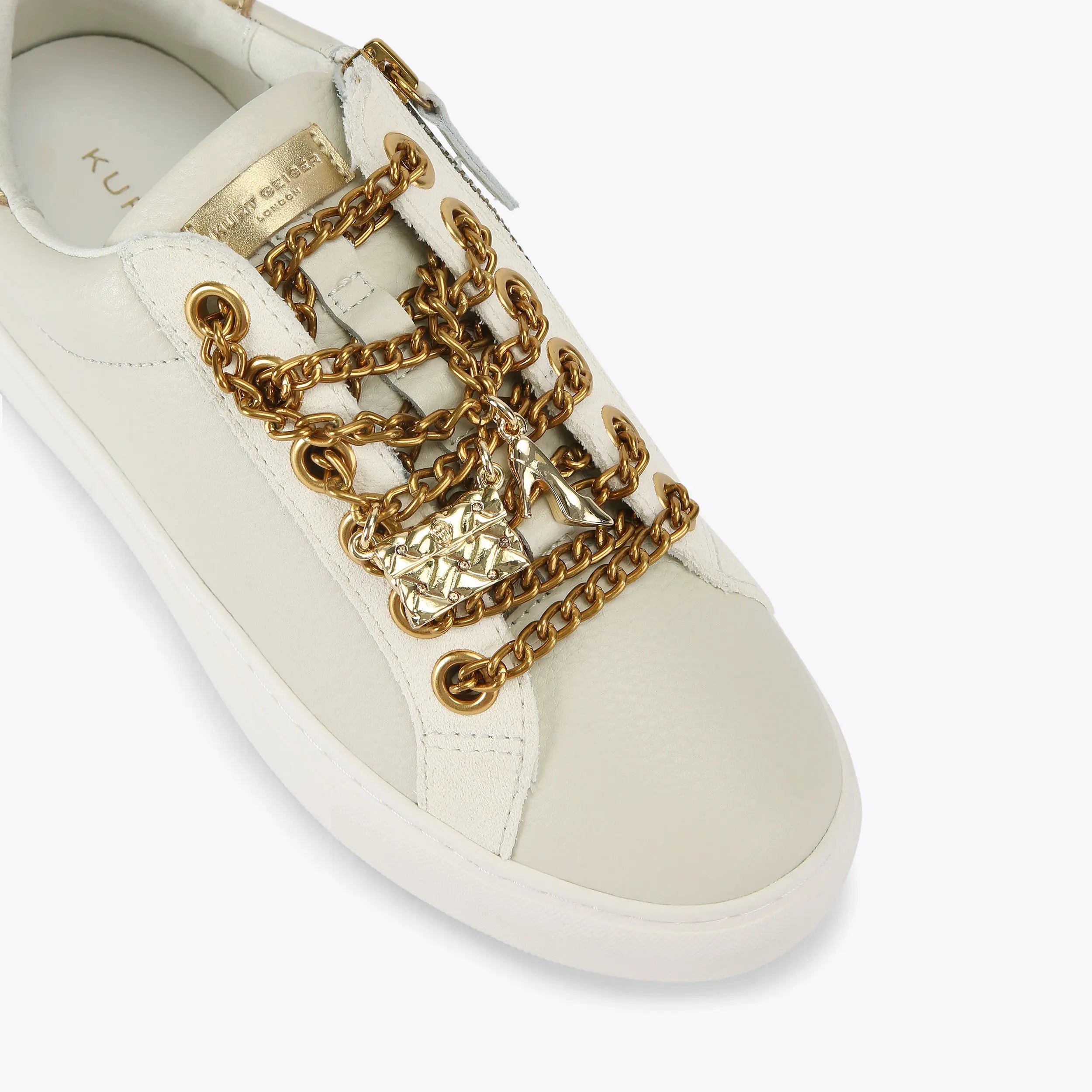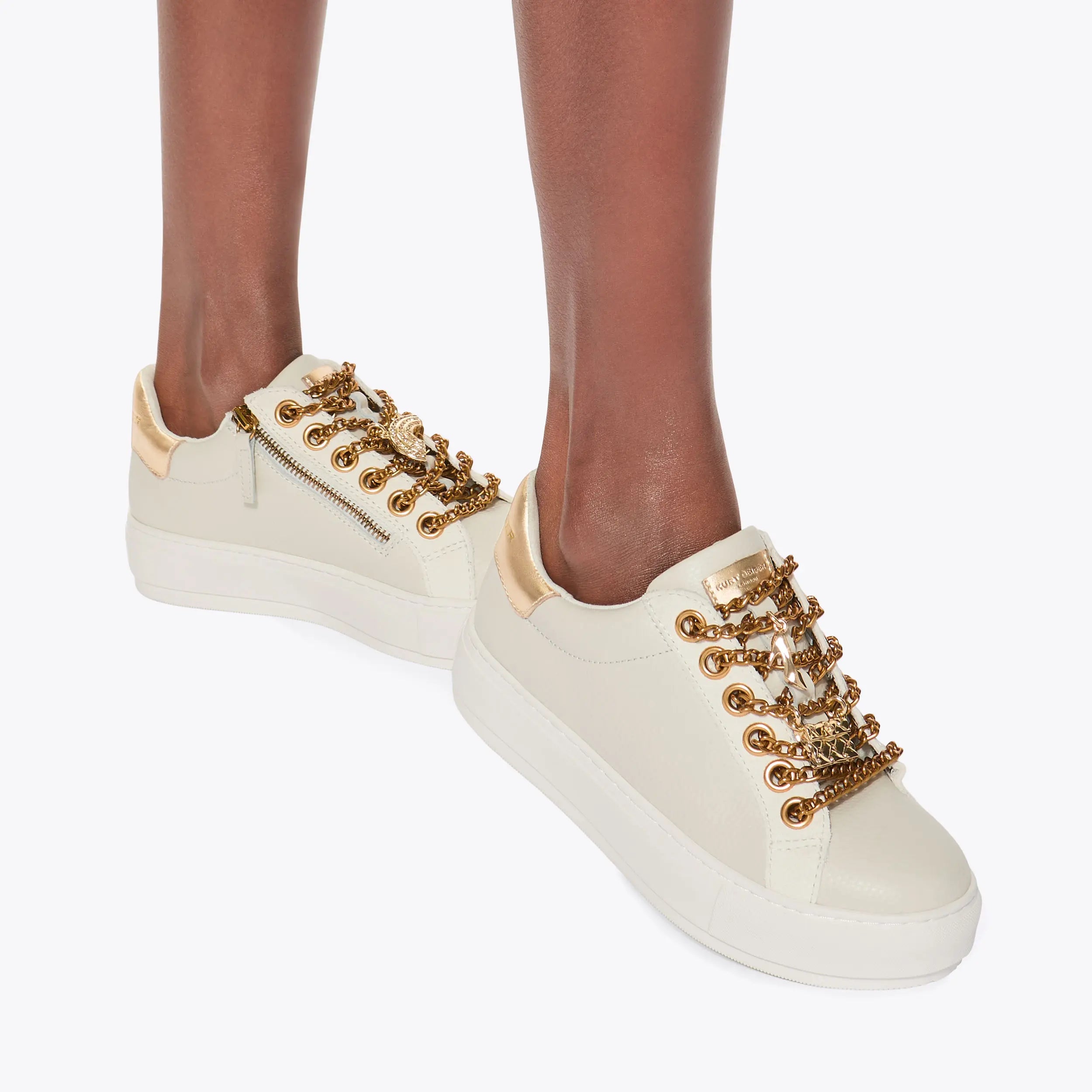 The Laney sneaker is crafted in a bone leather with slight texture. There are antiqued bras feature laces with both a mini Kensington charm and high heel. There is also a zip at the outside eye stay.