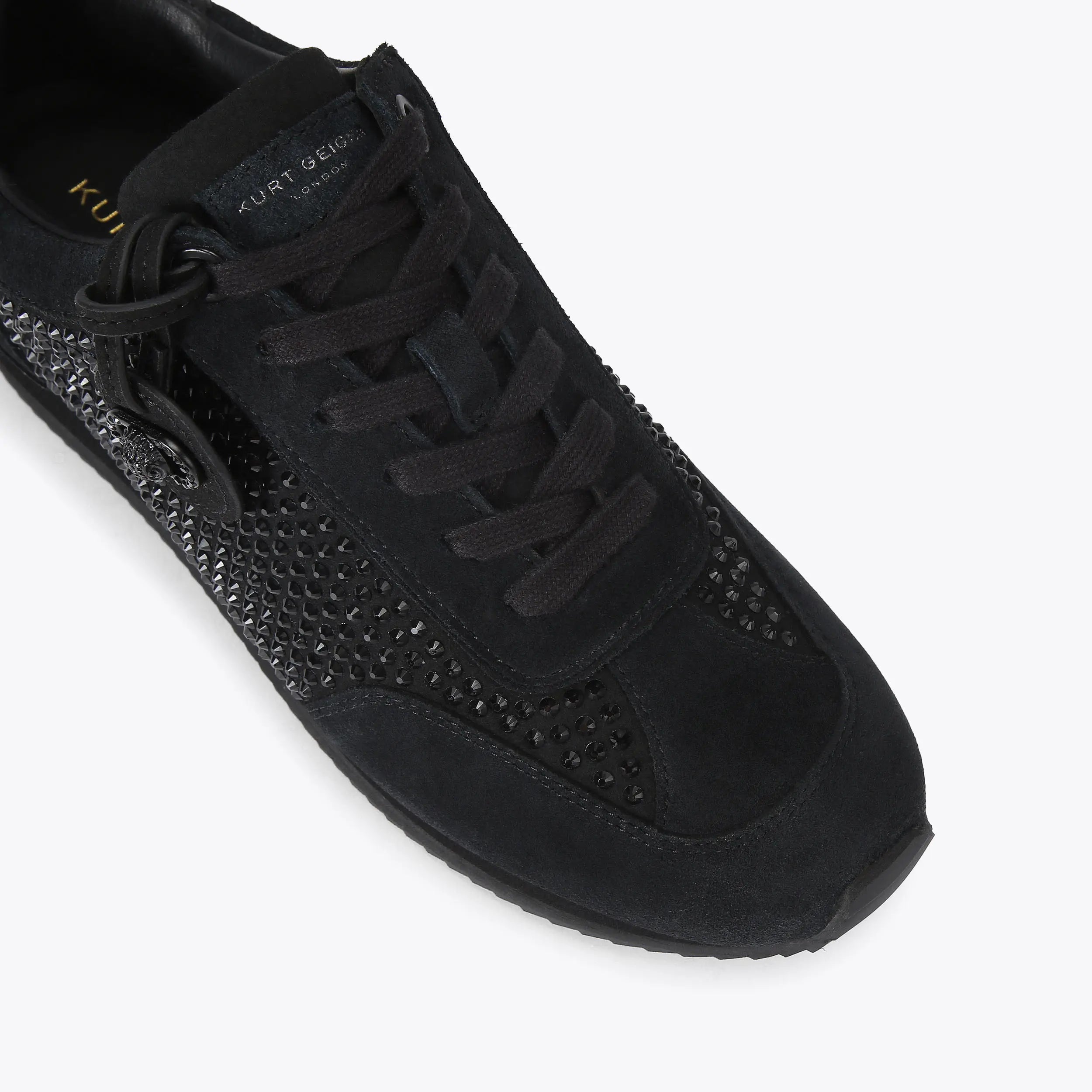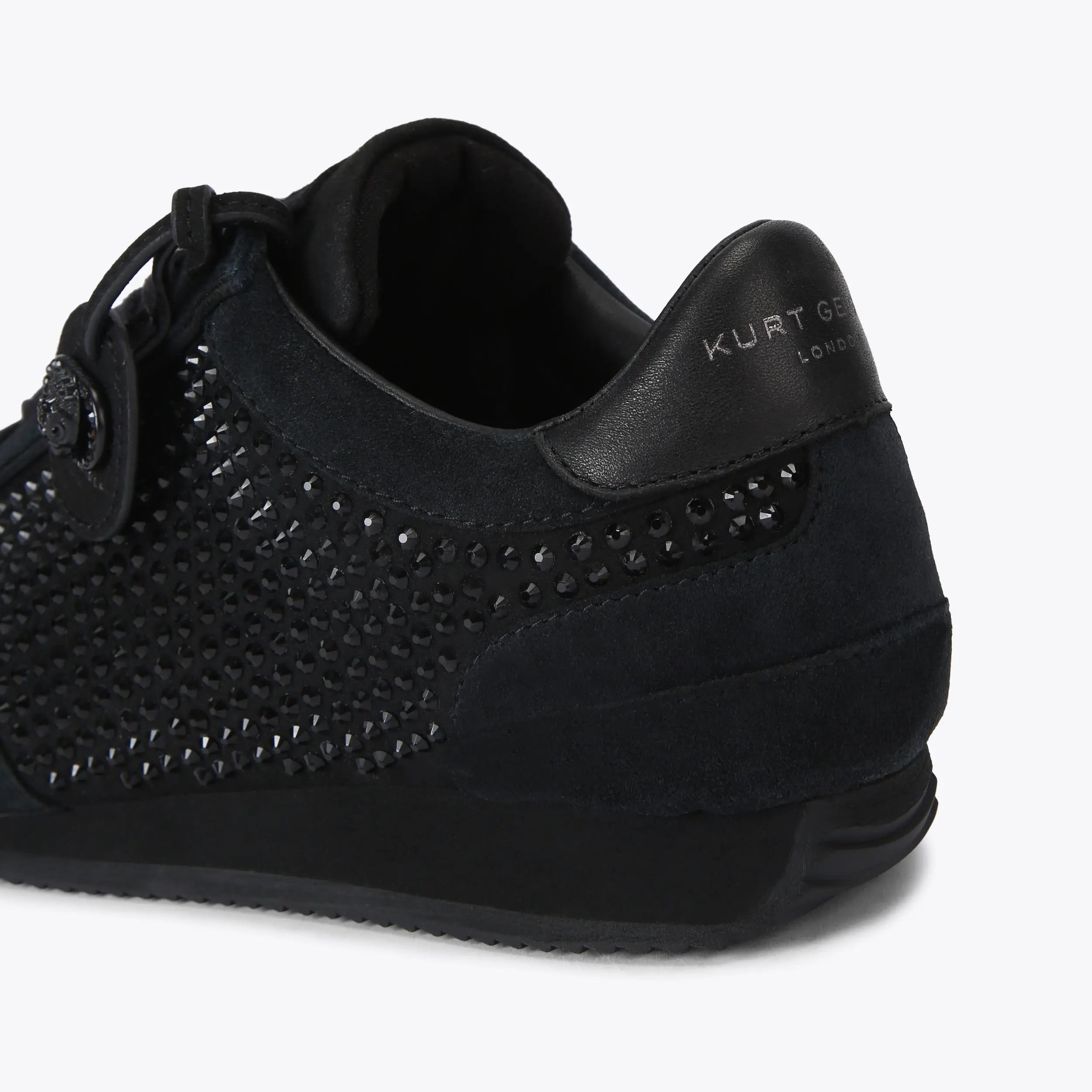 This pair of Chelsea Drench tag sneakers feature a black fabric upper which is embellished with black crystals. There is a small black oval trim with eagle head at the centre sat on the lace tag.