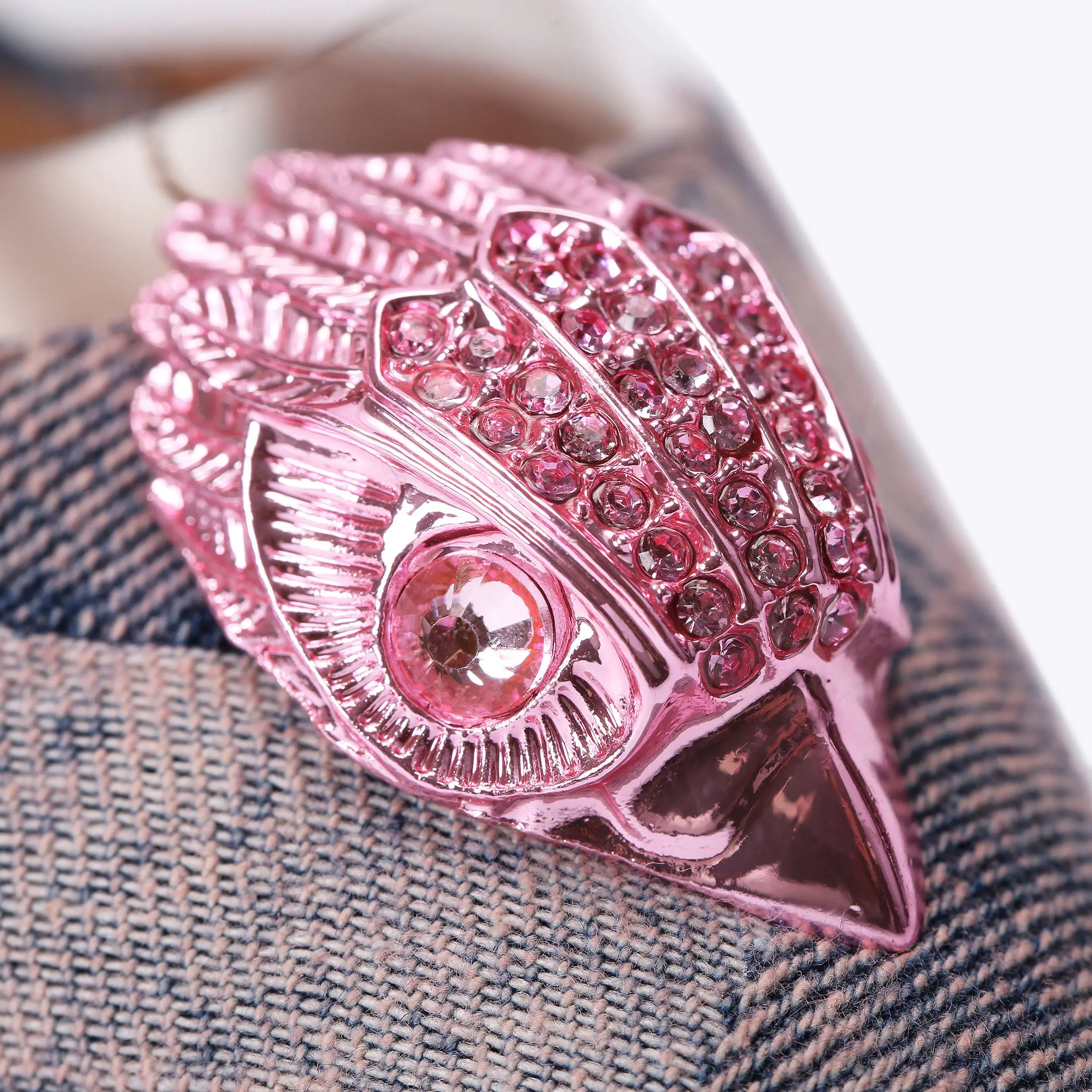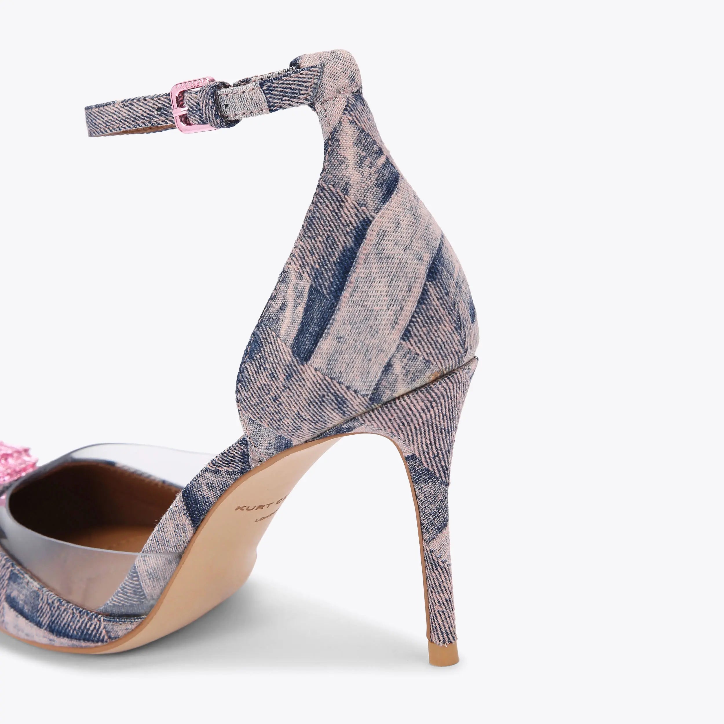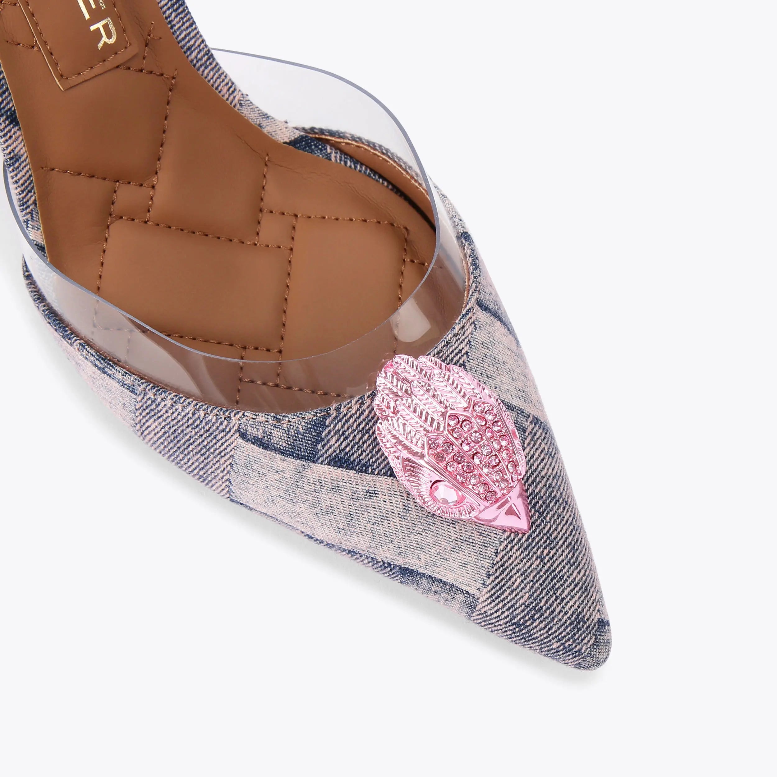 This Belgravia Vinyl High heel features a pink bleached woven denim upper with elongated pointed toe, There is a clear vinyl panel at the toe as well as a metallic pink eagle head.
