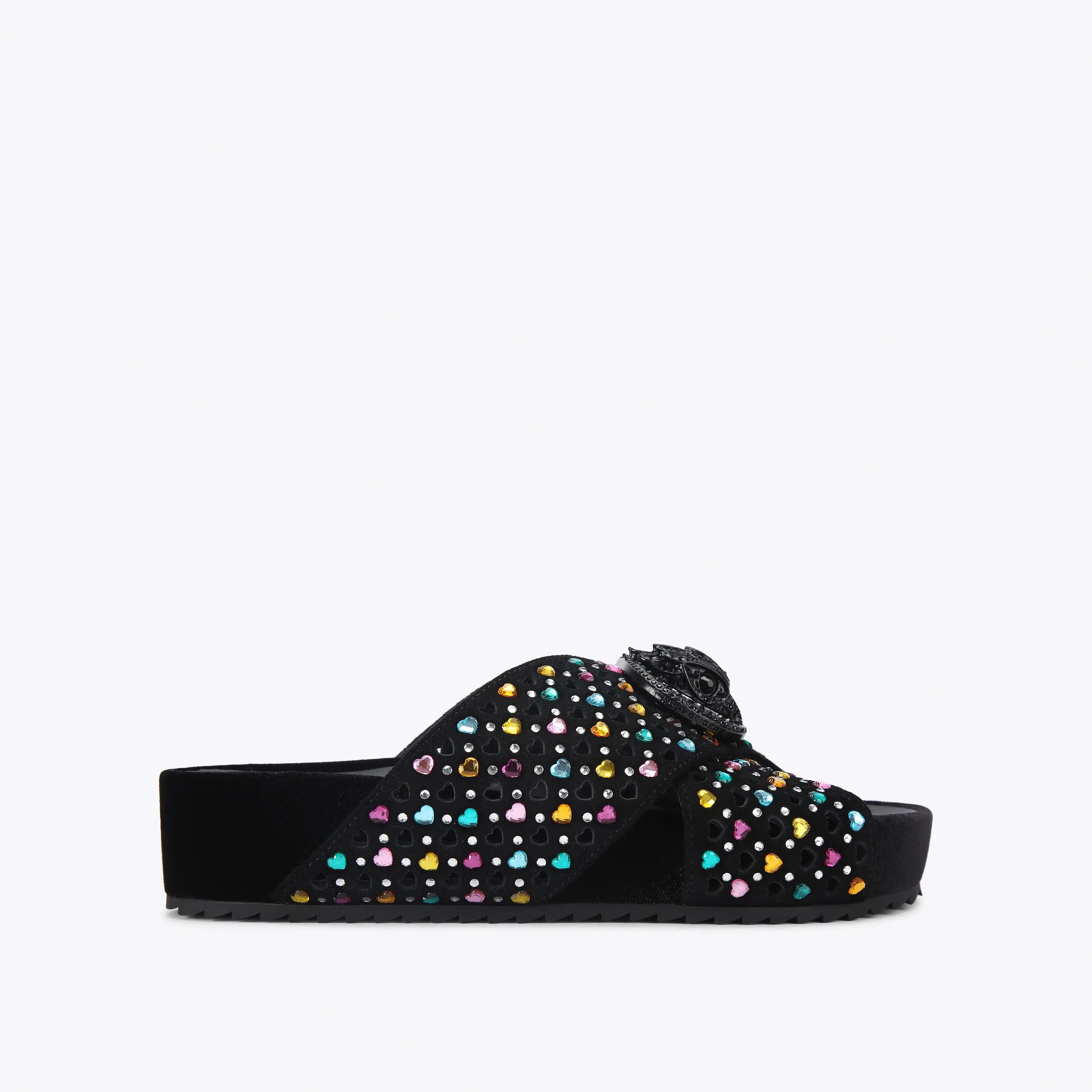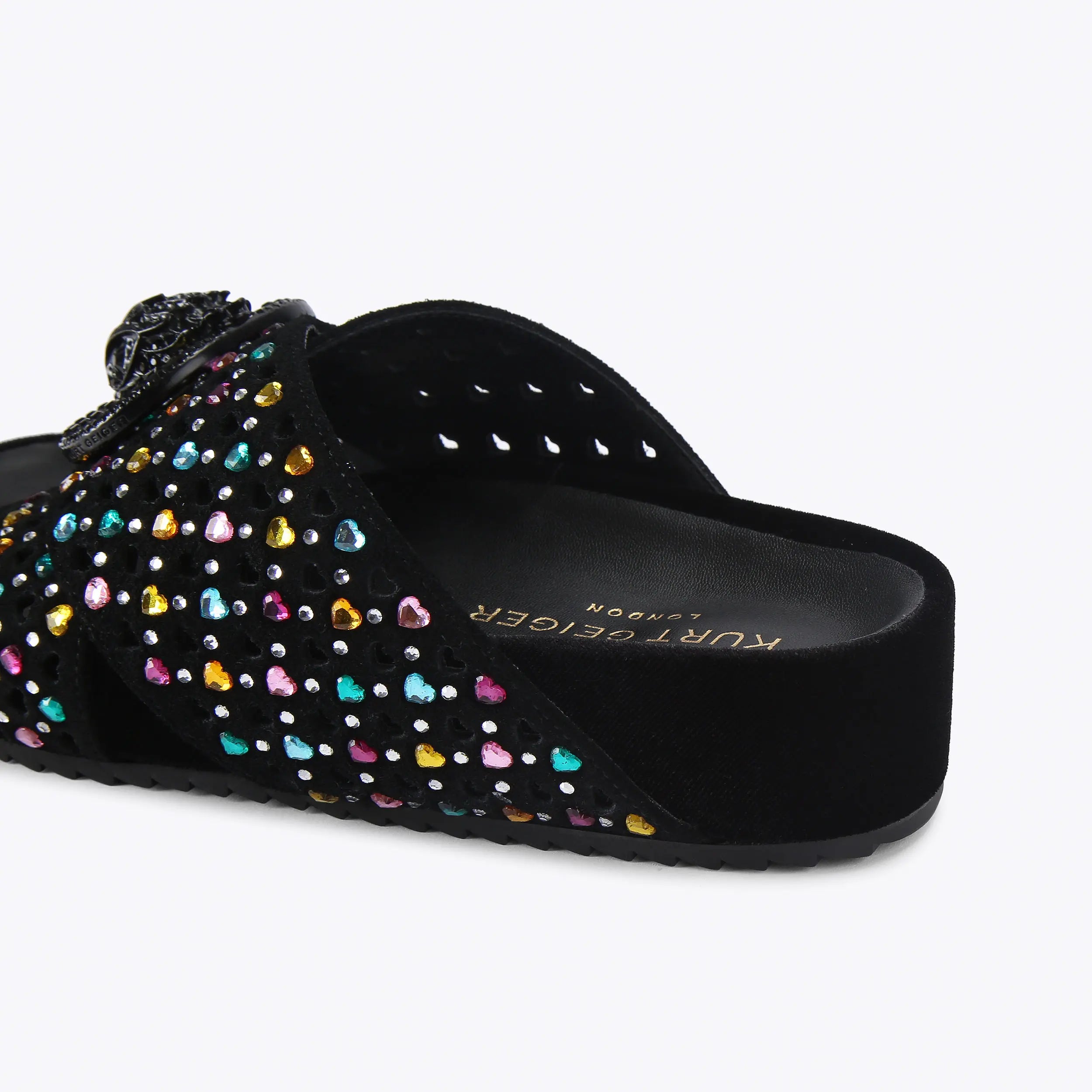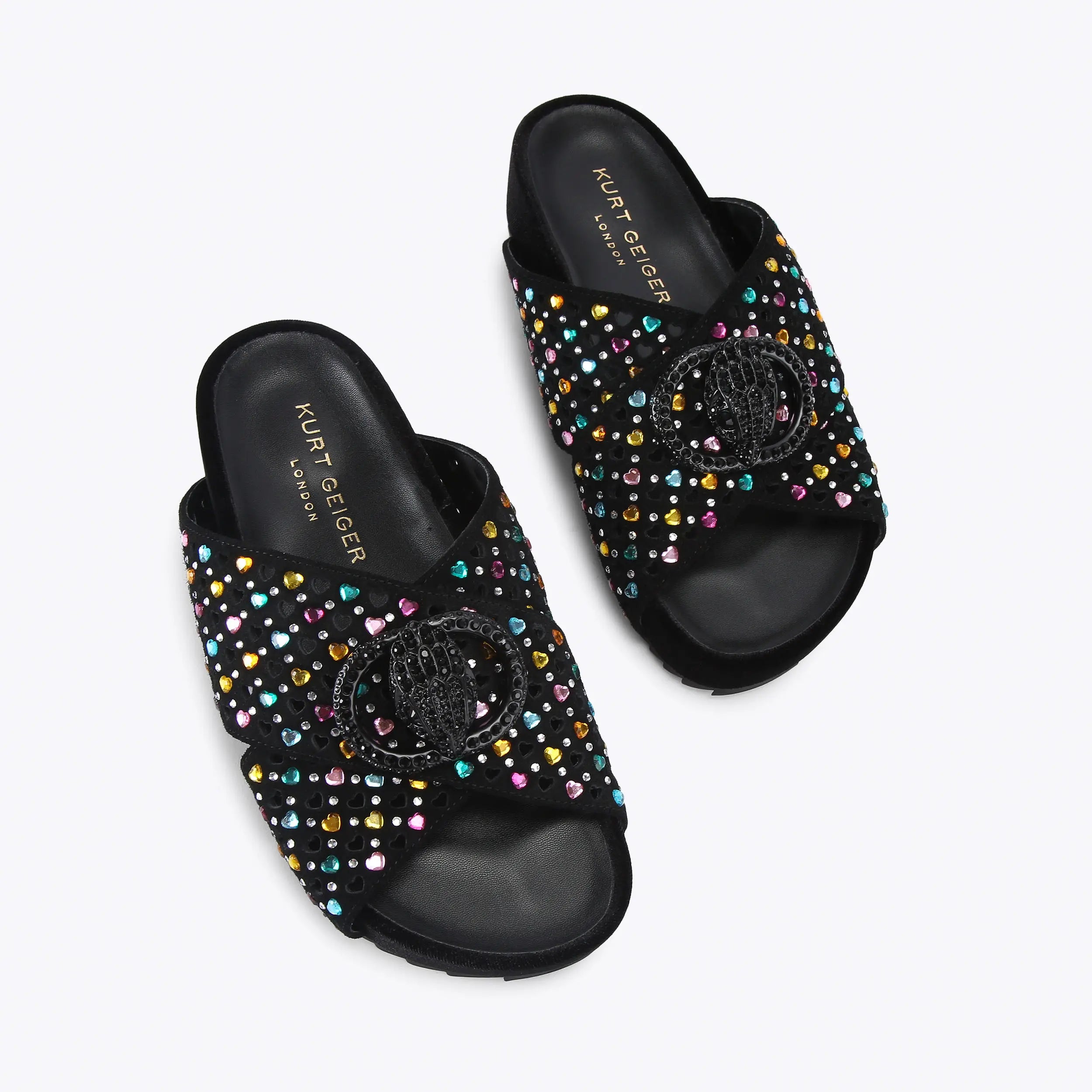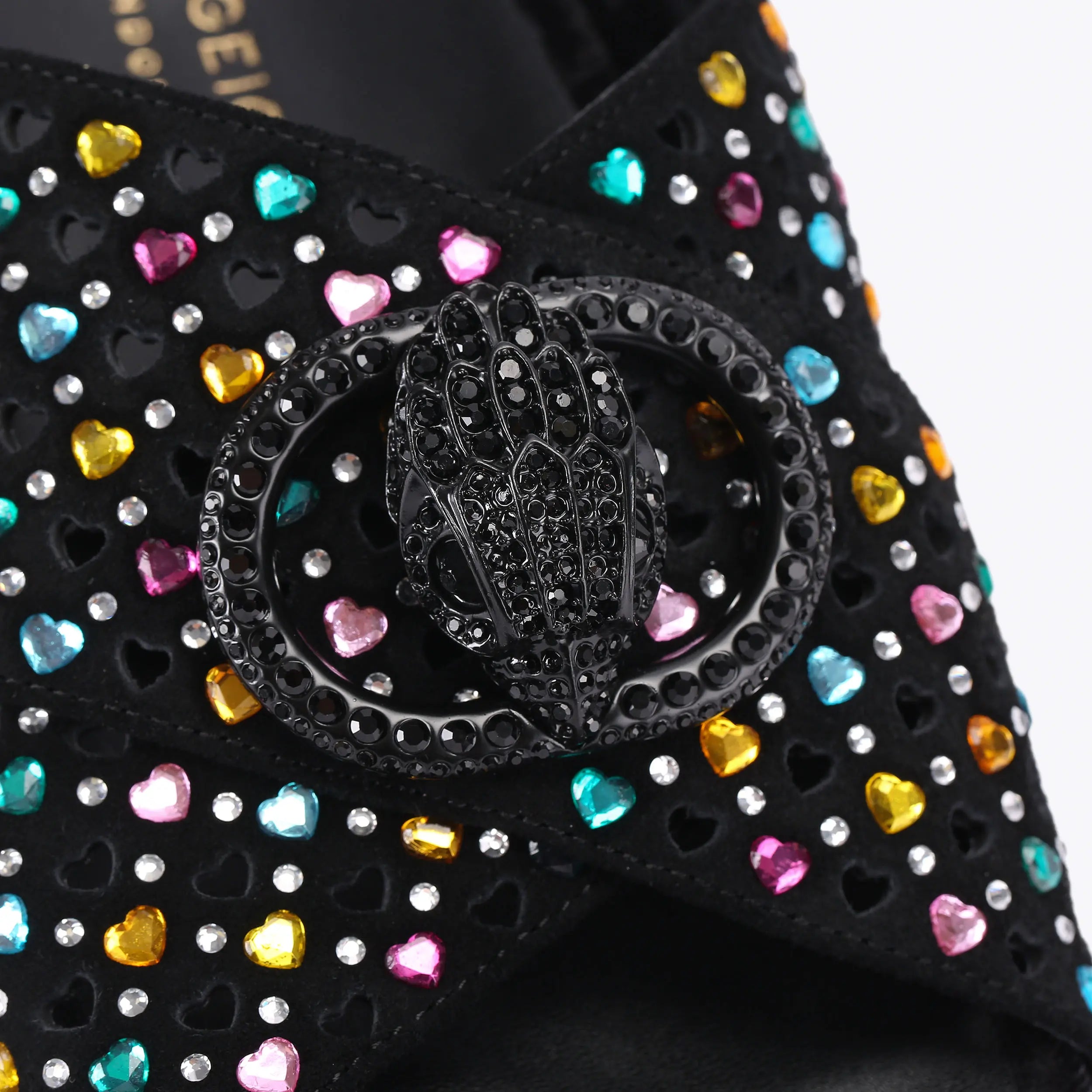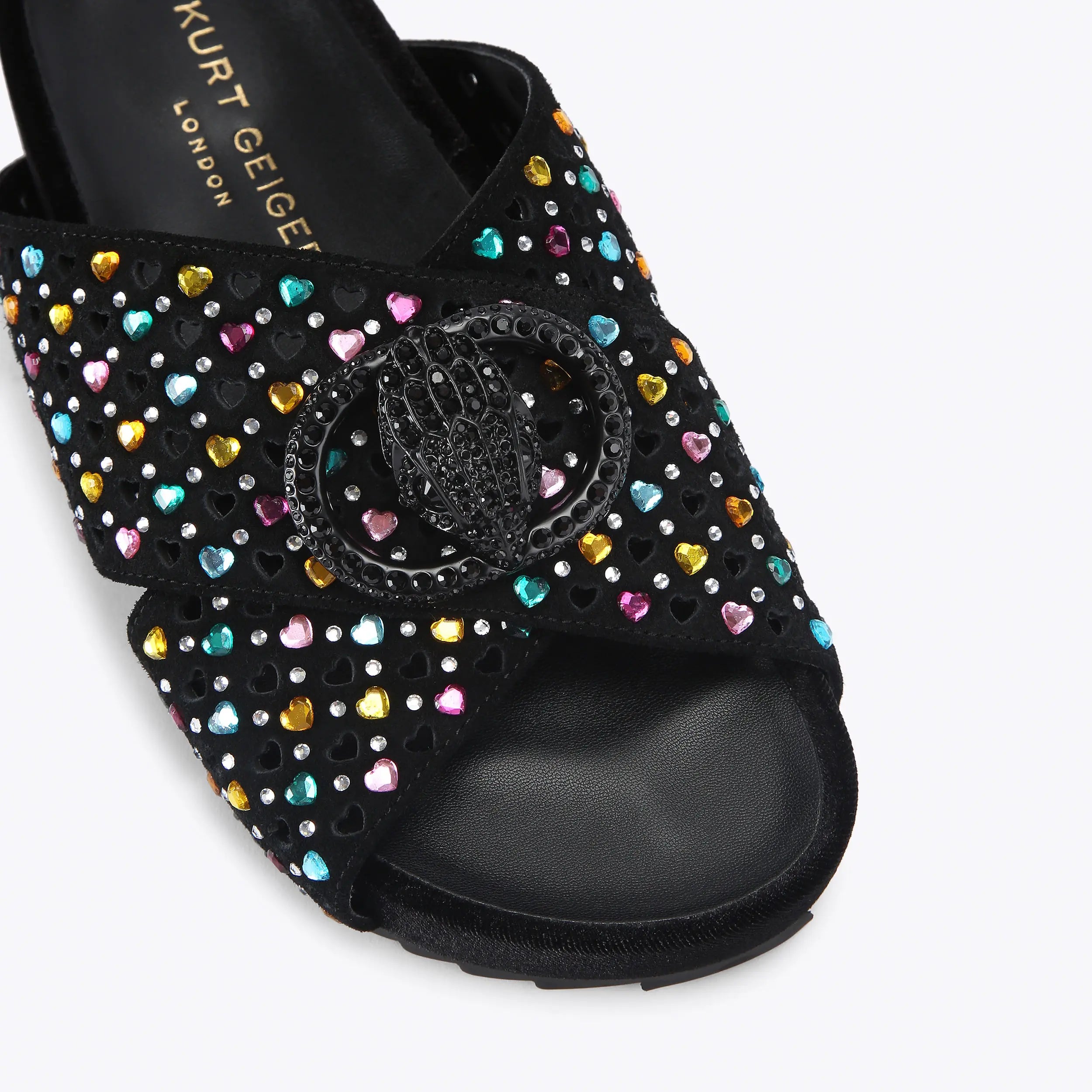 This Chelsea Drench Cross Strap Sandal features two black suede straps which are embellished with multi-colour heart crystals. There is a black oval trim and black eagle head sat on top of the straps.
