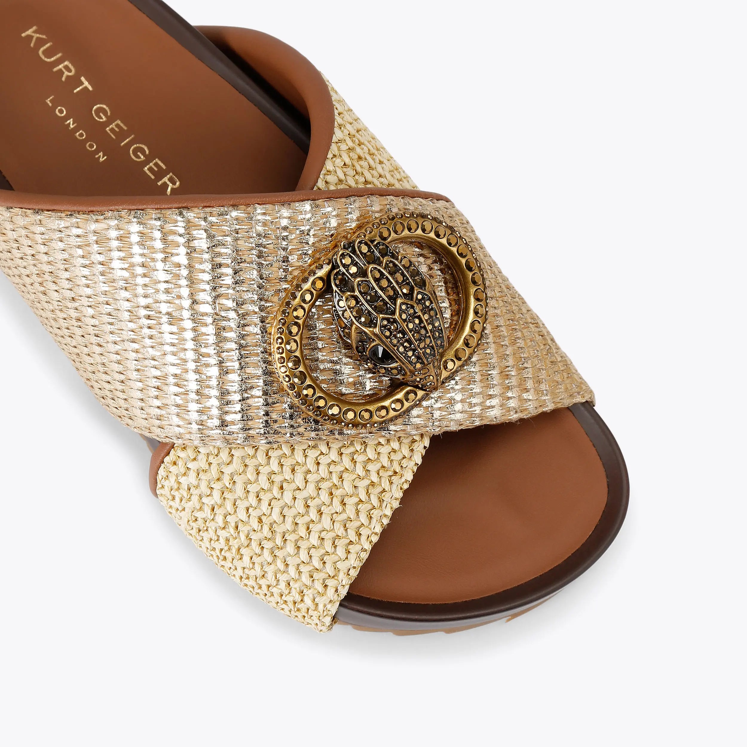 This Chelsea Drench Cross Strap Sandal features two rattan fabric straps with one having gold foil running through. There is an antiqued brass oval trim and eagle head sat on top of the straps.