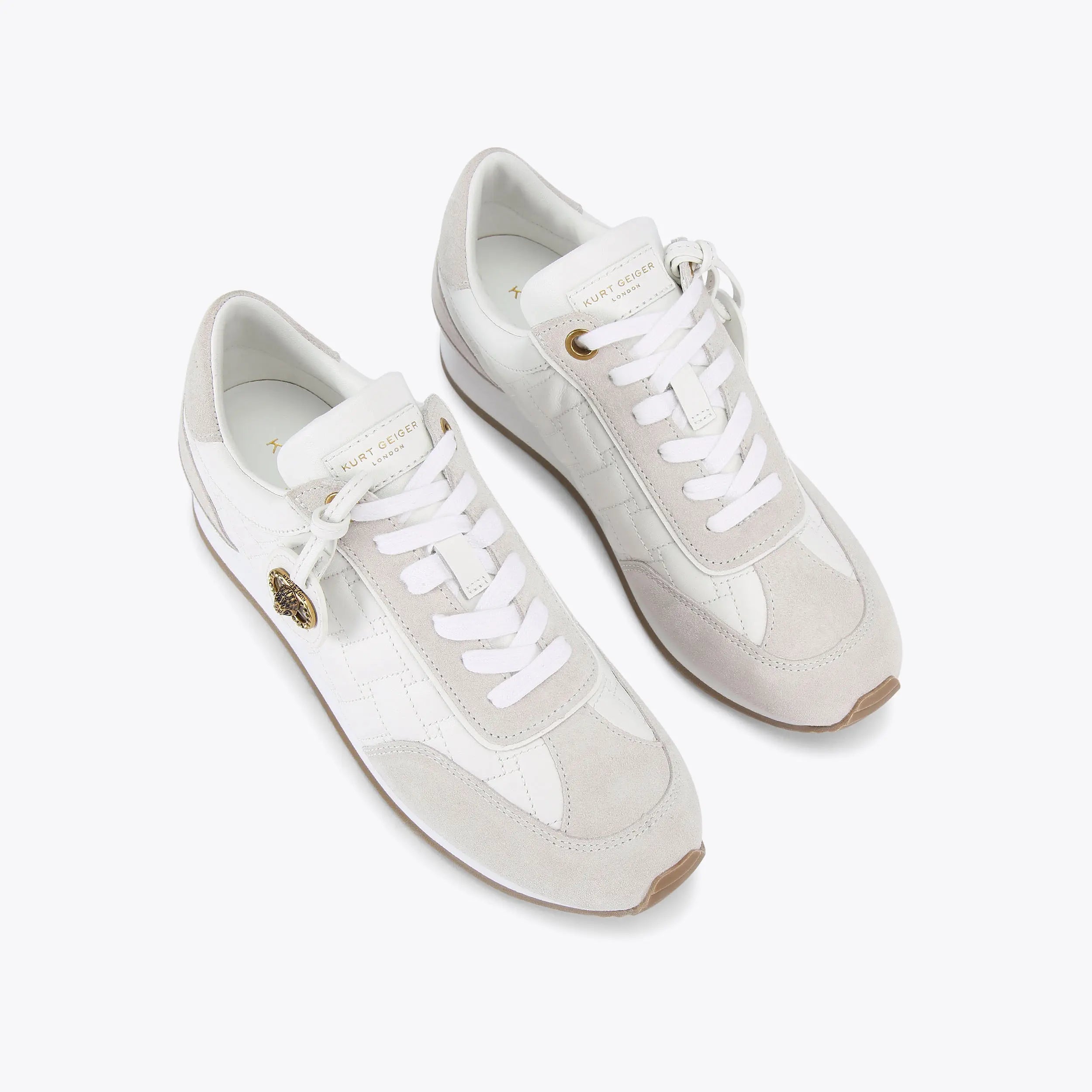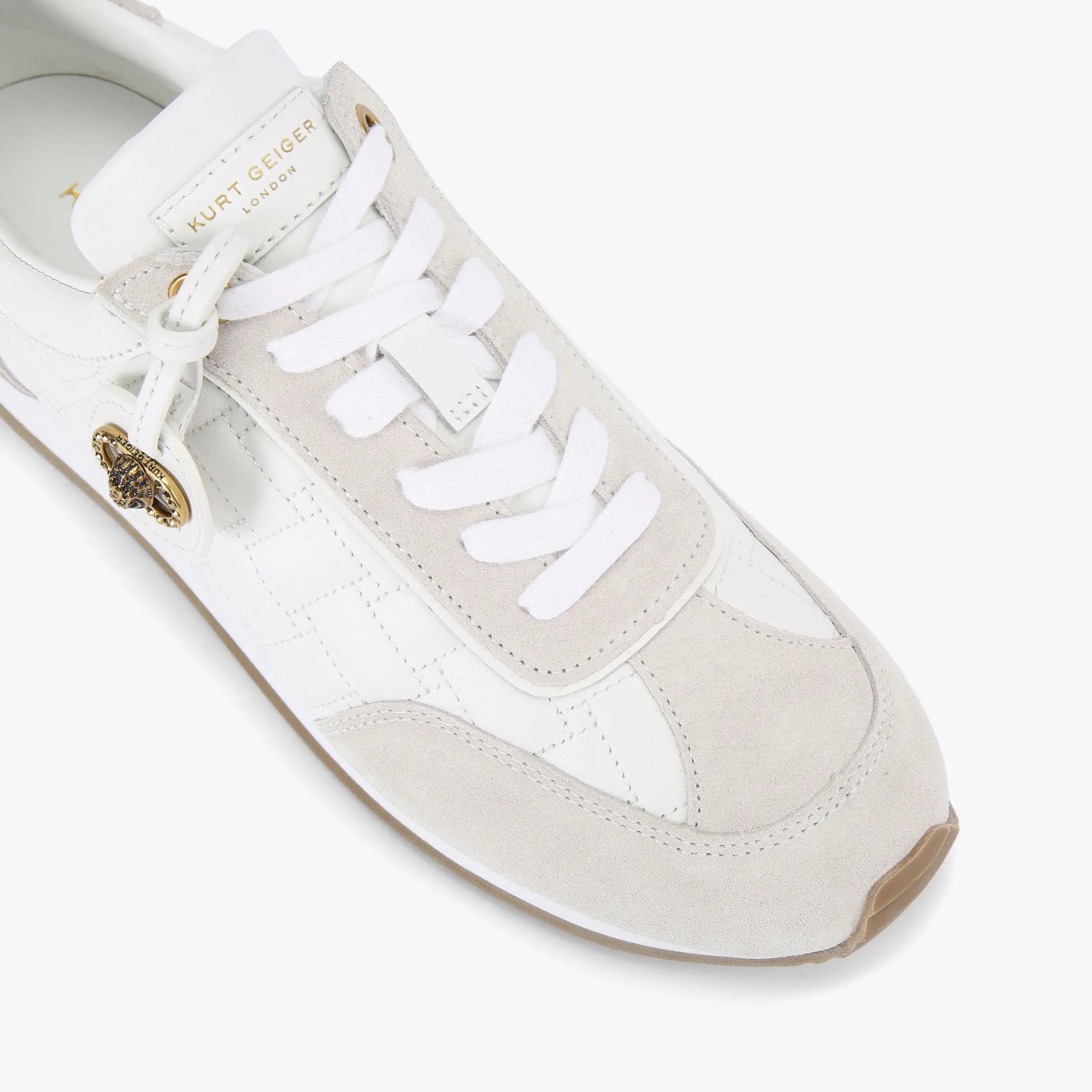 This pair of Chelsea Drench tag sneakers feature a white fabric upper with overstitch quilting detail. There is a small antiqued brass oval trim with eagle head at the centre sat on the lace tag.