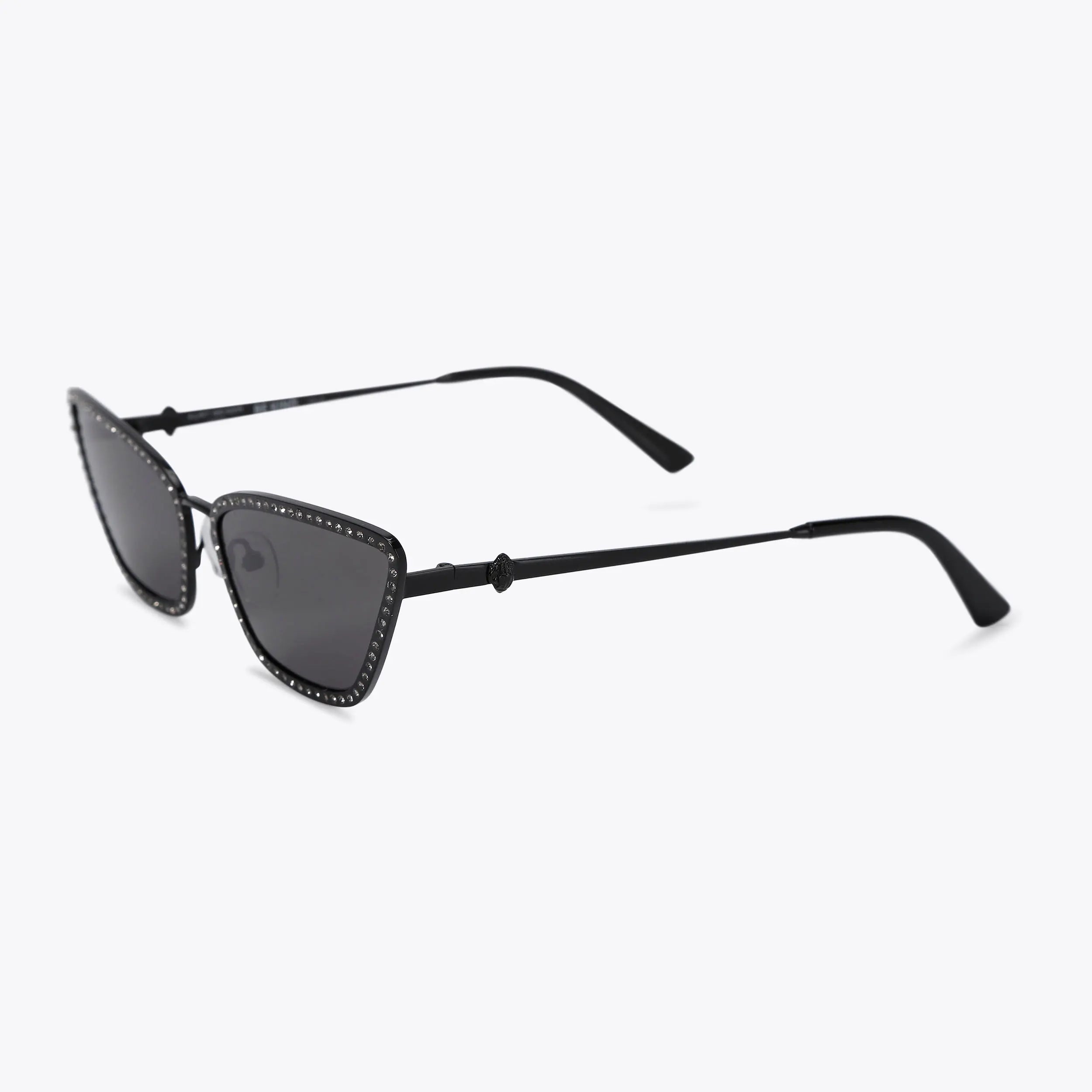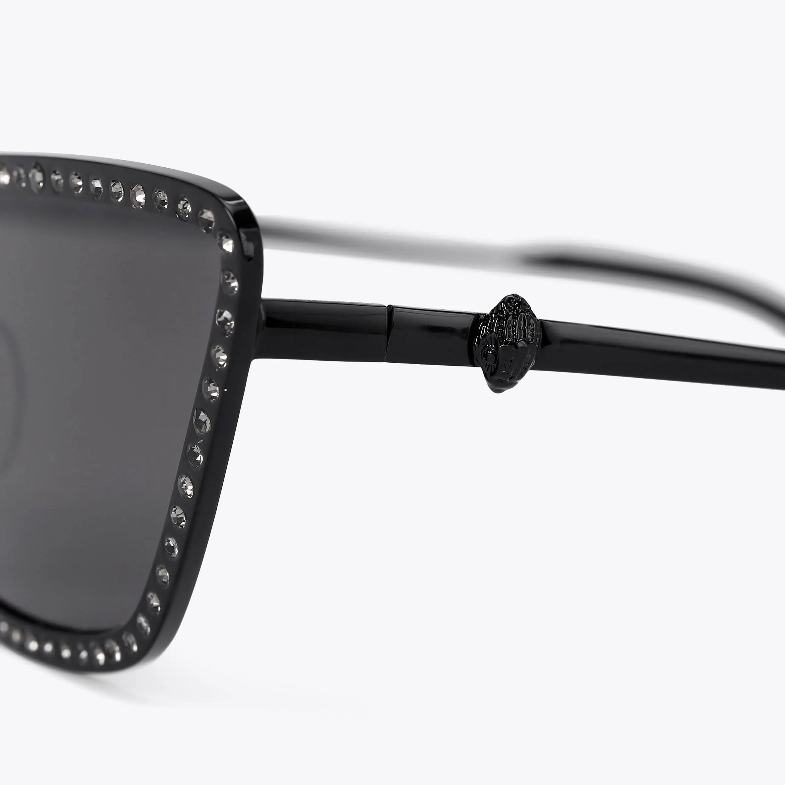 This pair of Small Shoreditch Cat Eye sunglasses arrive with crystal embellishment around the sleek cat eye shape lenses. There is a metal bridge across the nose. Each arm is embellished with a black eagle head.