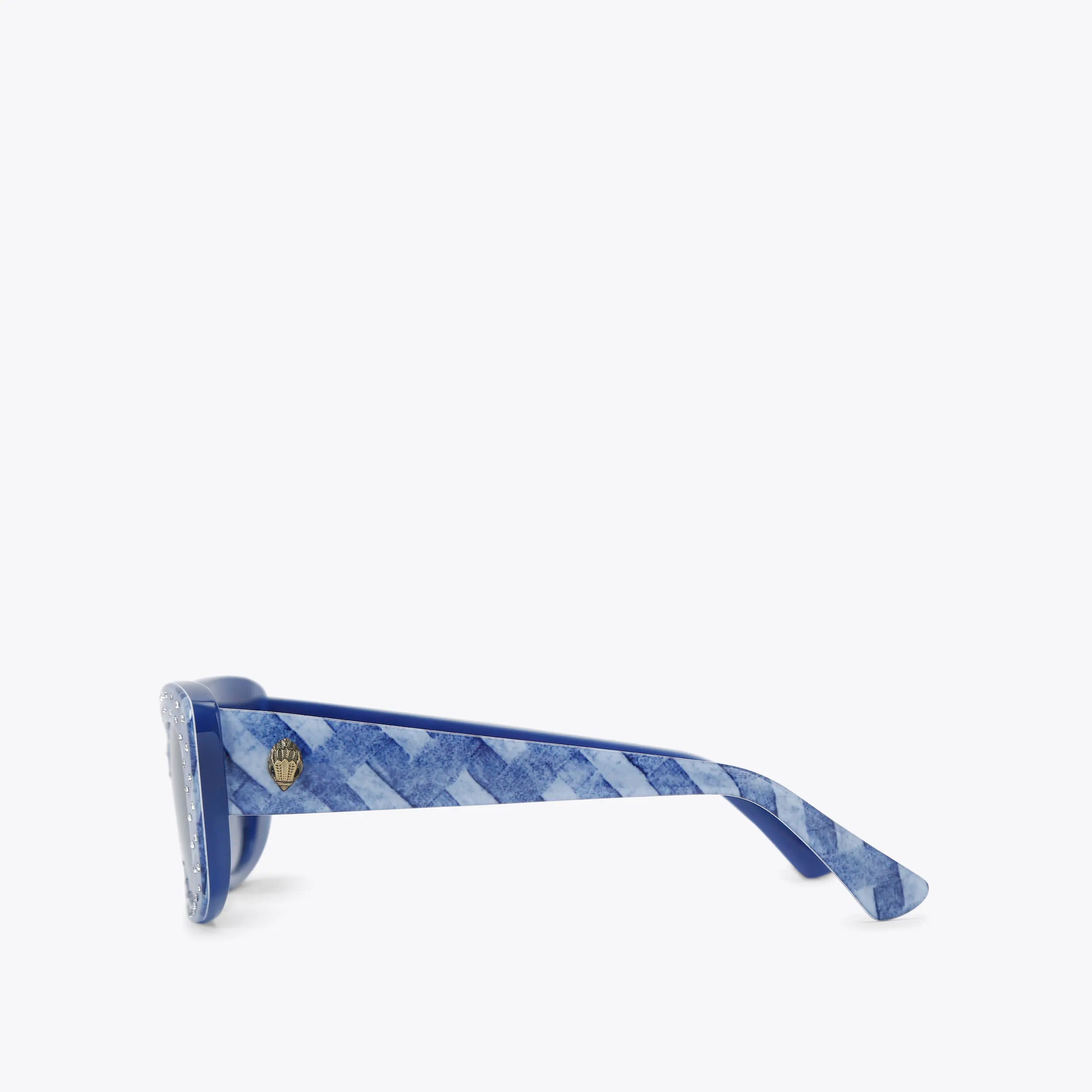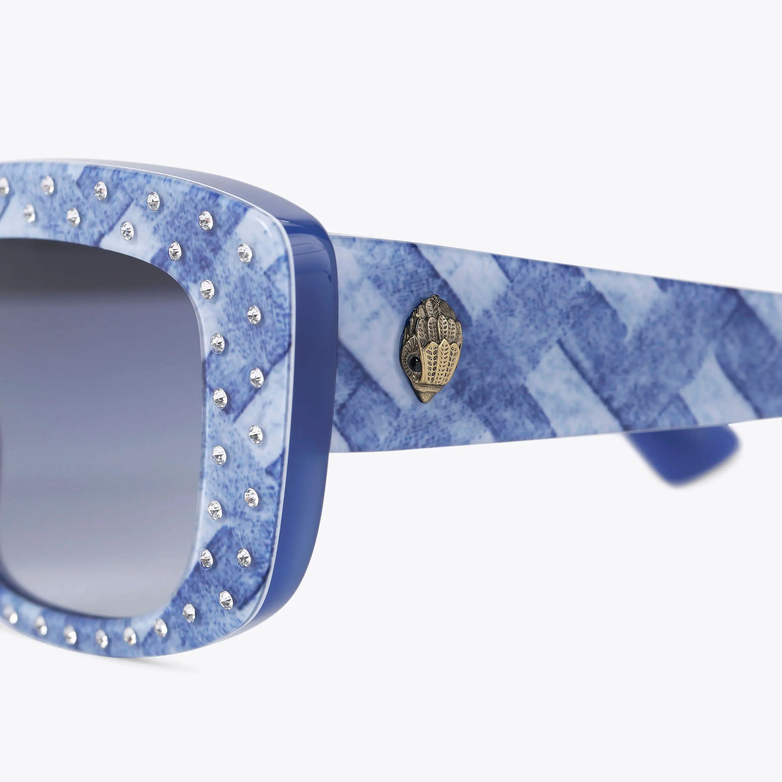 This pair of Shoreditch Gem rectangle sunglasses feature blue tinted lenses with denim weave printed handmade acetate frames that are embellished with silver crystals. Each arm features an antiqued brass eagle head.