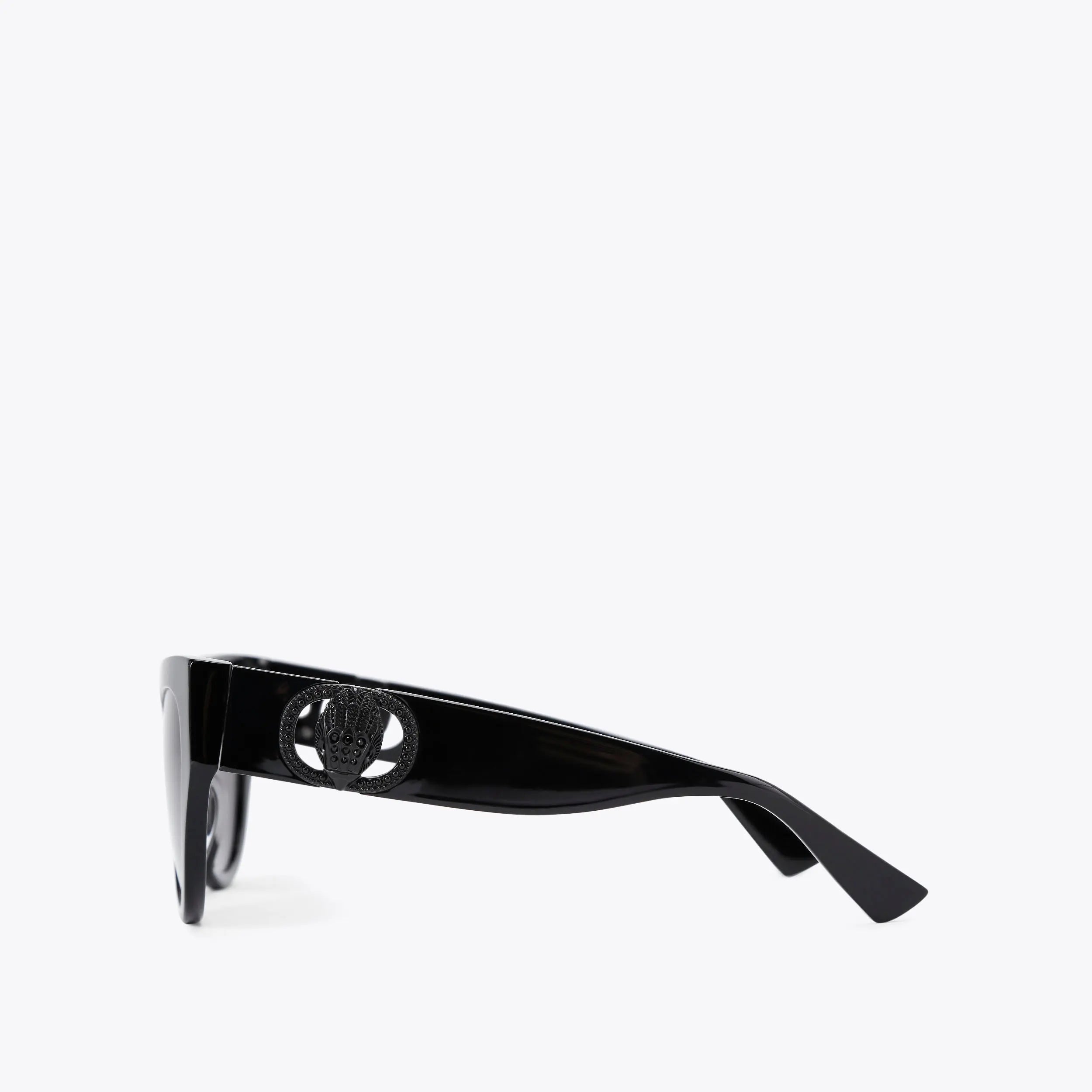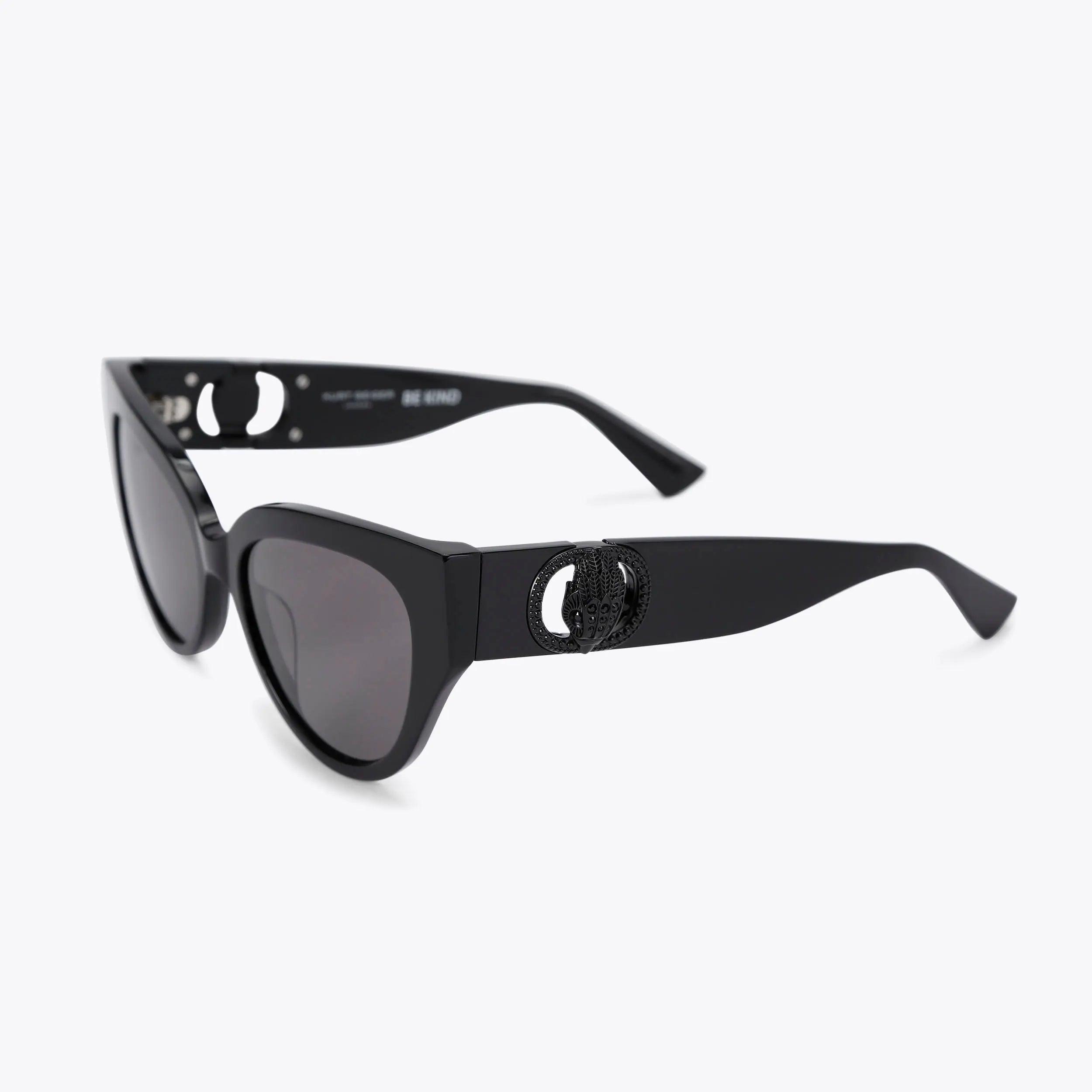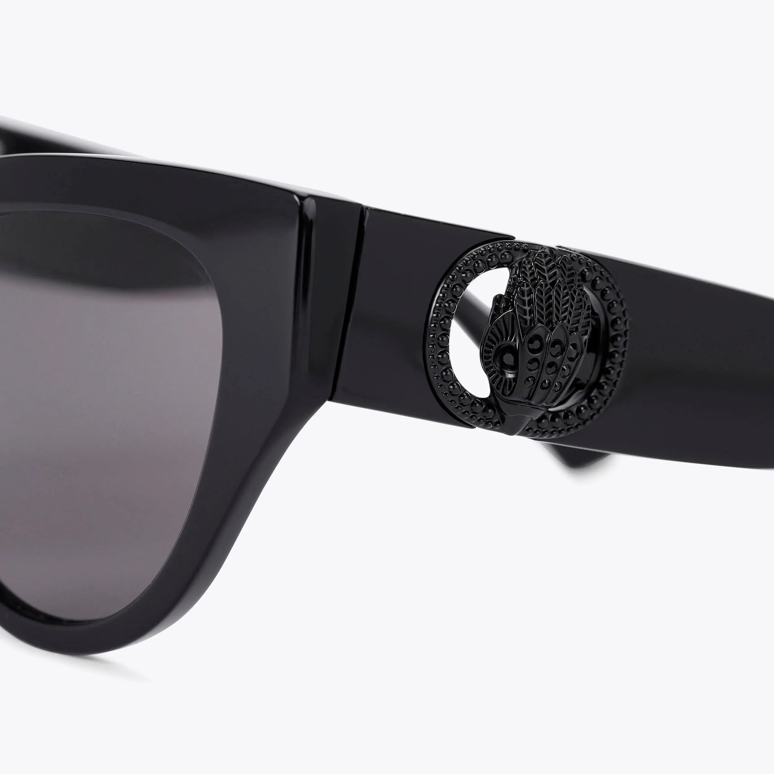This pair of Chelsea Cat Eye sunglasses arrive with a black handmade acetate frame featuring dark tinted lenses. Each arm features a black metal Chelsea oval trim with eagle head at the centre detail.
