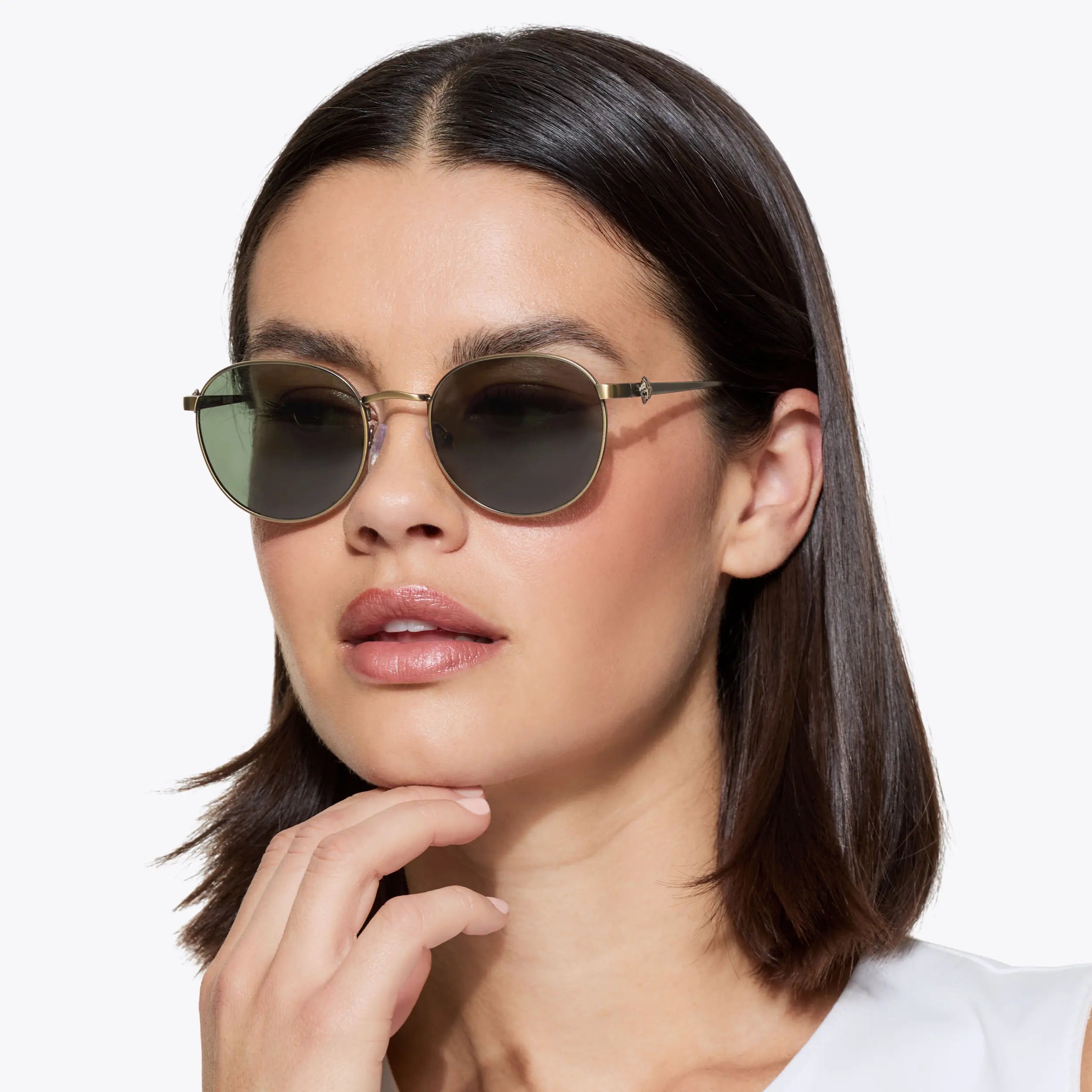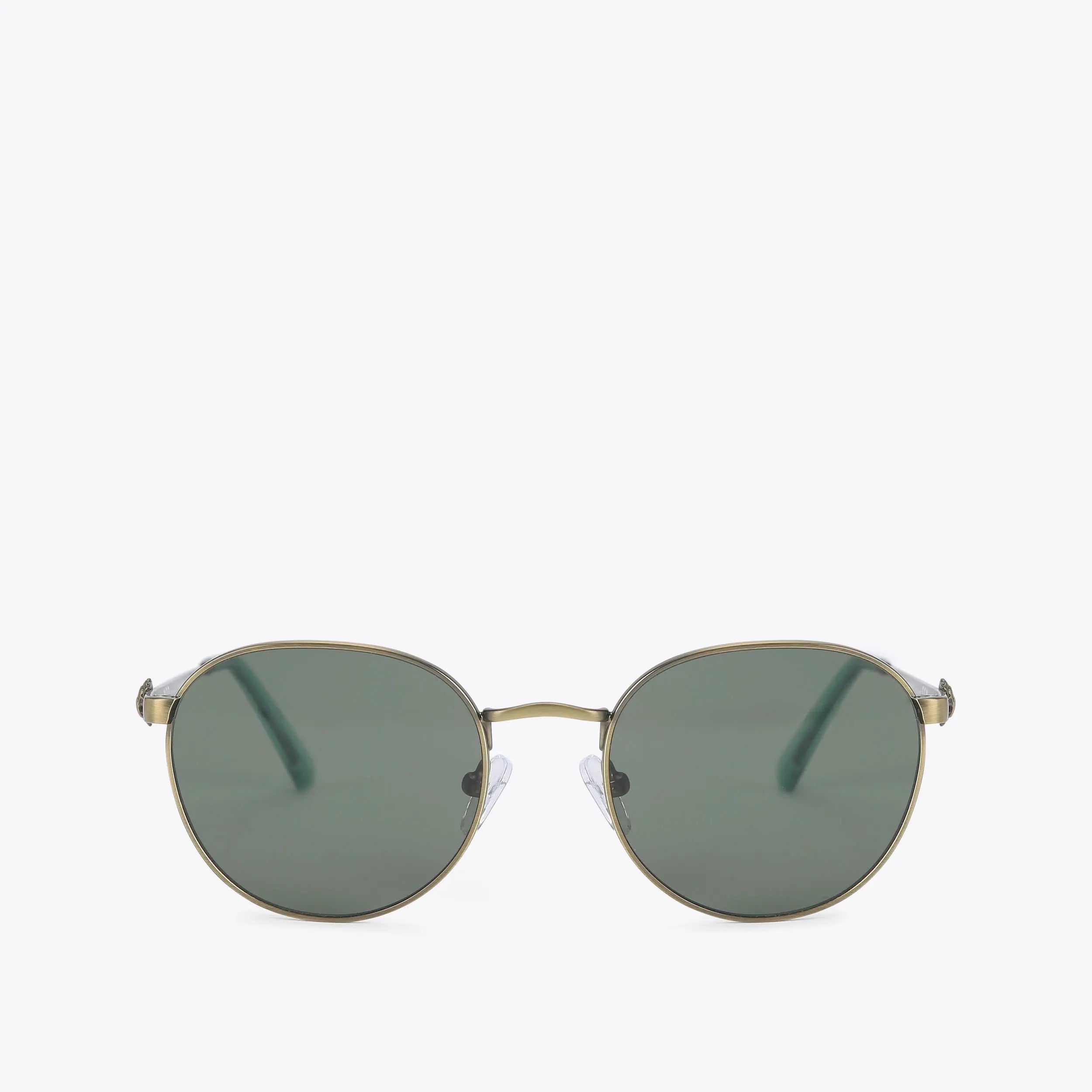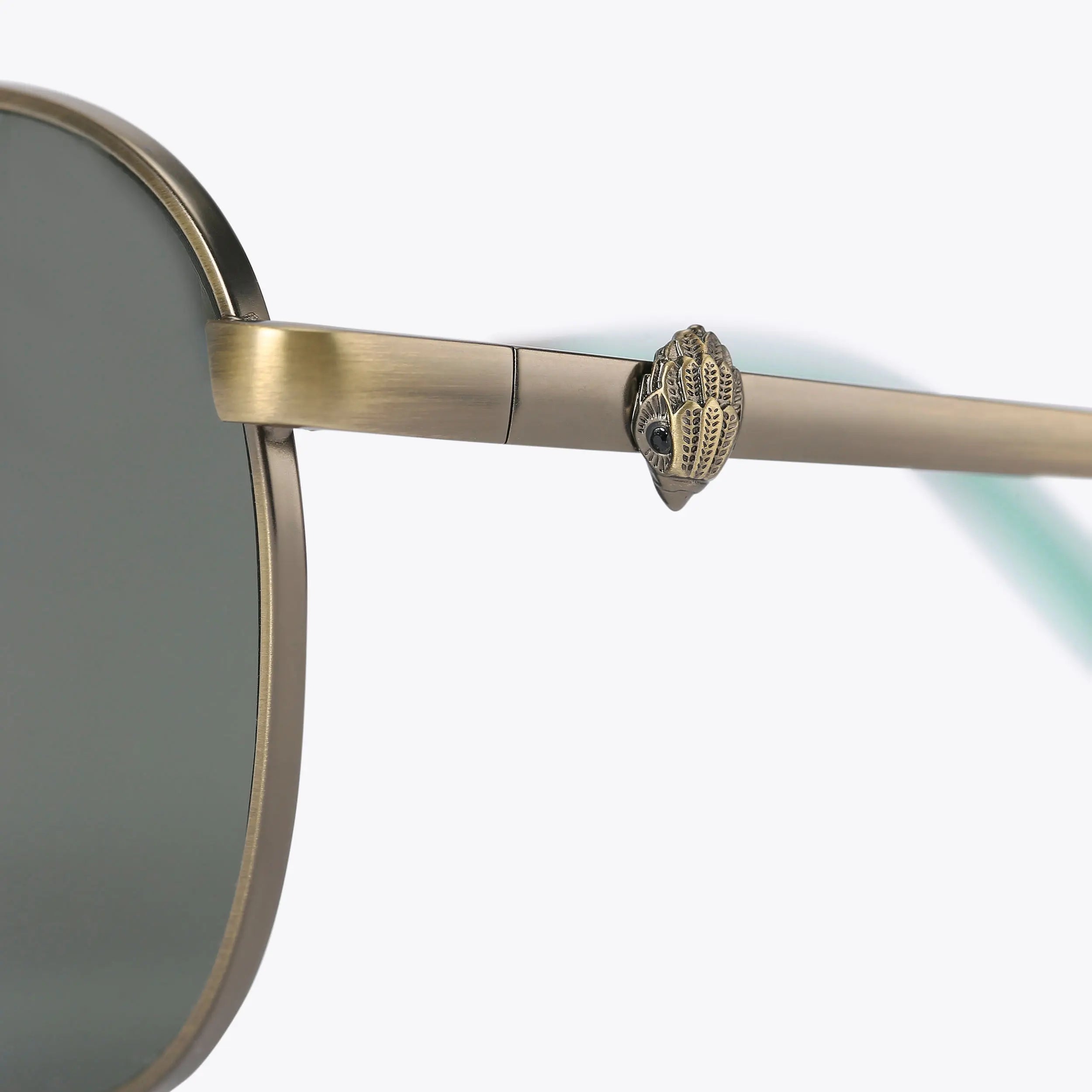 This pair of Shoreditch round sunglasses feature dark tinted round lenses with antiqued brass frames. Each arm features antiqued brass eagle head and tortoiseshell temple tips.