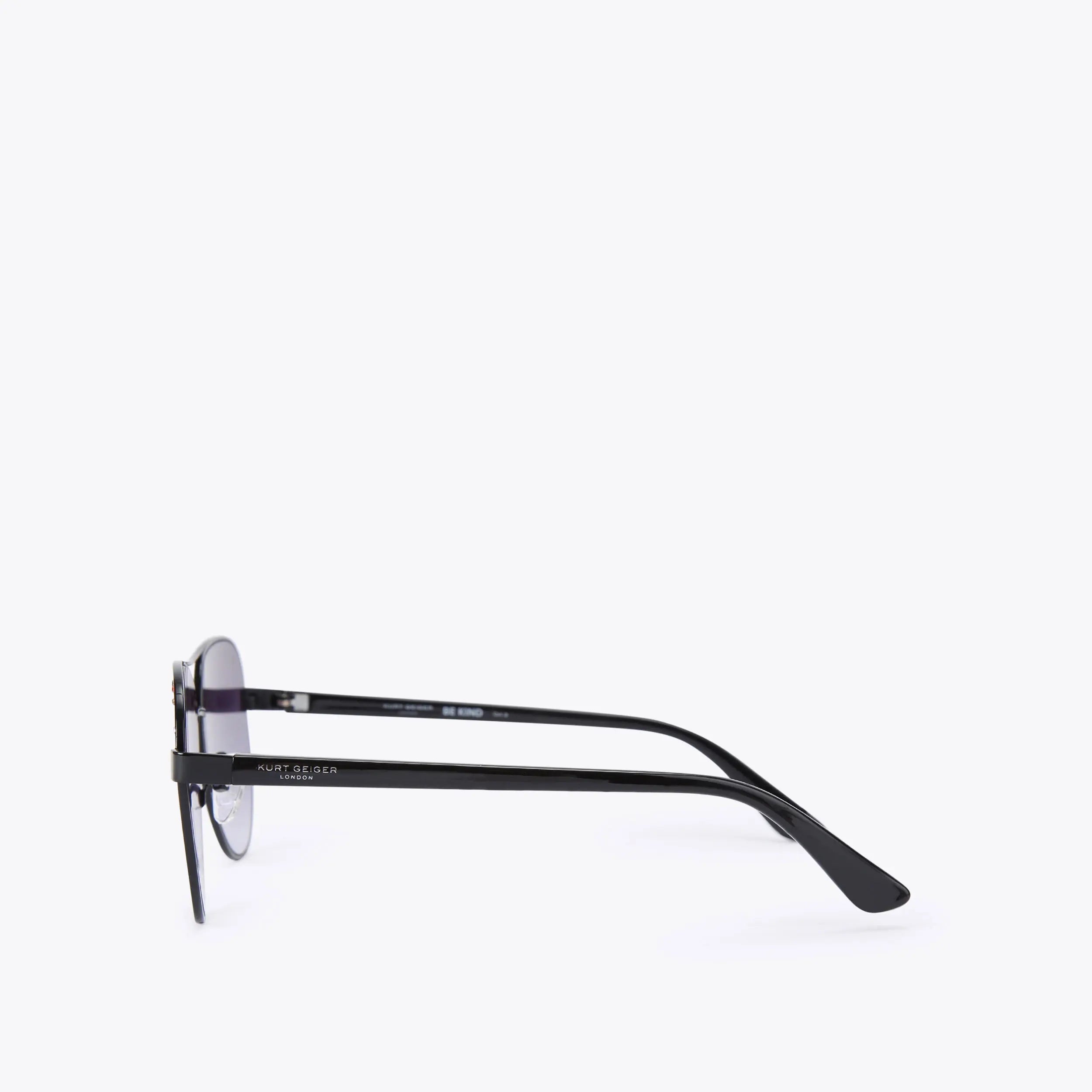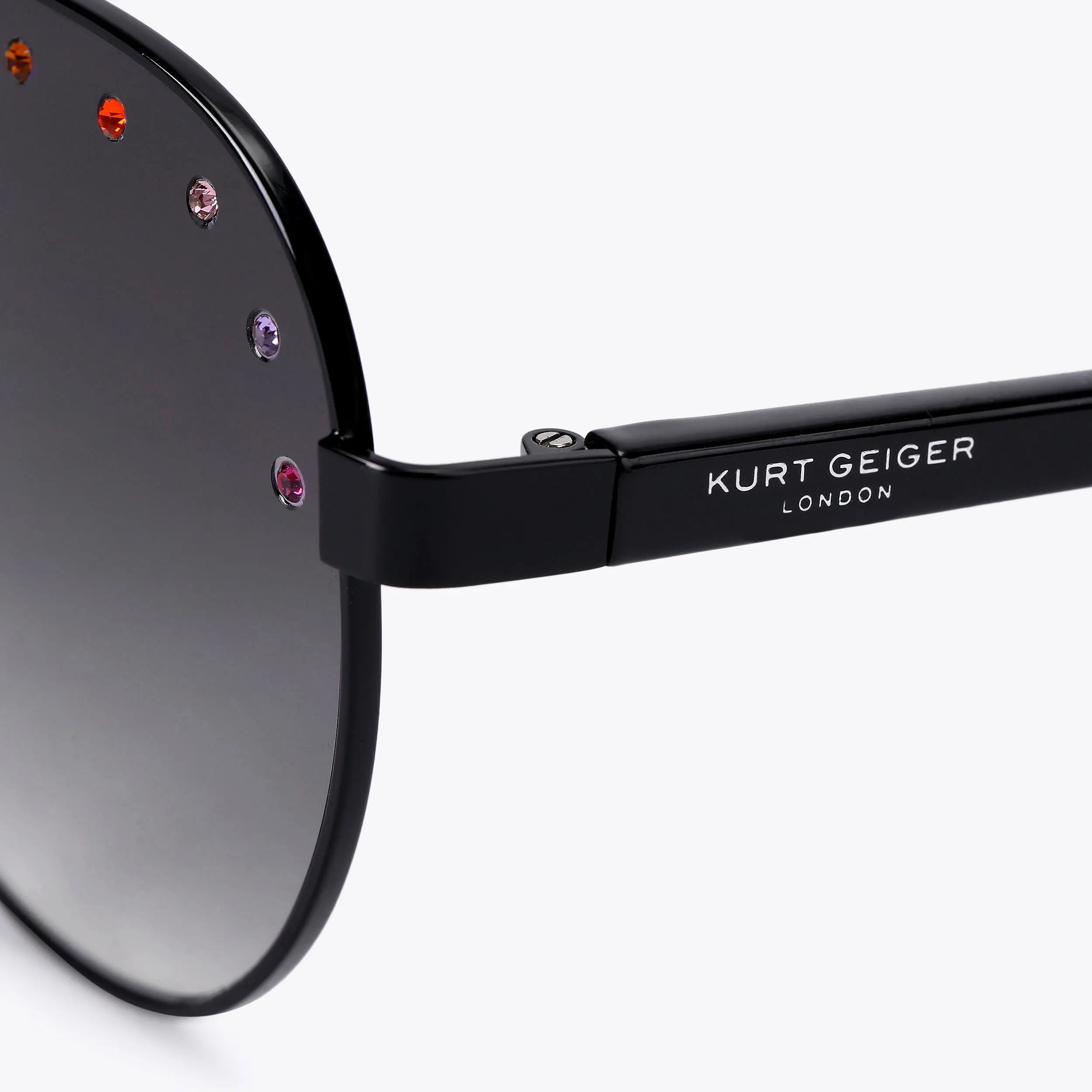 This Shoreditch Aviator Gem sunglasses feature black lenses with black trim. There are crystals across each of the lenses. The black acetate arms feature silver branding.