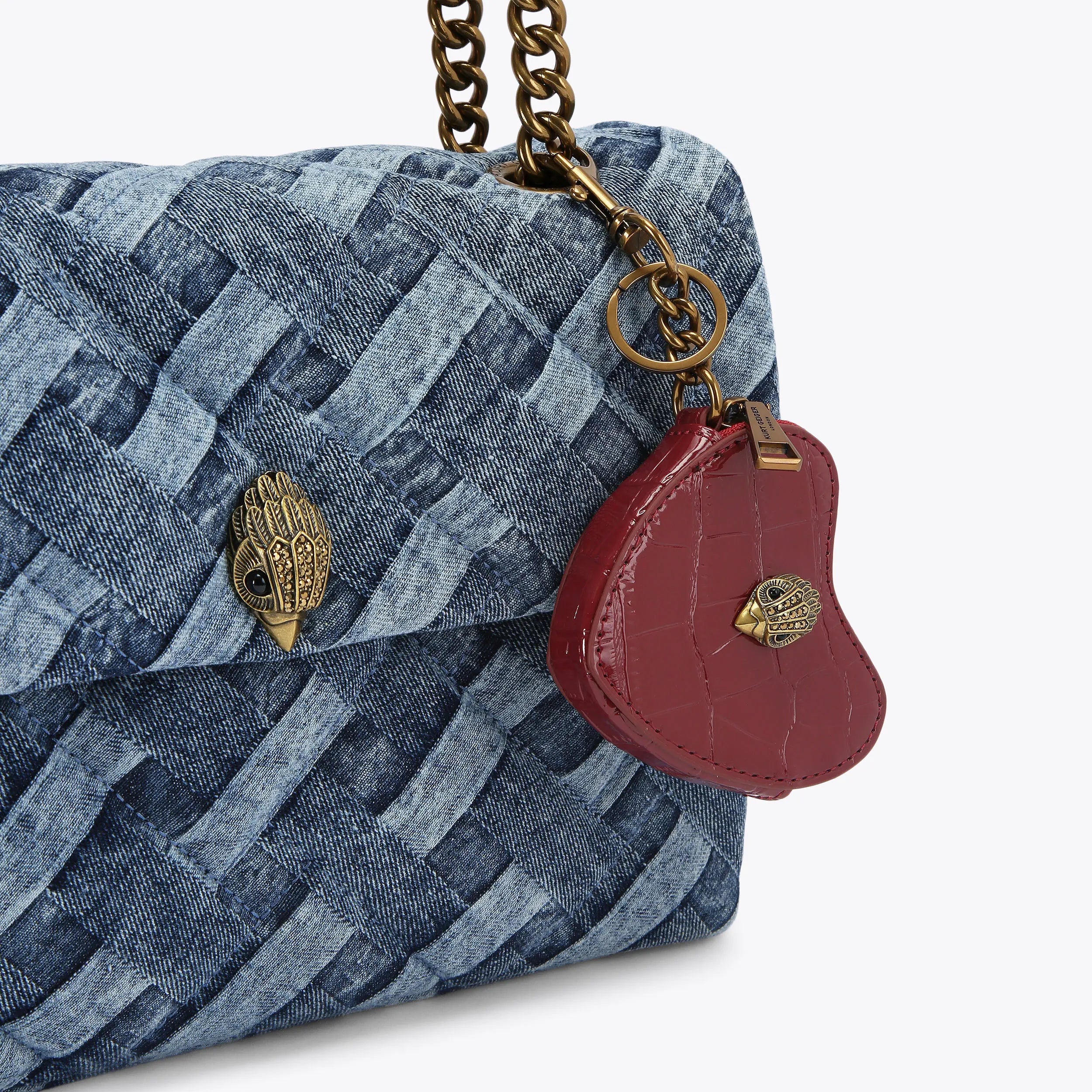 This Kensington Heart Keyring Charm comprises of a croc printed heart in red. There is an antiqued brass eagle head not he front complimenting the metal chain.