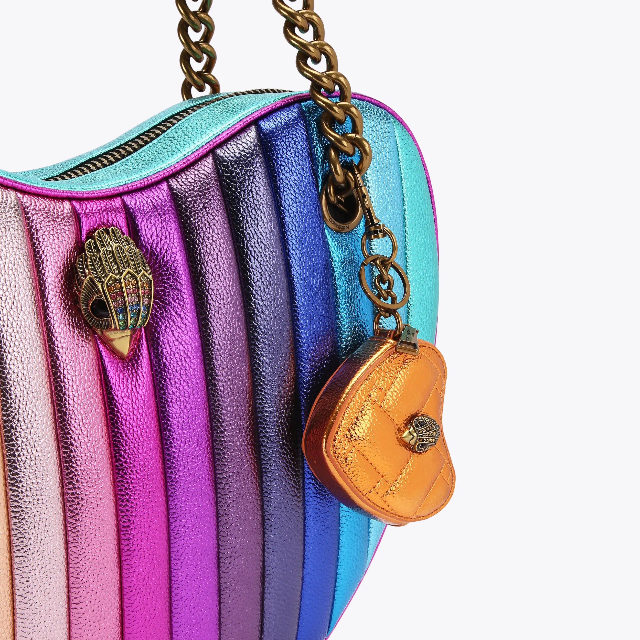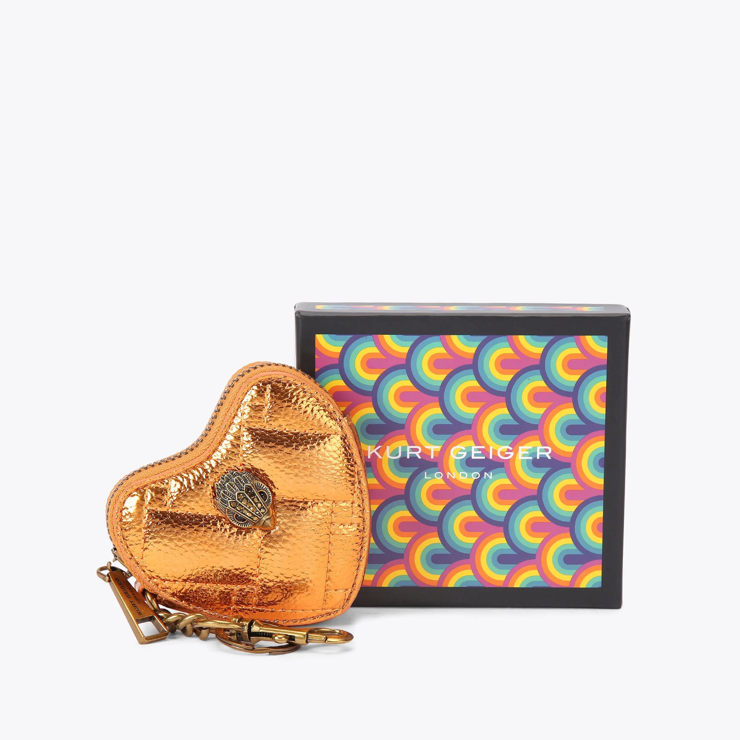 This Kensington Heart charm is a micro heart charm crafted in a pebble grain leather alternative. There is signature overstitch quilting across the exterior and the front features a gold eagle head.