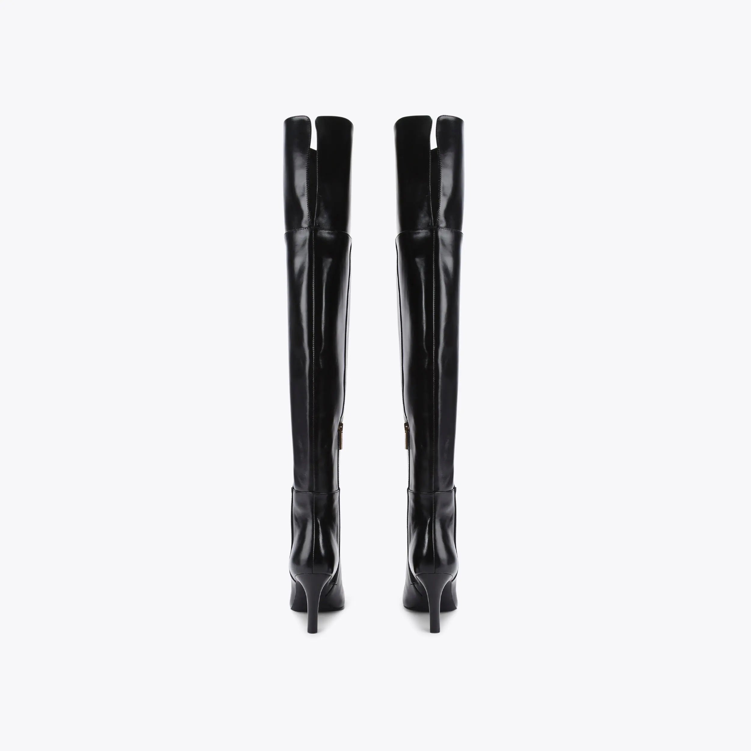 This Shoreditch Over The Knee boot features a black upper which reaches above the knee. There is a chic antiqued brass eagle head on the outer side of each boot.