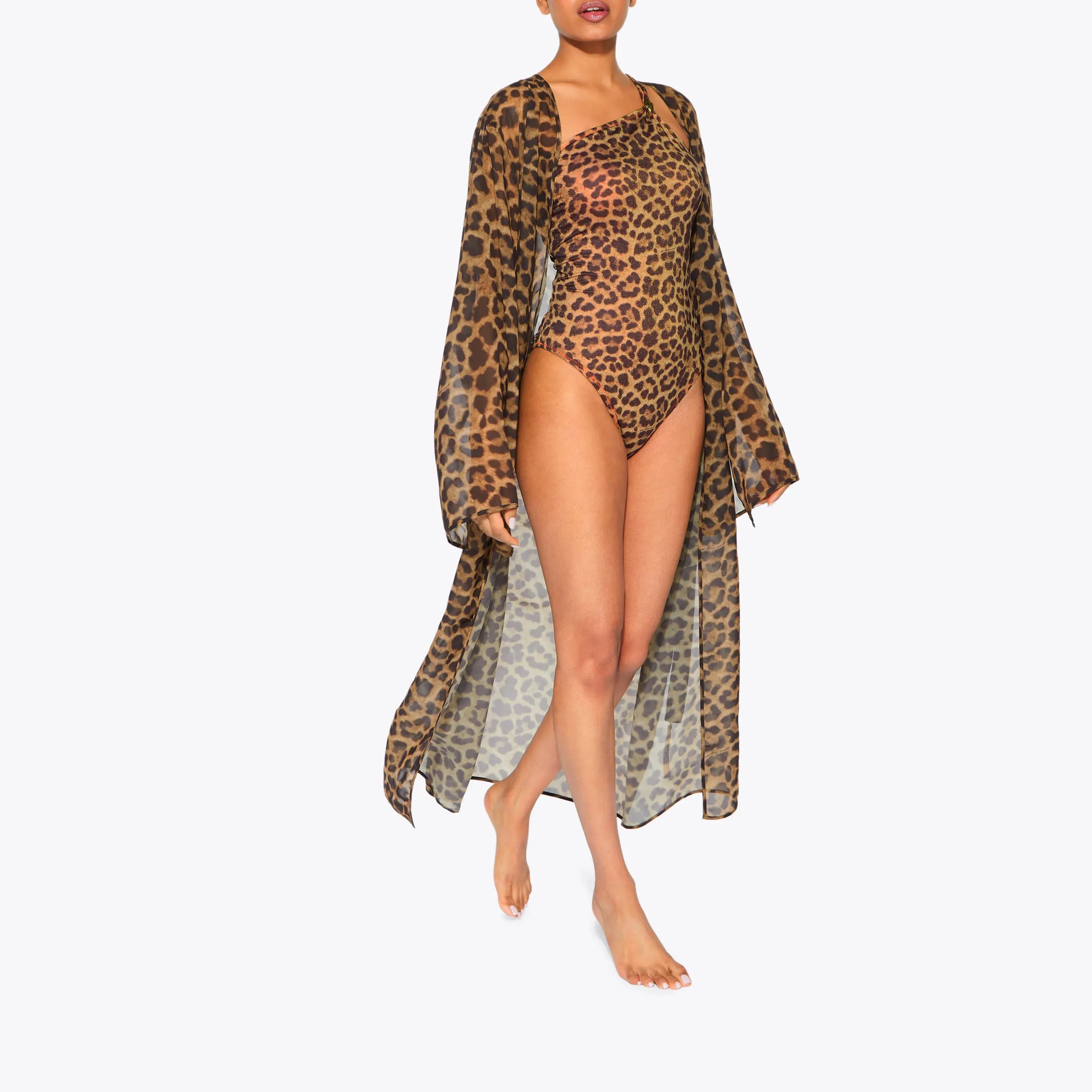 This Resort robe arrives in a statement leopard printed design with slight transparency to the fabric. This robe ties at the waist with fabric belt features gold chain tassels.