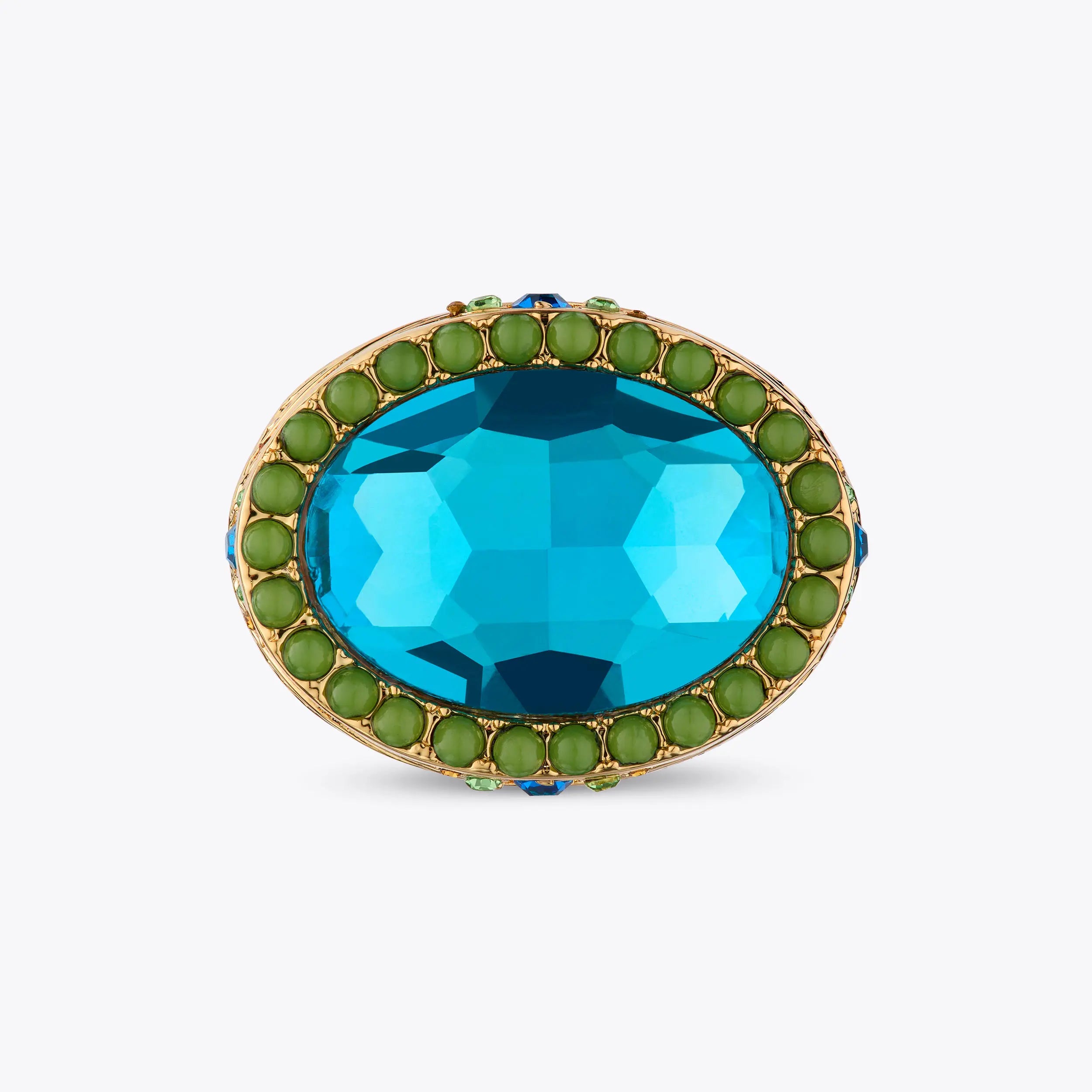 This XL Oval Cocktail Ring features a chunky gold band with rainbow cut outs embellished with rainbow crystals. There is a blue crystal with green resin stone surround sat on top of the ring.