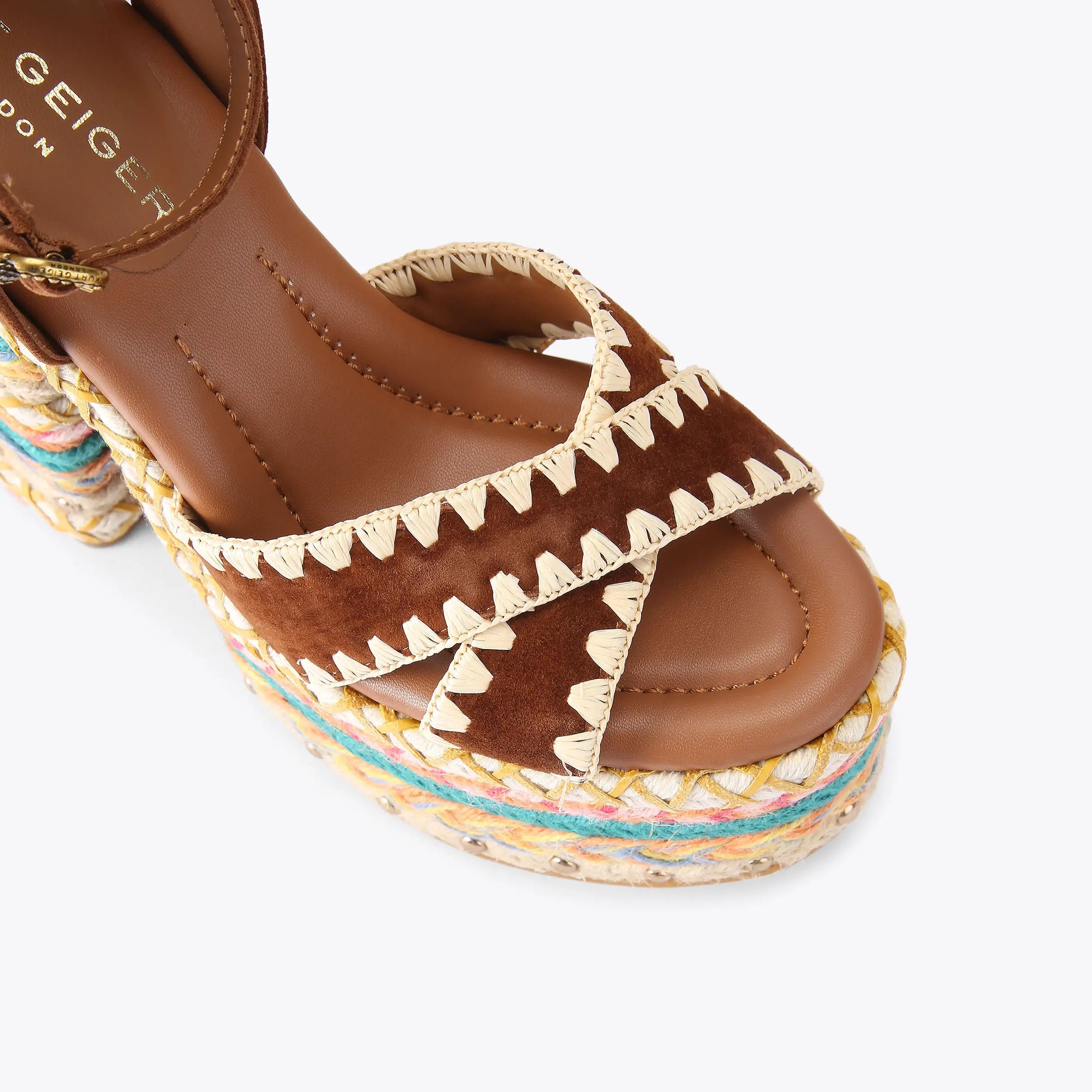 This Chelsea Scarf Platform heel is crafted from a brown suede leather on the crossed straps and a statement woven rope heel in multiple colours. The ankle strap is accented with an optional rainbow swirl scarf detail.