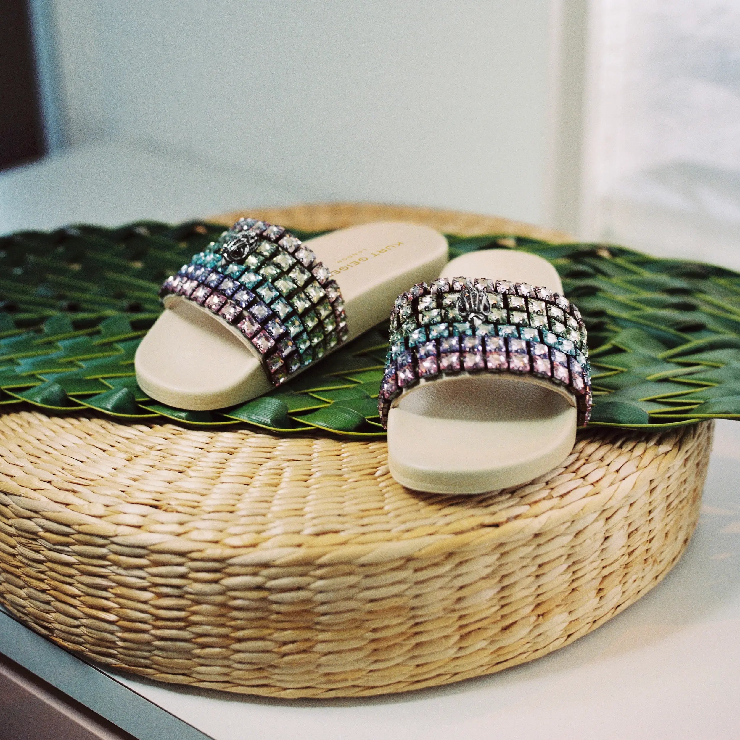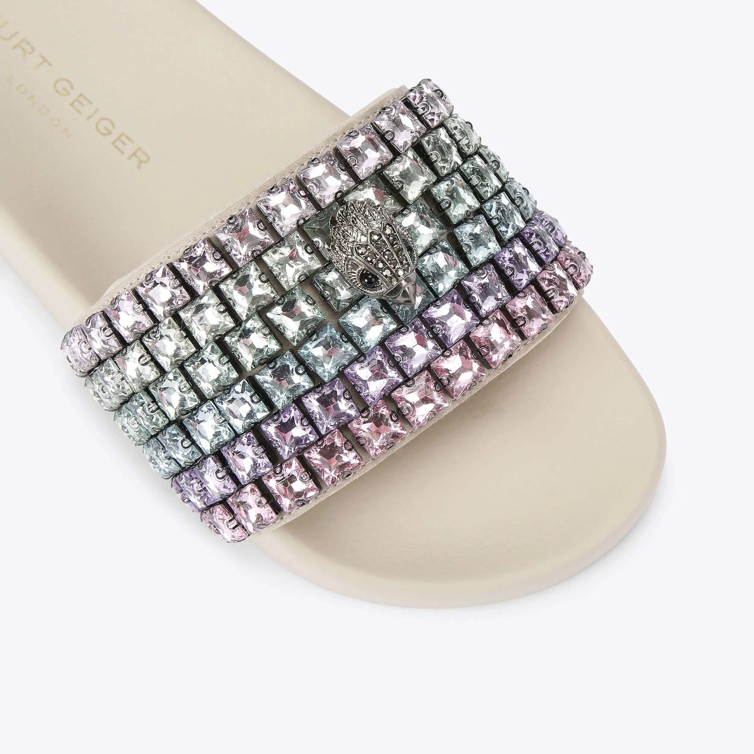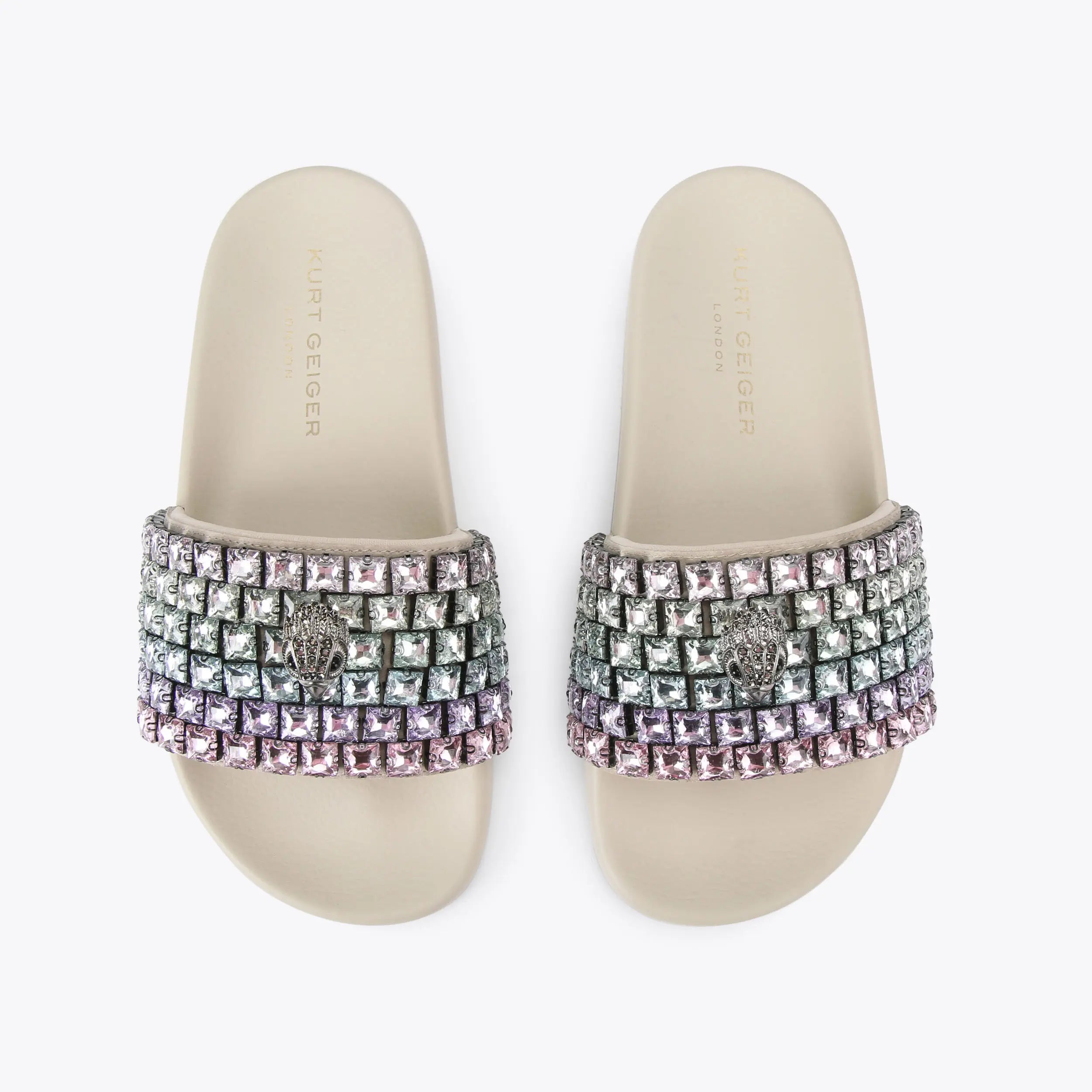 This Meena Eagle sandal slips onto the foot with a white moulded footbed. The toe strap is designed in the rainbow Kensington rainbow using large pastel crystals. There is an antiqued silver eagle head embellished with crystals sat on top.