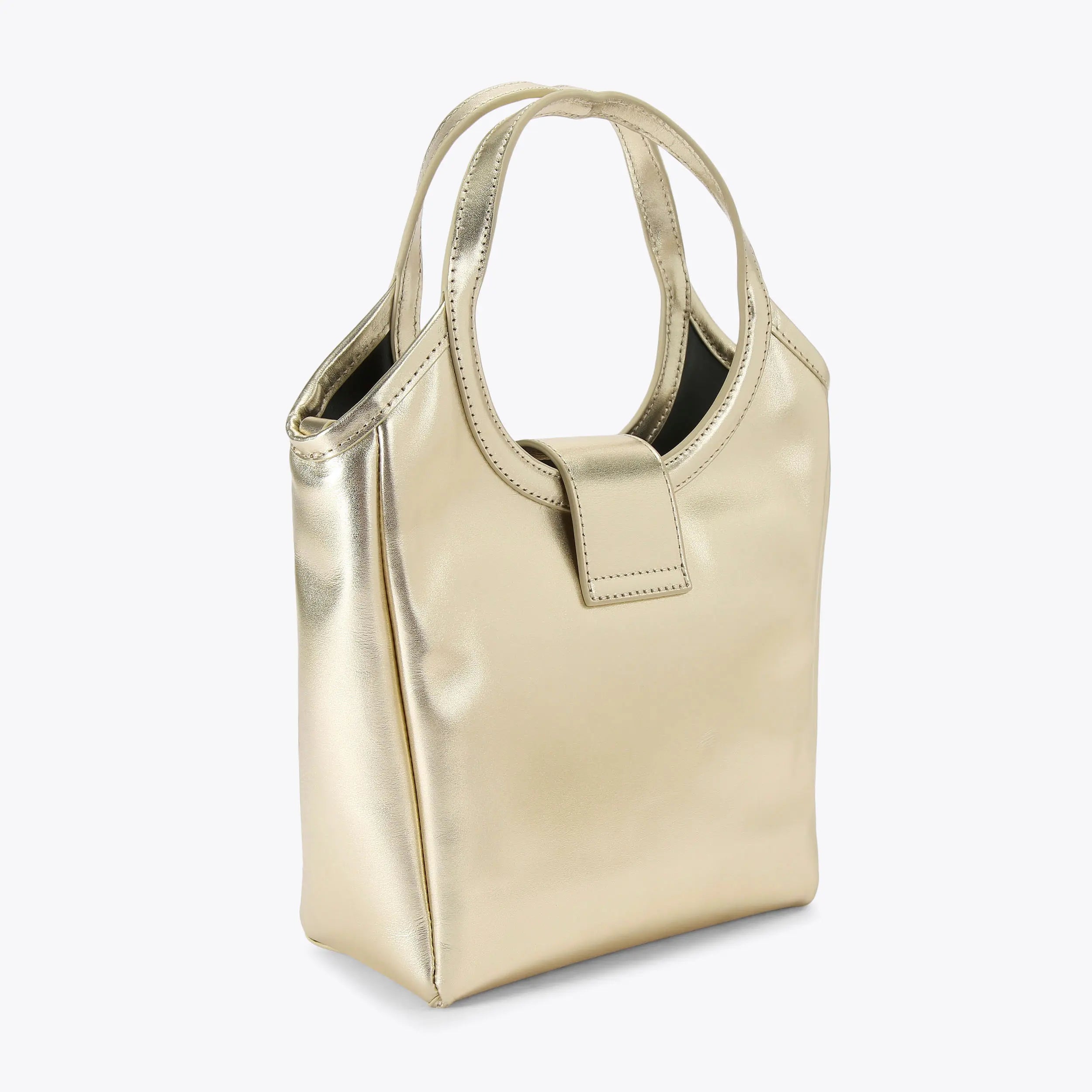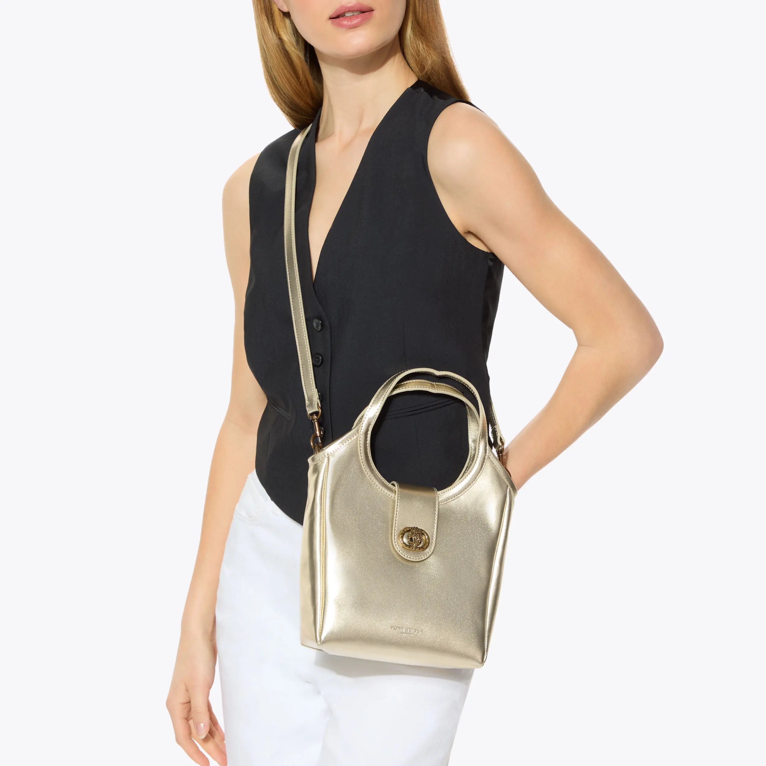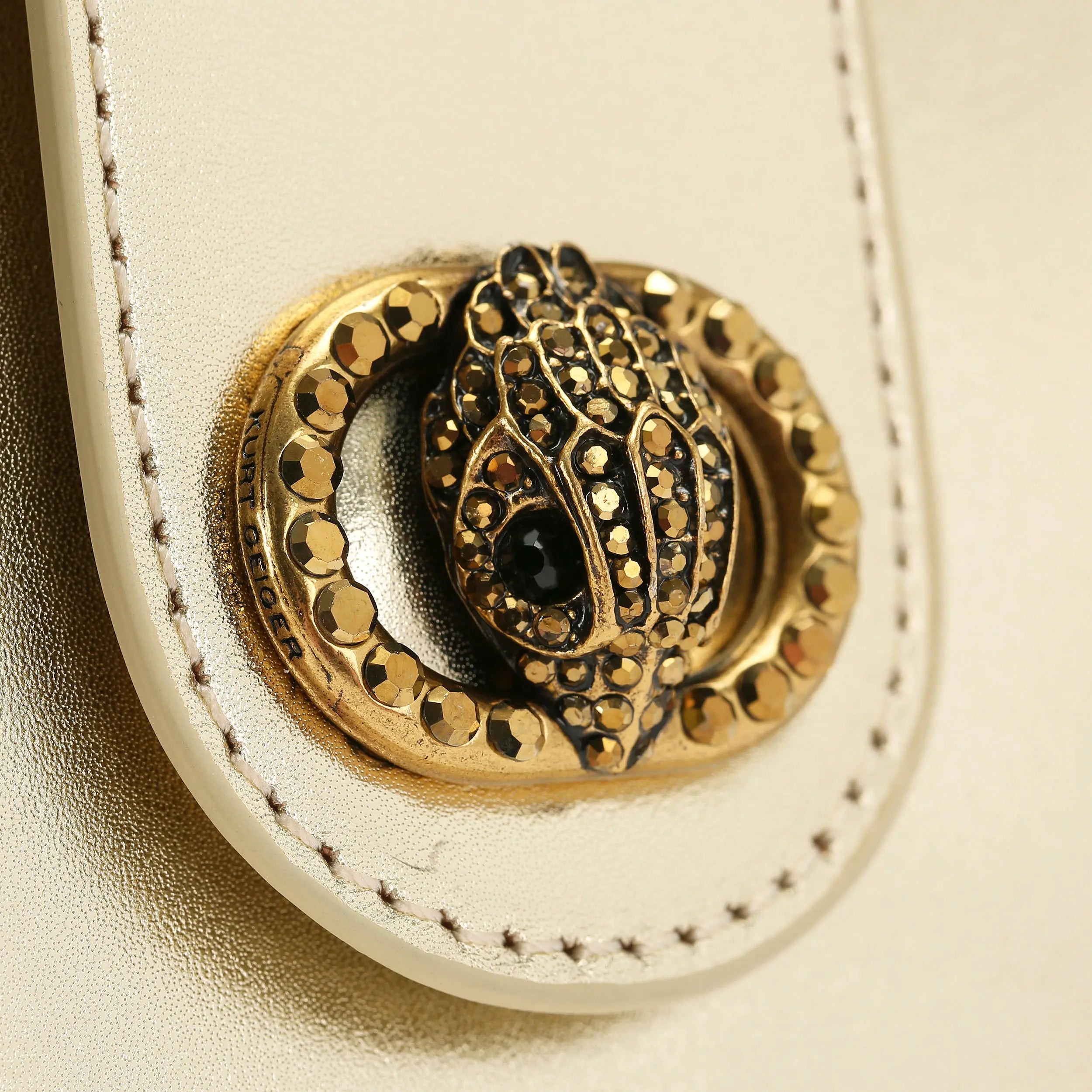 This Small Chelsea Tote Purse features a champagne leather exterior with two circle top handles. There is an antiqued brass oval trim with eagle head at the centre on the flap over closure.