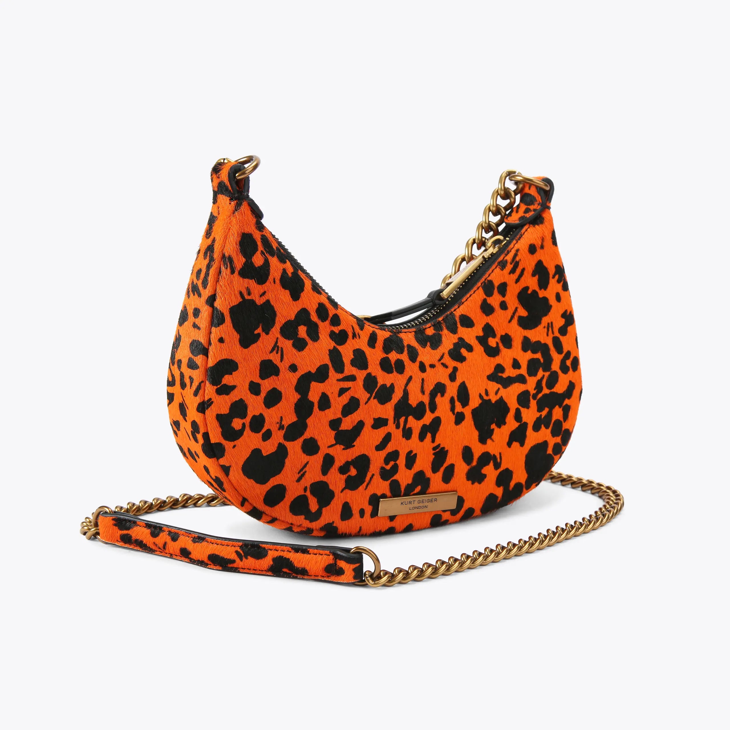 This Small Chelsea Hobo purse features a printed orange calfhair leather exterior. There is an antiqued brass oval trim with crystal eagle head at the centre of the small shoulder strap.