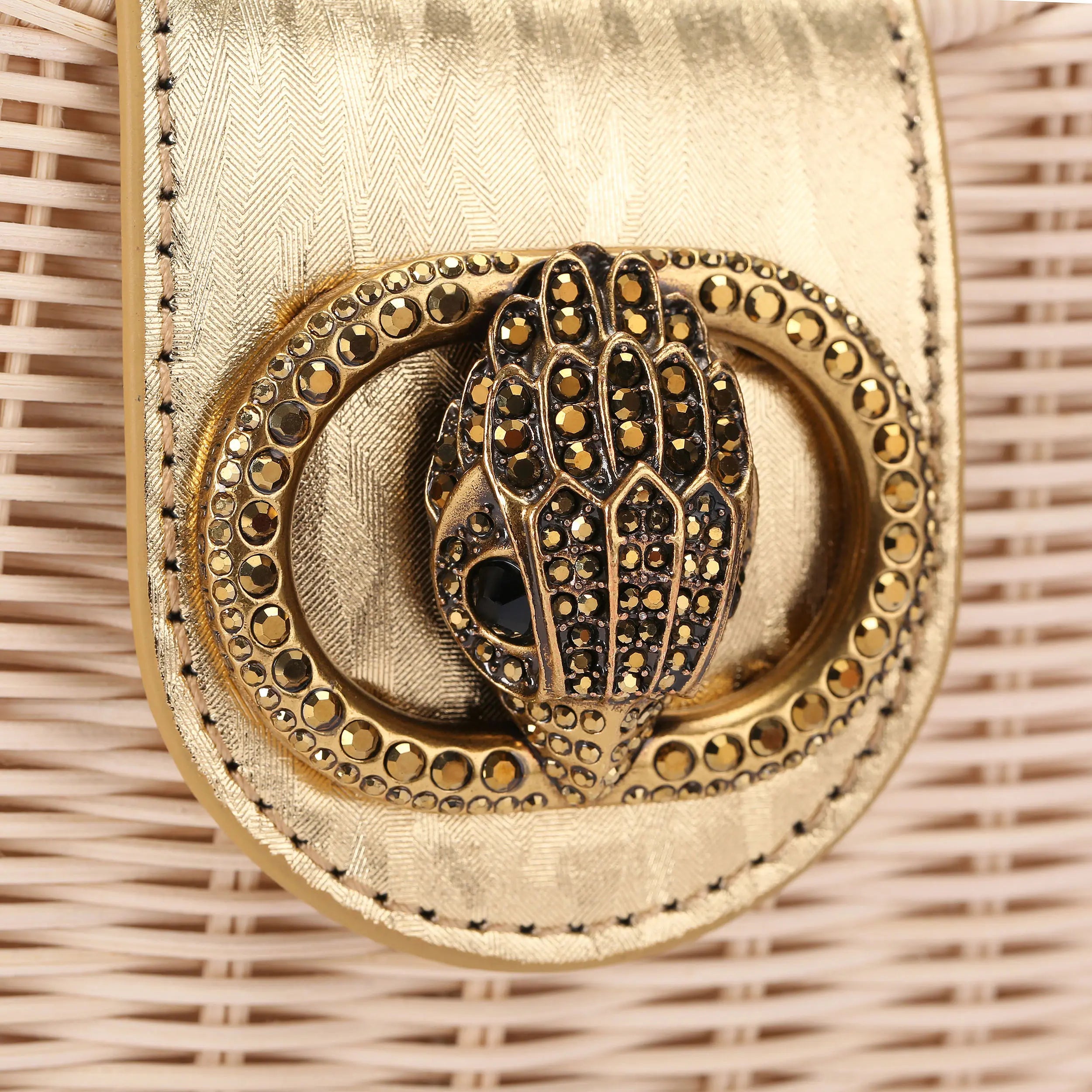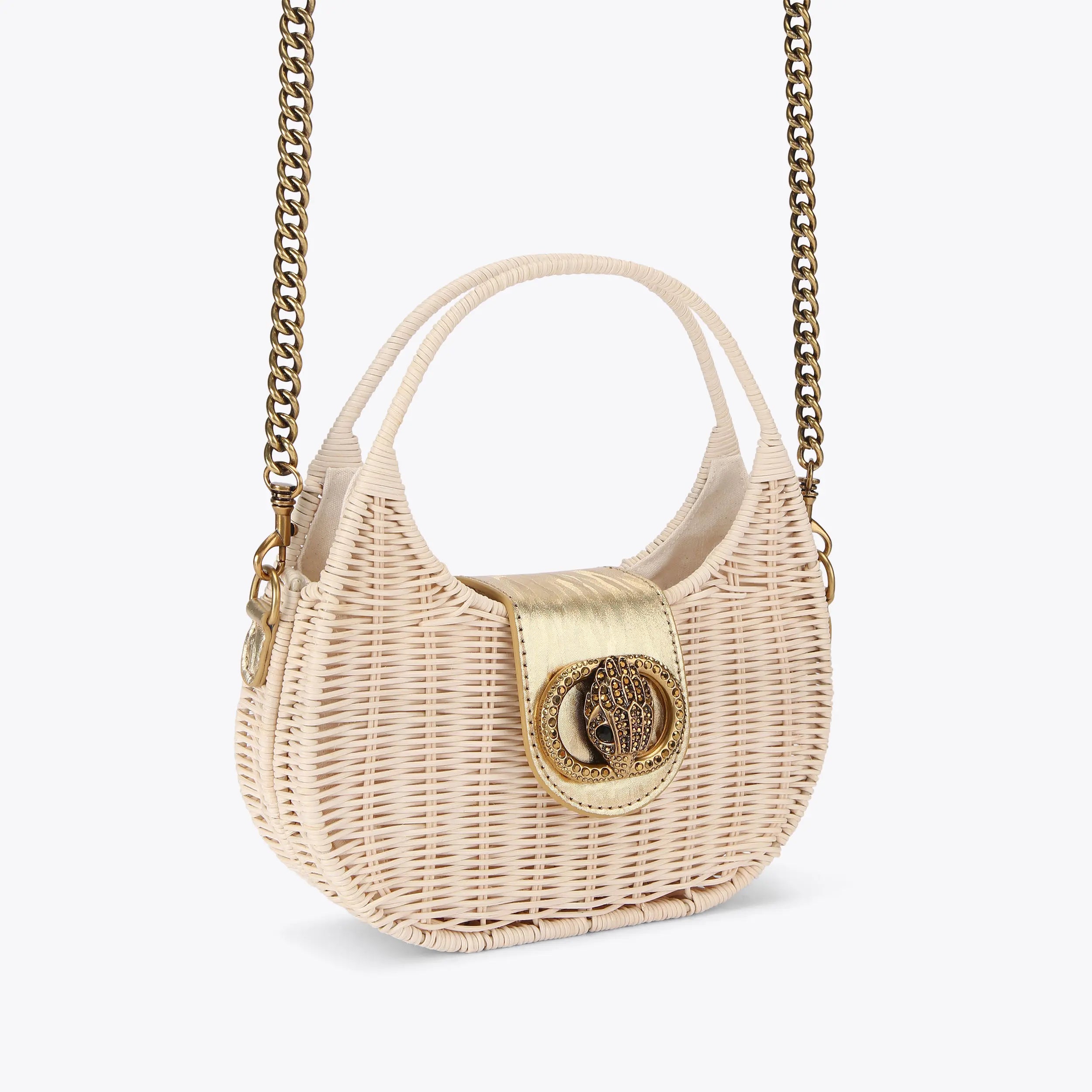 This Small Chelsea Basket Hobo Purse is a structured straw bag in a natural woven style. There is an antique brass Chelsea-style oval trim with an eagle head on the front of the bag.