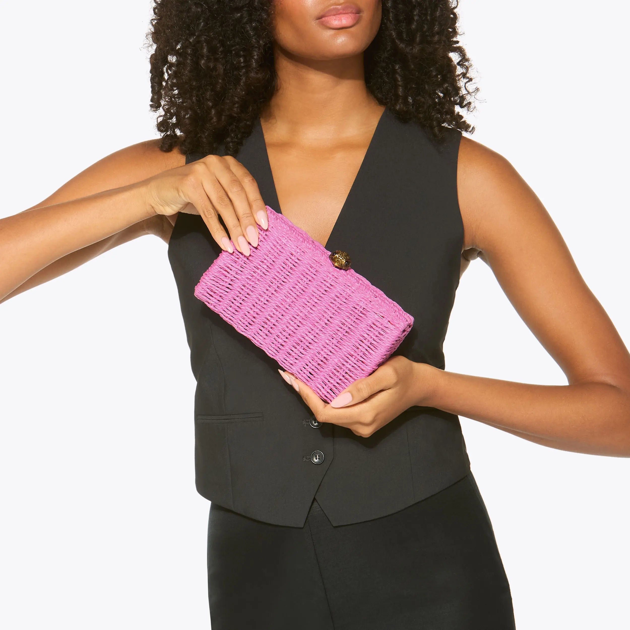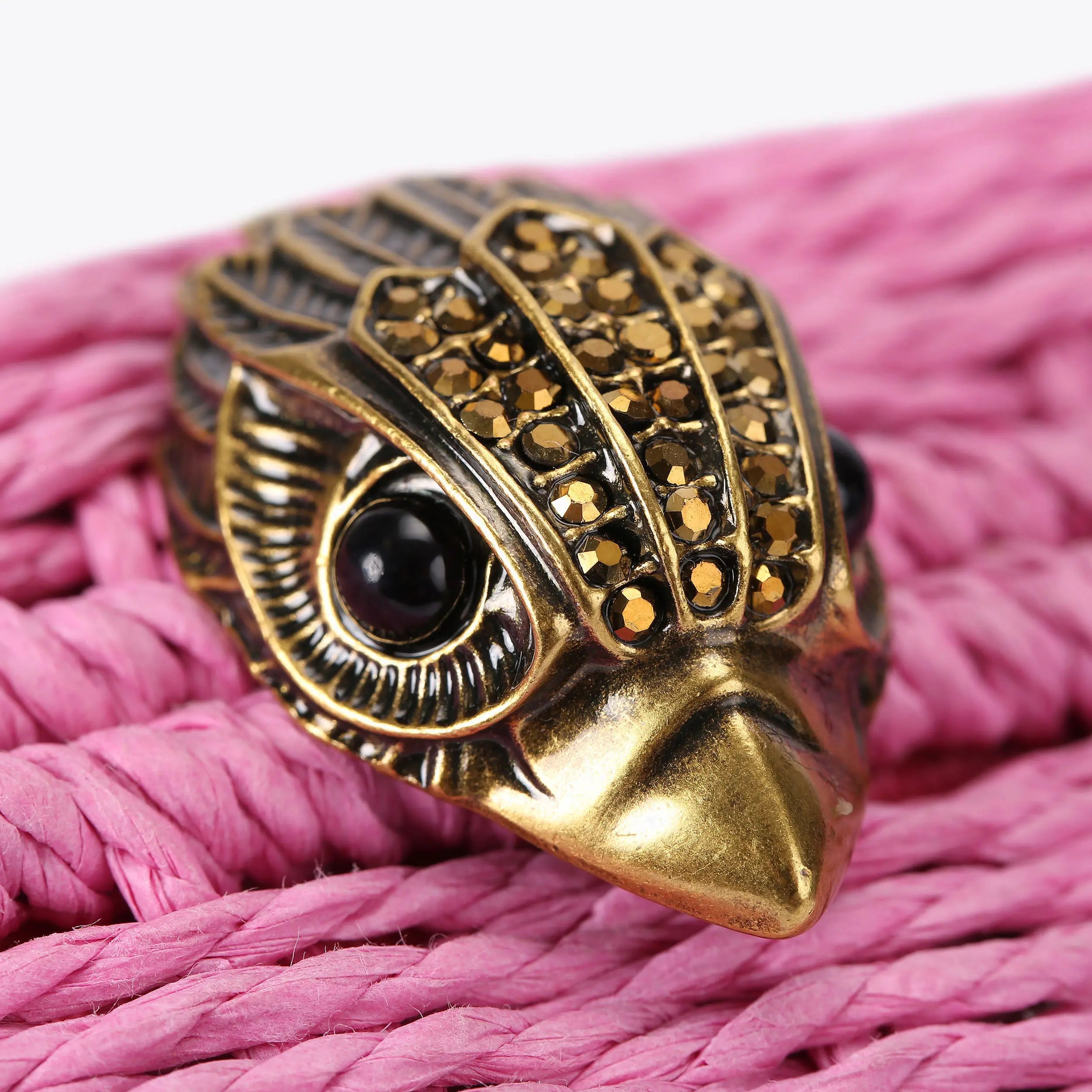 The Crystal Kensington Clutch Purse is made from a pink woven raffia. The antiqued brass eagle head features crystals and bead eyes on the clasp.