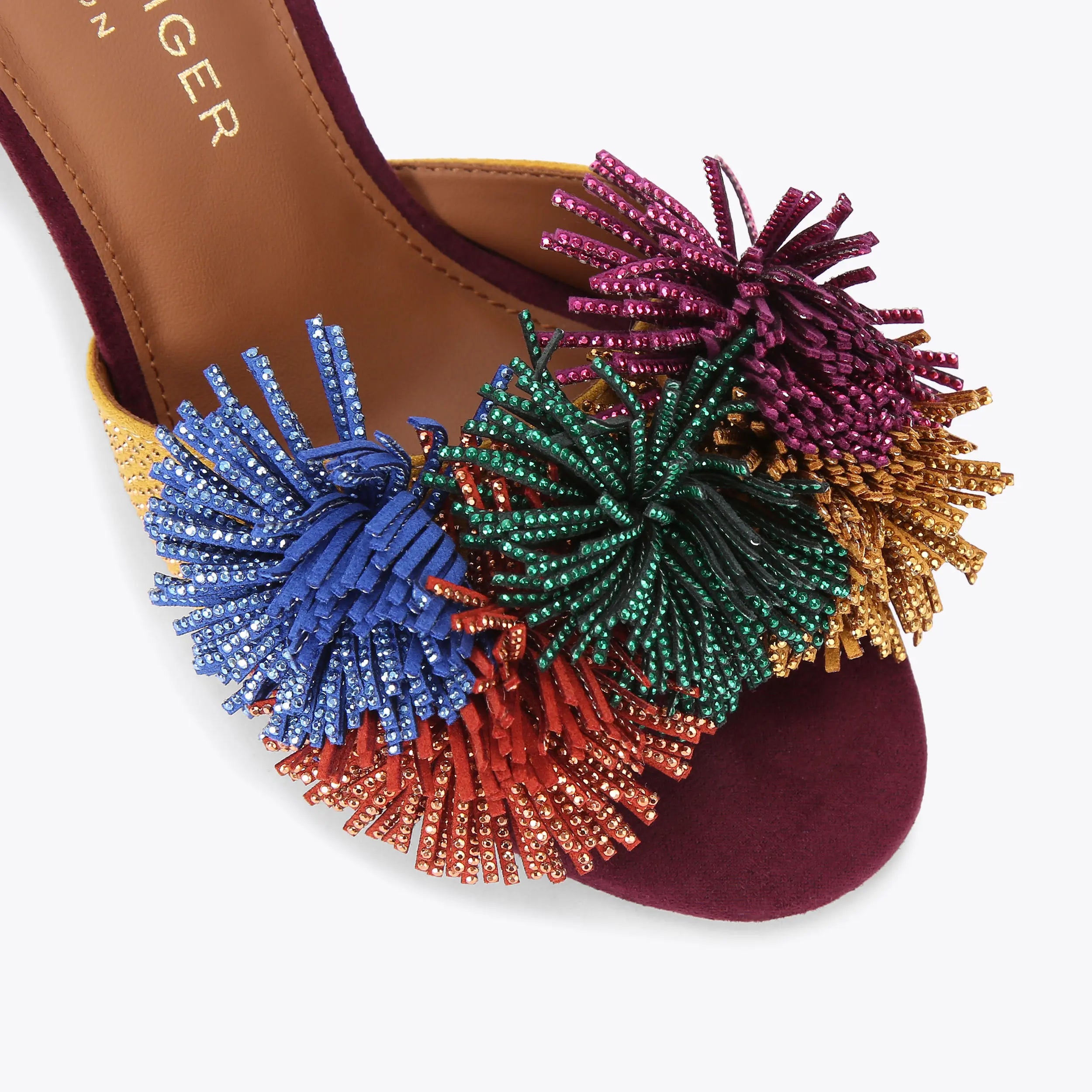 This Pom Pom heel has a multi-colour upper which features 5 crystal embellished suede pom poms on the toe strap as well as two on either end of the tie ankle strap.