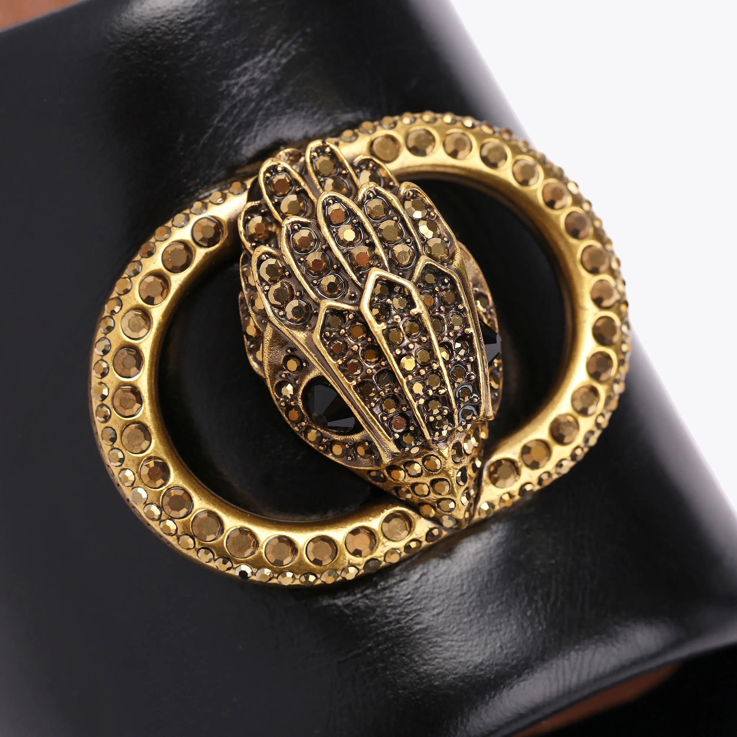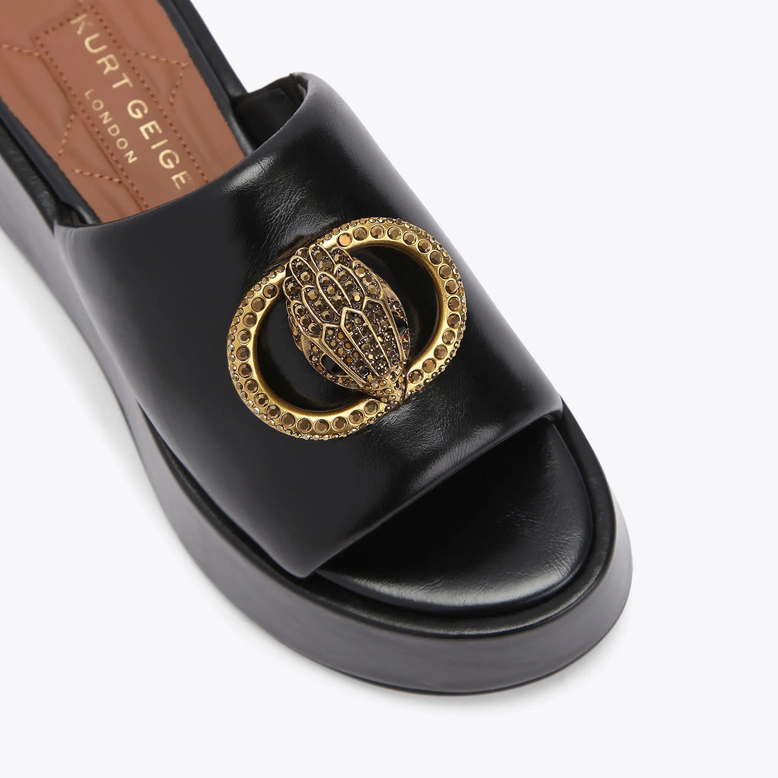 This Chelsea Flatform Mule sandal is crafted from a black leather. There is a black oval trim with eagle head and crystal embellishment at the centre of the strap.