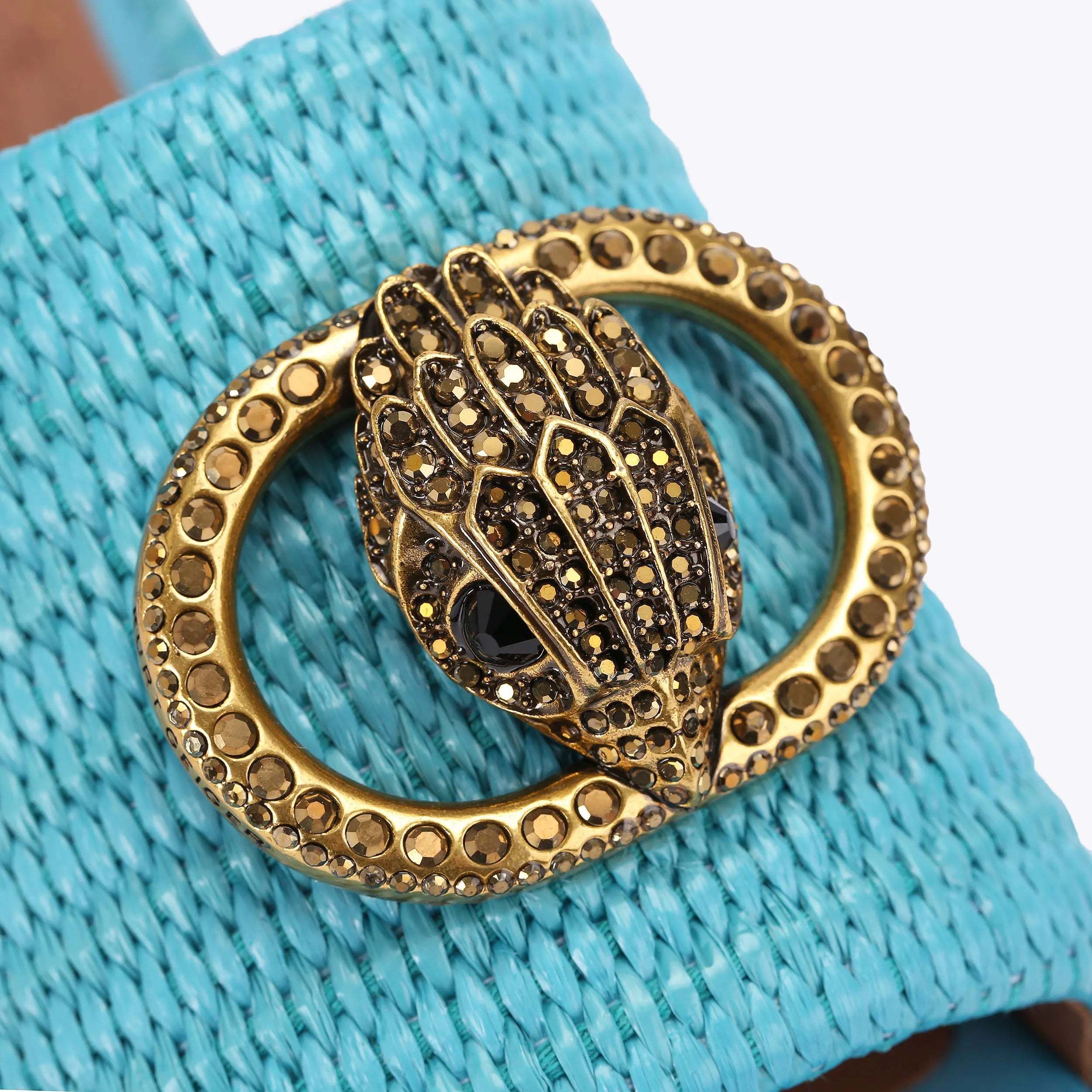 This Chelsea Flatform Mule sandal is crafted from a bright blue woven raffia. There is an antiqued brass oval trim with eagle head and crystal embellishment at the centre of the strap.