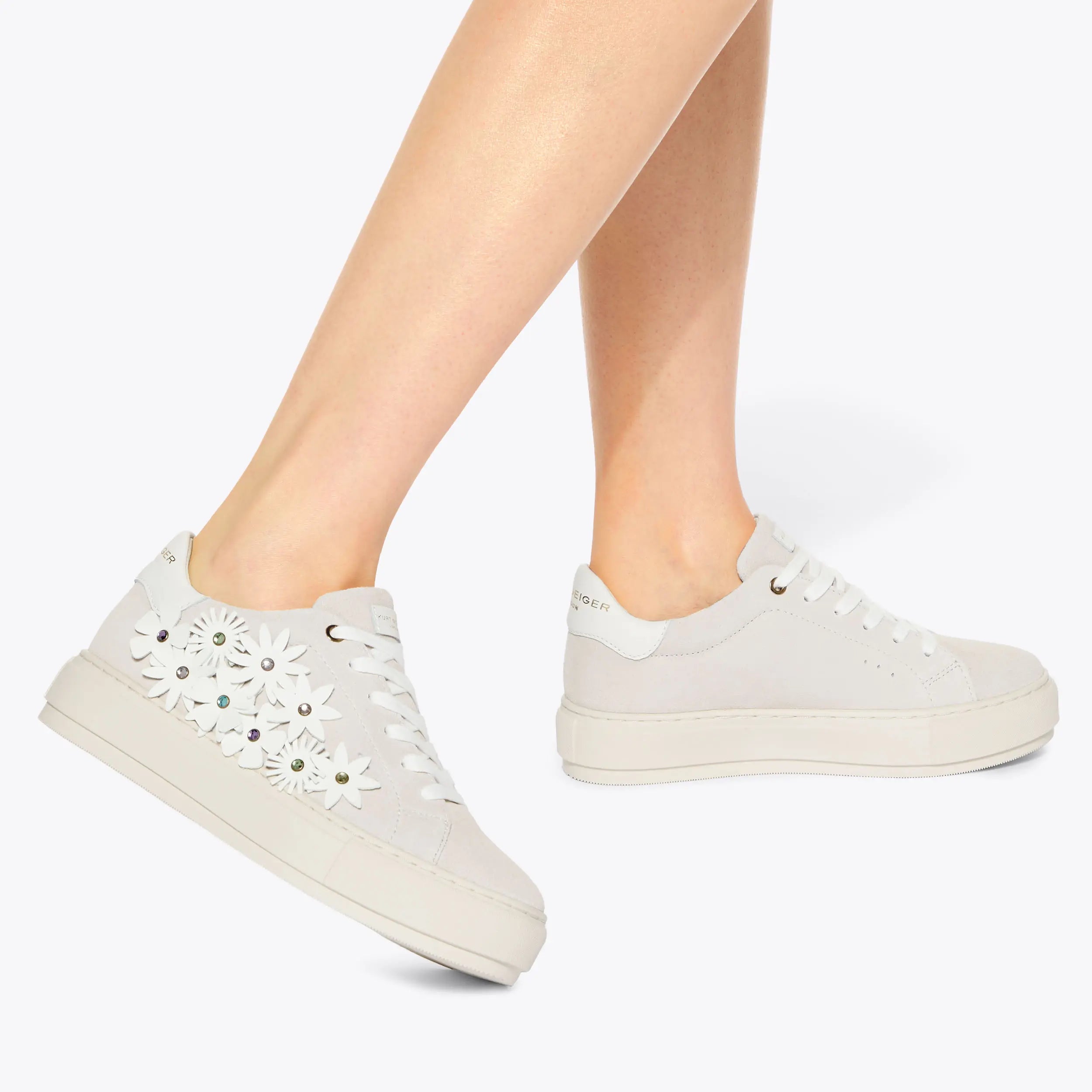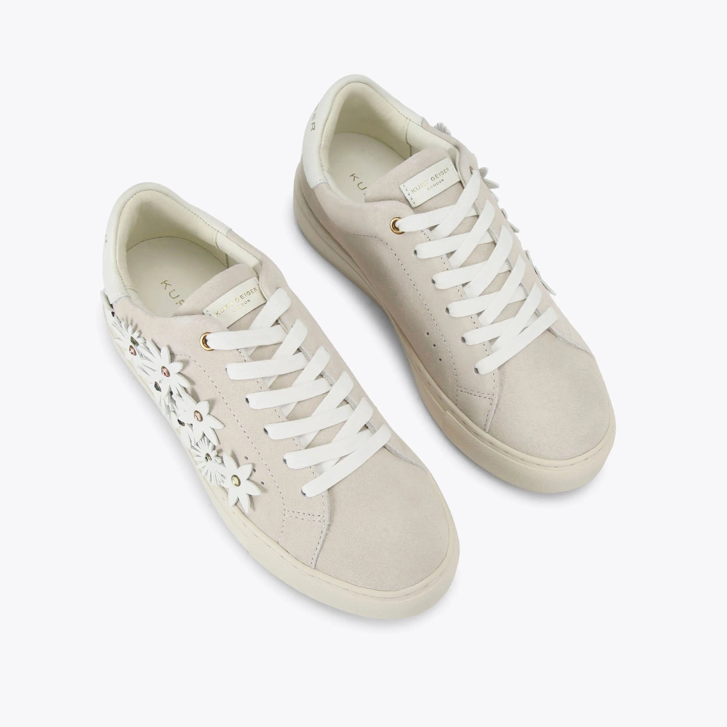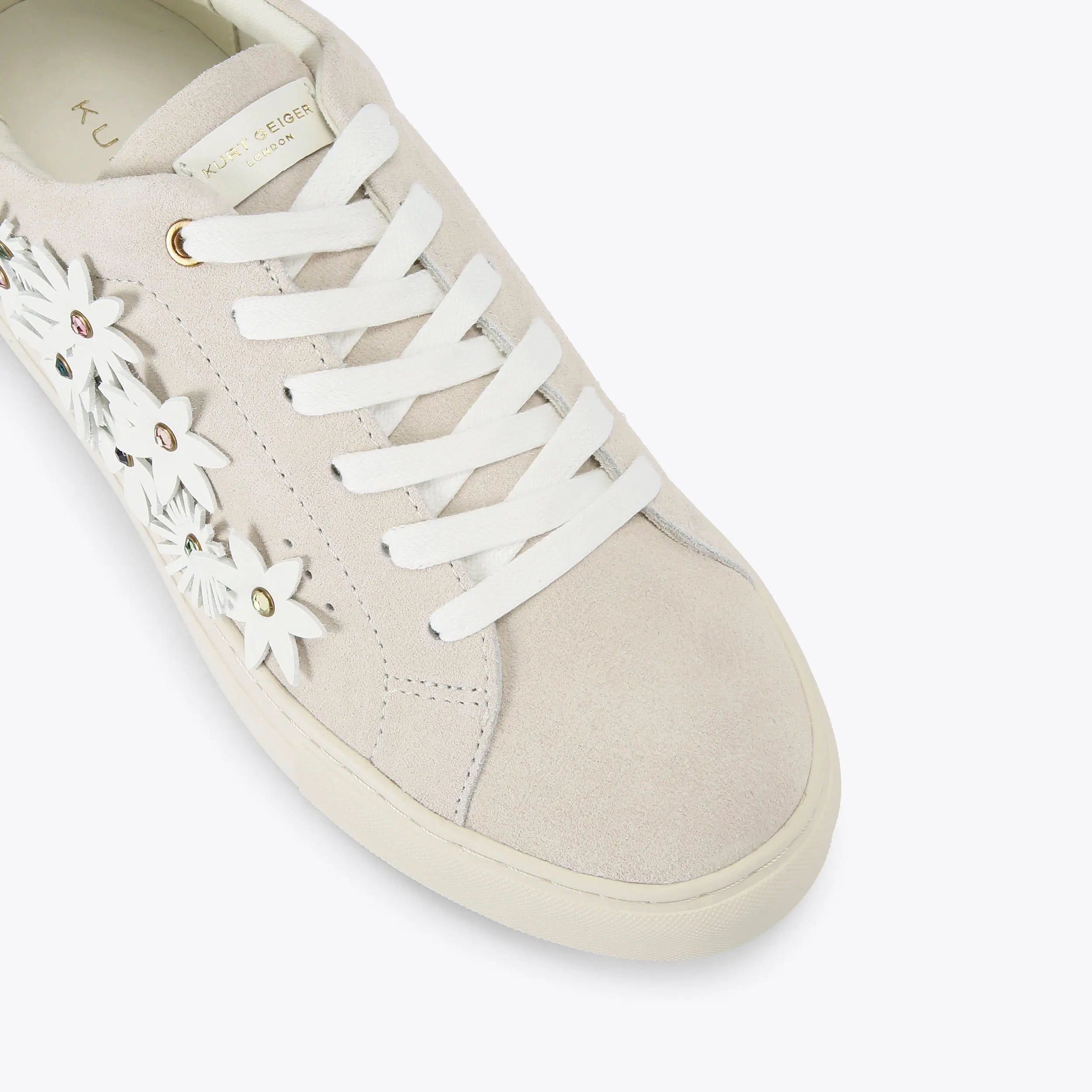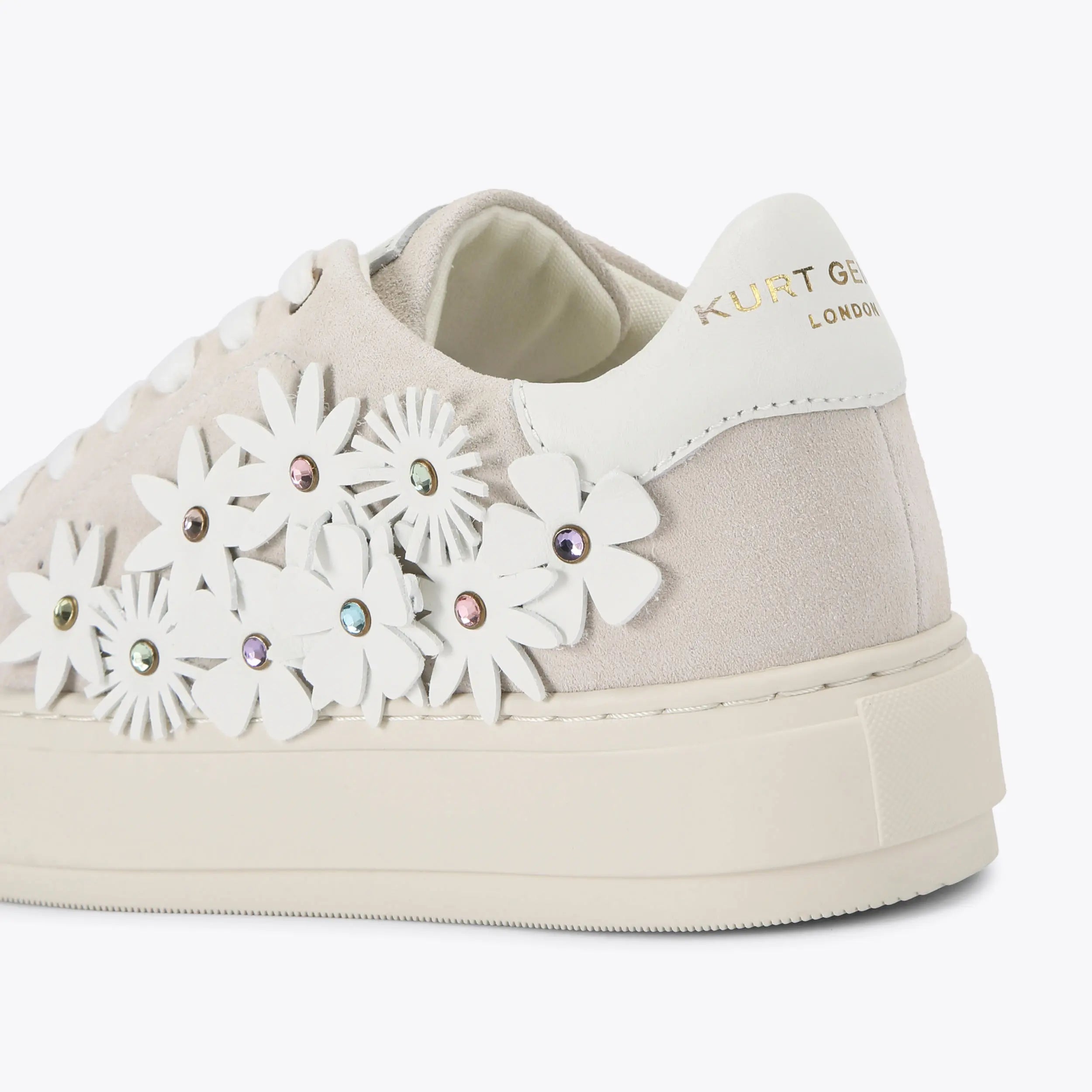 The Laney Flower sneaker is crafted from a bone suede with 3D white flowers with crystals at the centre. The heel is finished with gold foil branding on the heel.