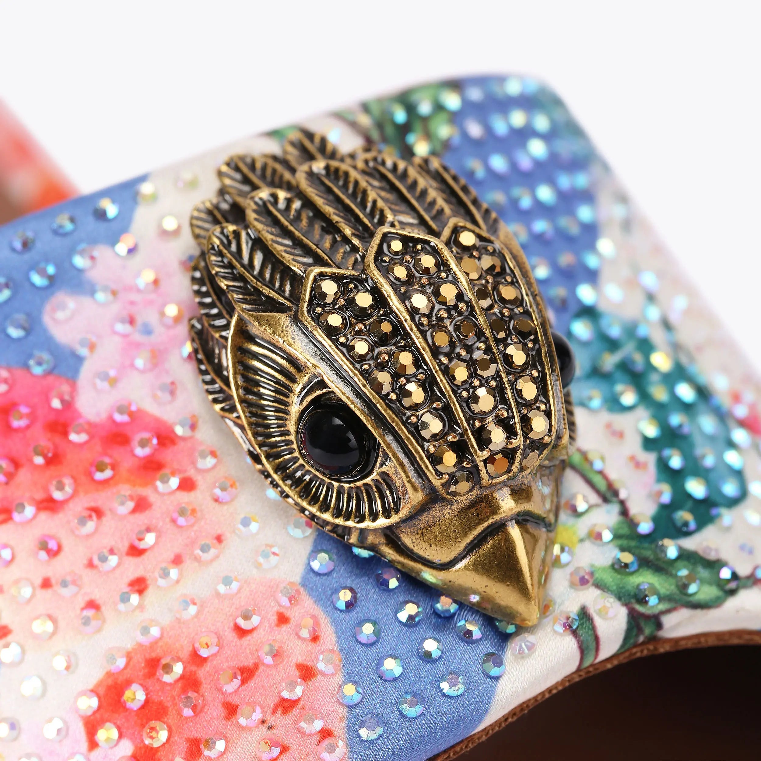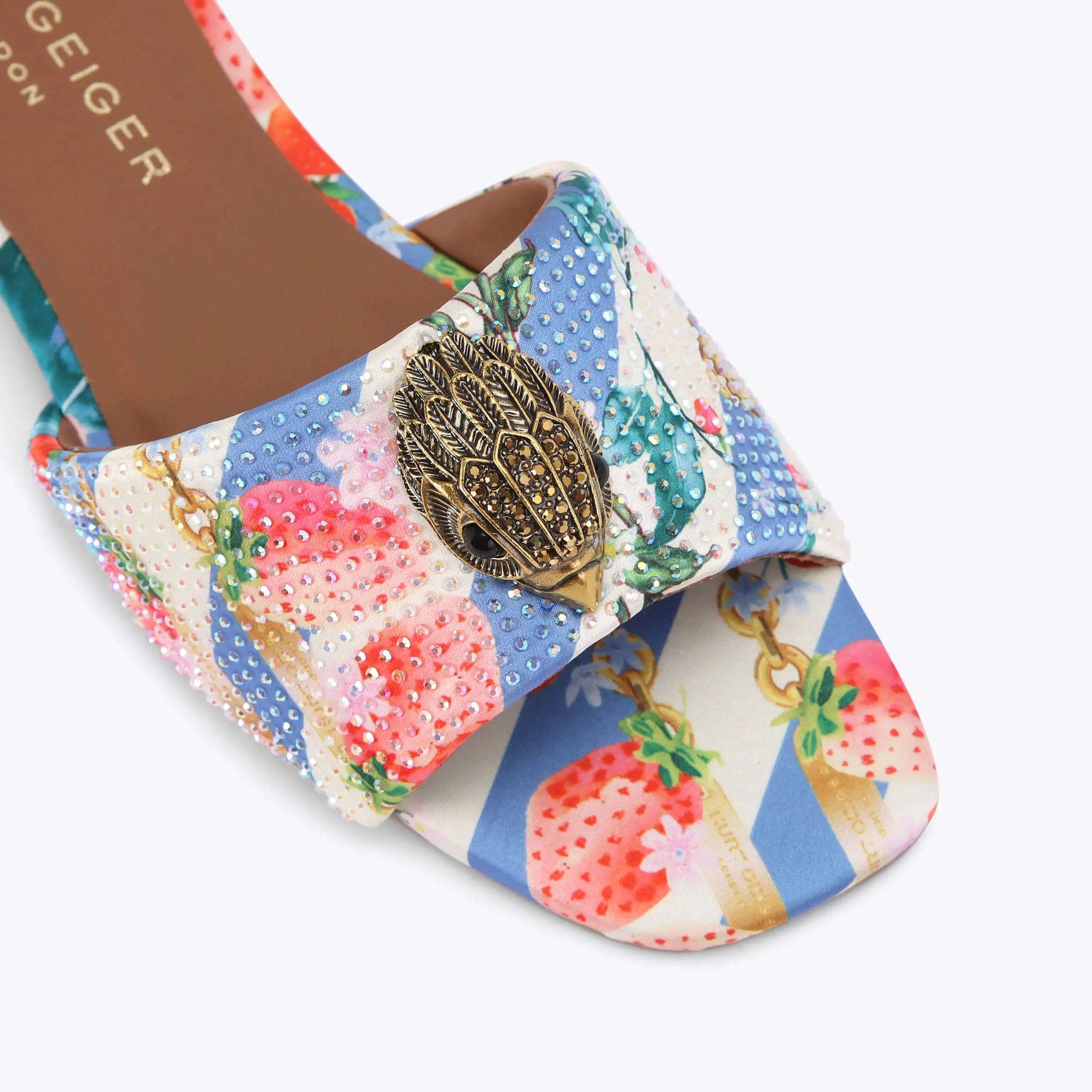 The Kensington Flat Sandal is crafted from a strawberry printed striped satin fabric. There is an iridescent crystal embellishment across the strap as well as an antiqued brass eagle head.