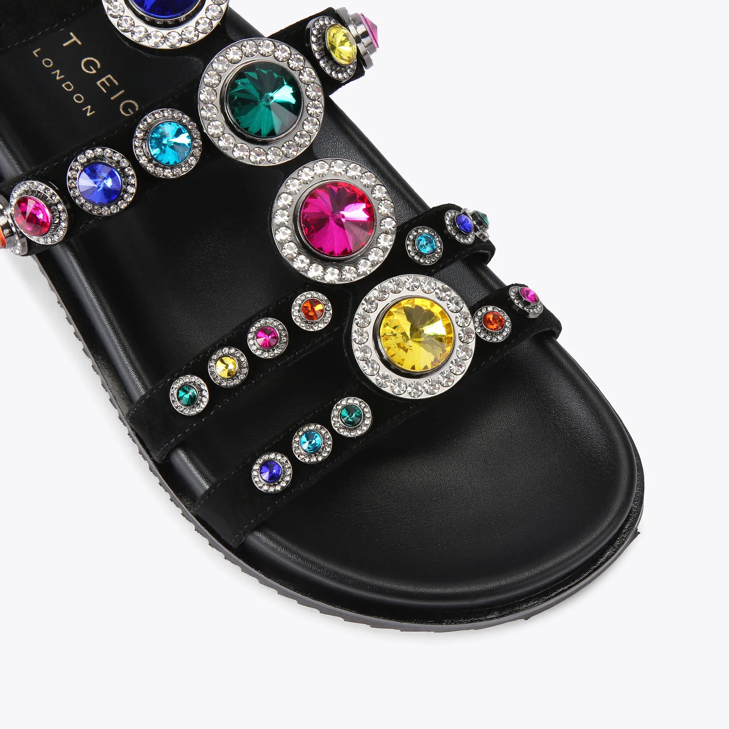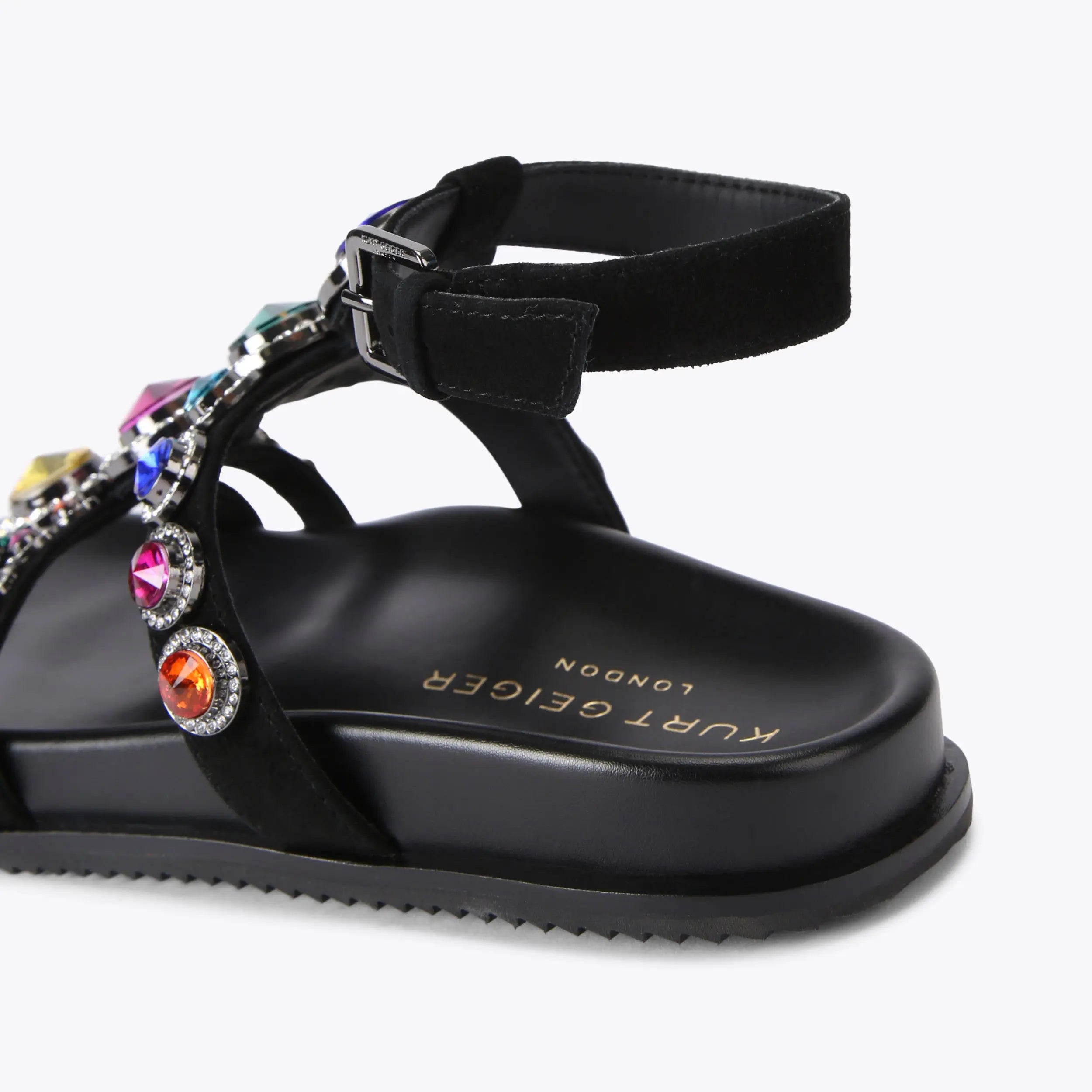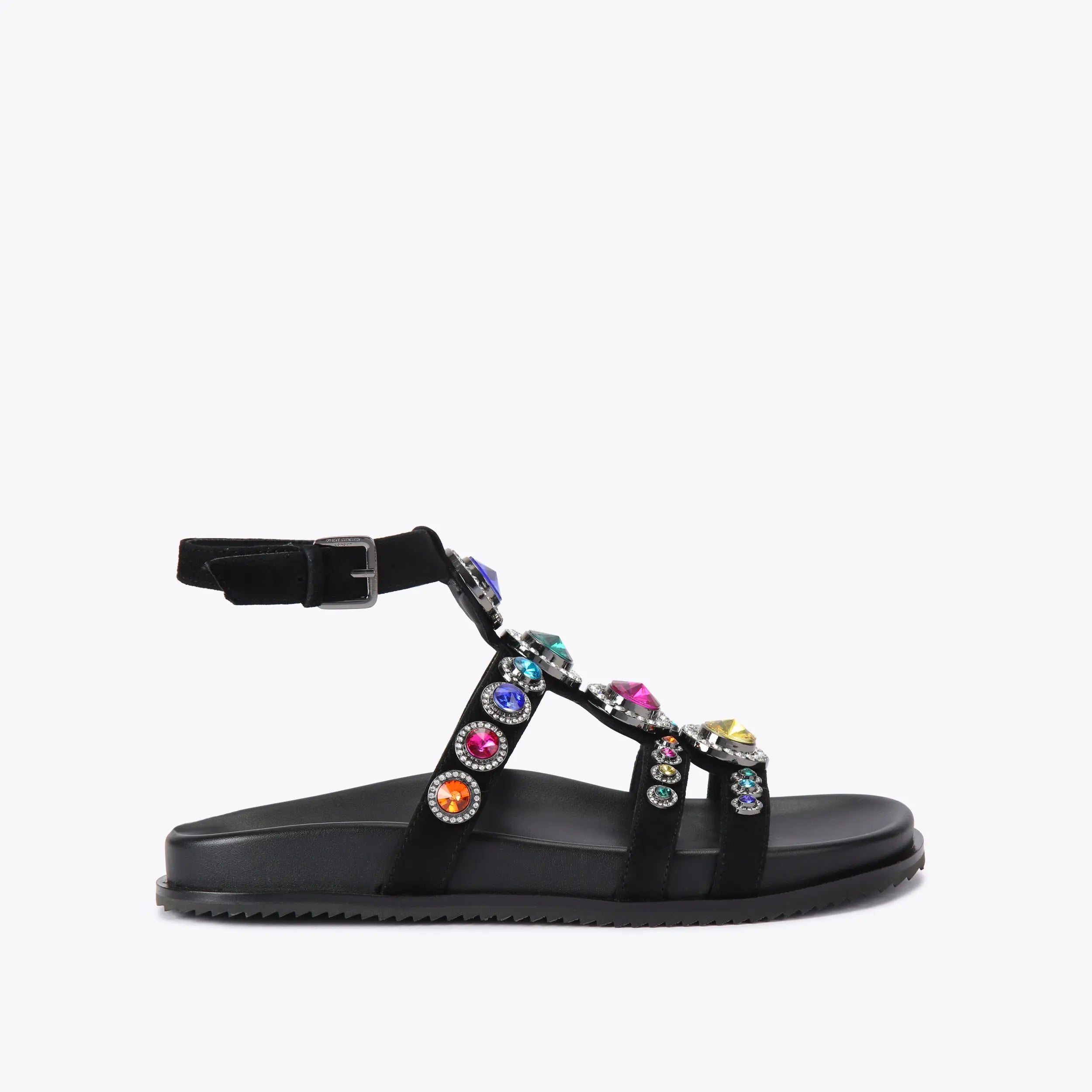 This Octavia Flexi Gladiator heel is crafted from a black leather. There are mixed resin stones across the upper as well as colourful crystals. The ankle strap is fastened
