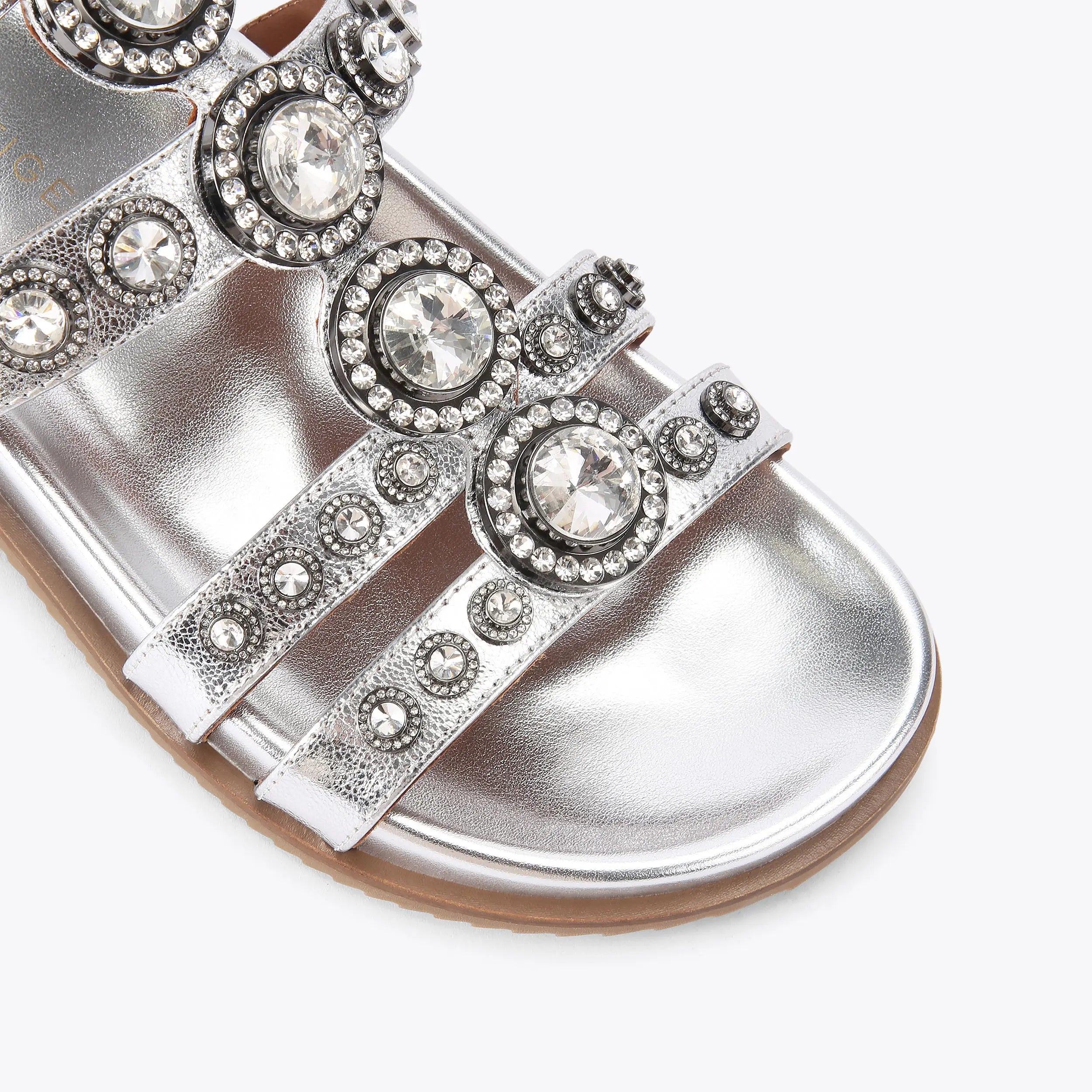 This Octavia Flexi Gladiator heel is crafted from a silver leather. There are silver crystals across the upper. The ankle strap is fastened with a small silver buckle.