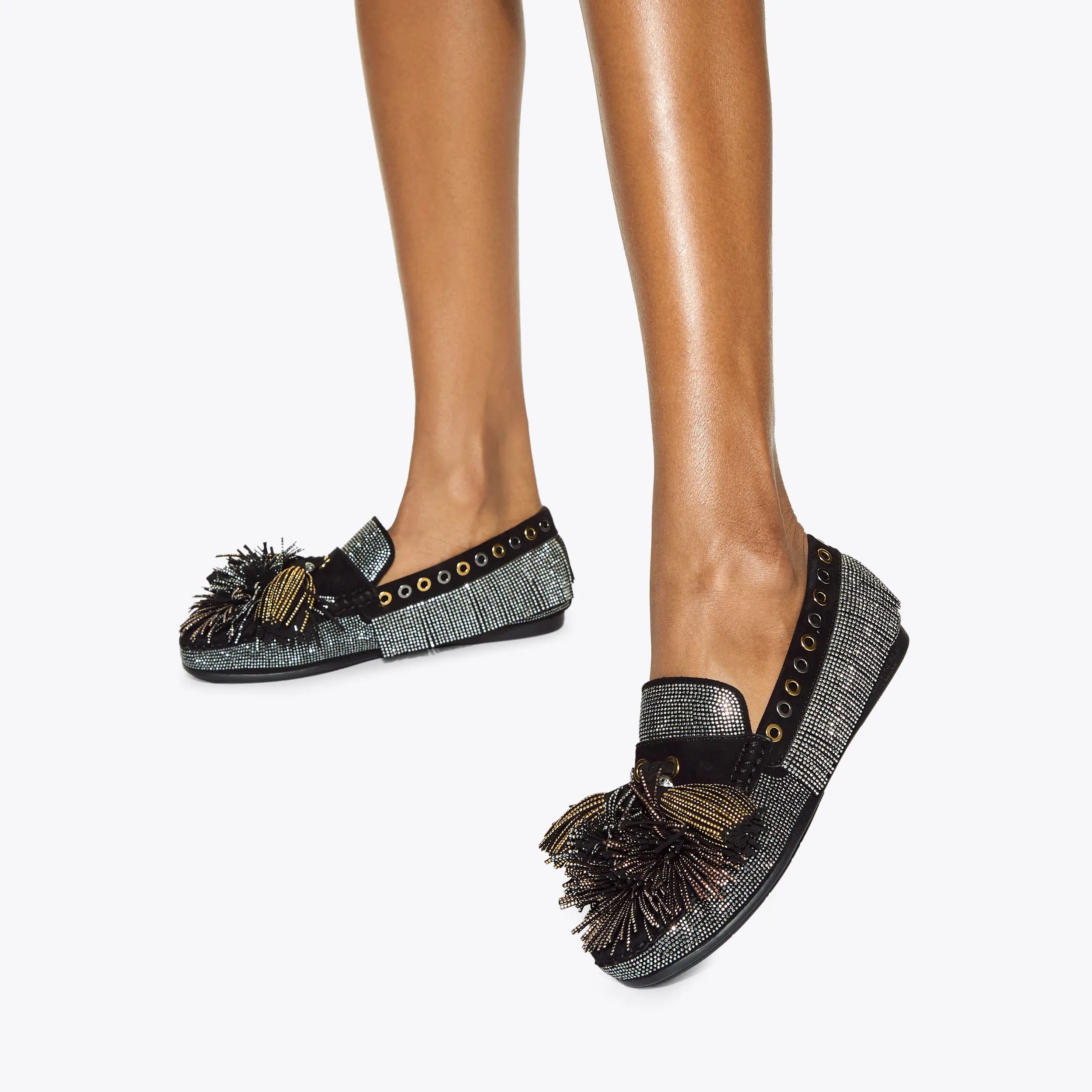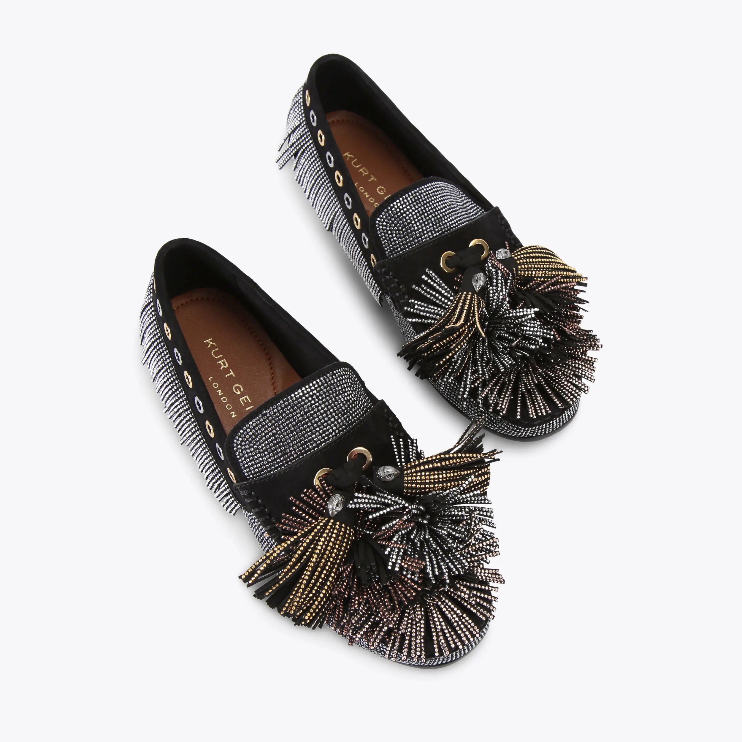 This Pom Pom Moccasin is a slip-on shoe crafted from black suede panels. There is crystal embellishment, fringing and statement pom pom detailing across the shoe.