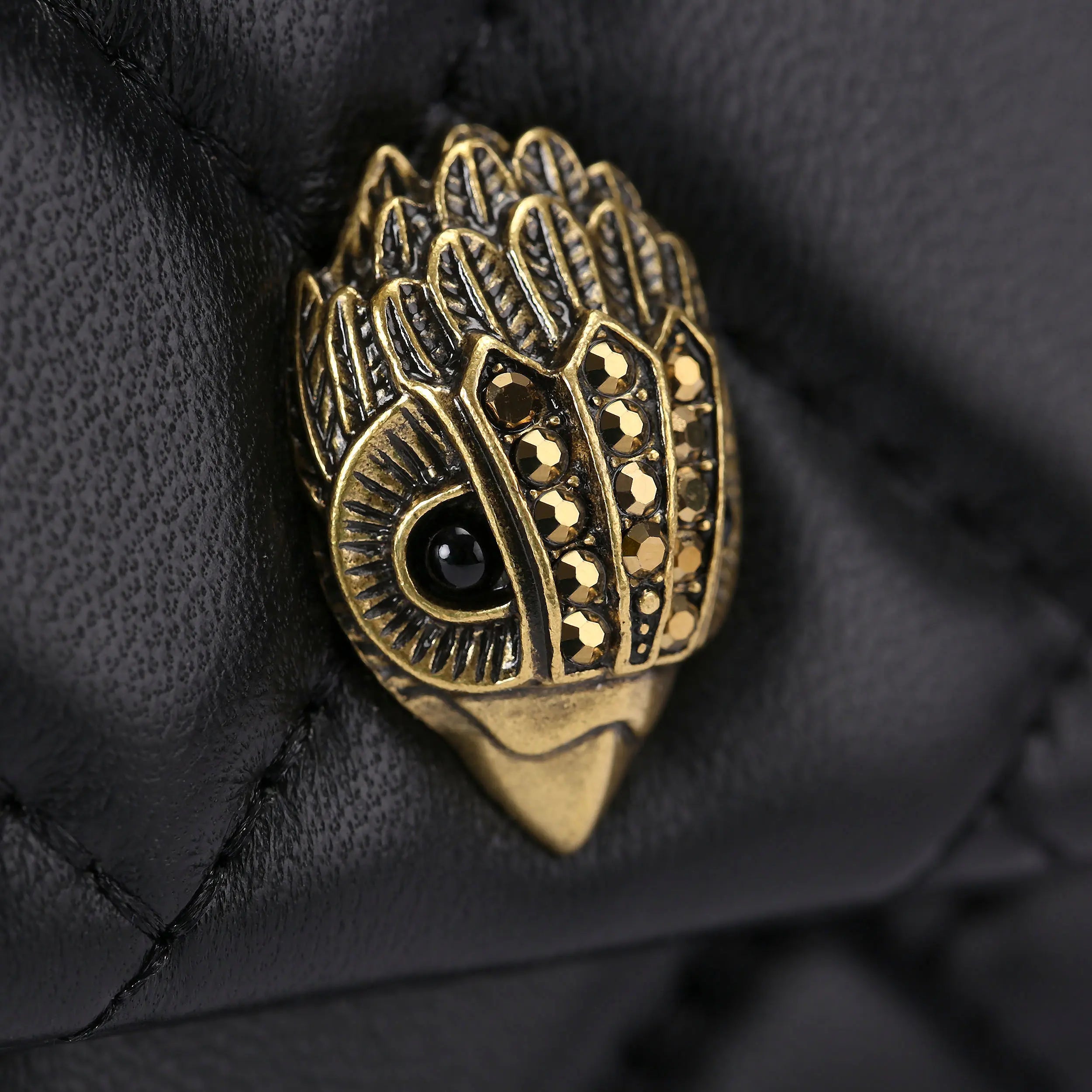 This Micro Handle Kensington features a black leather exterior with overstitch quilting. There is an antiqued brass eagle head with crystals sat on the front flap.
