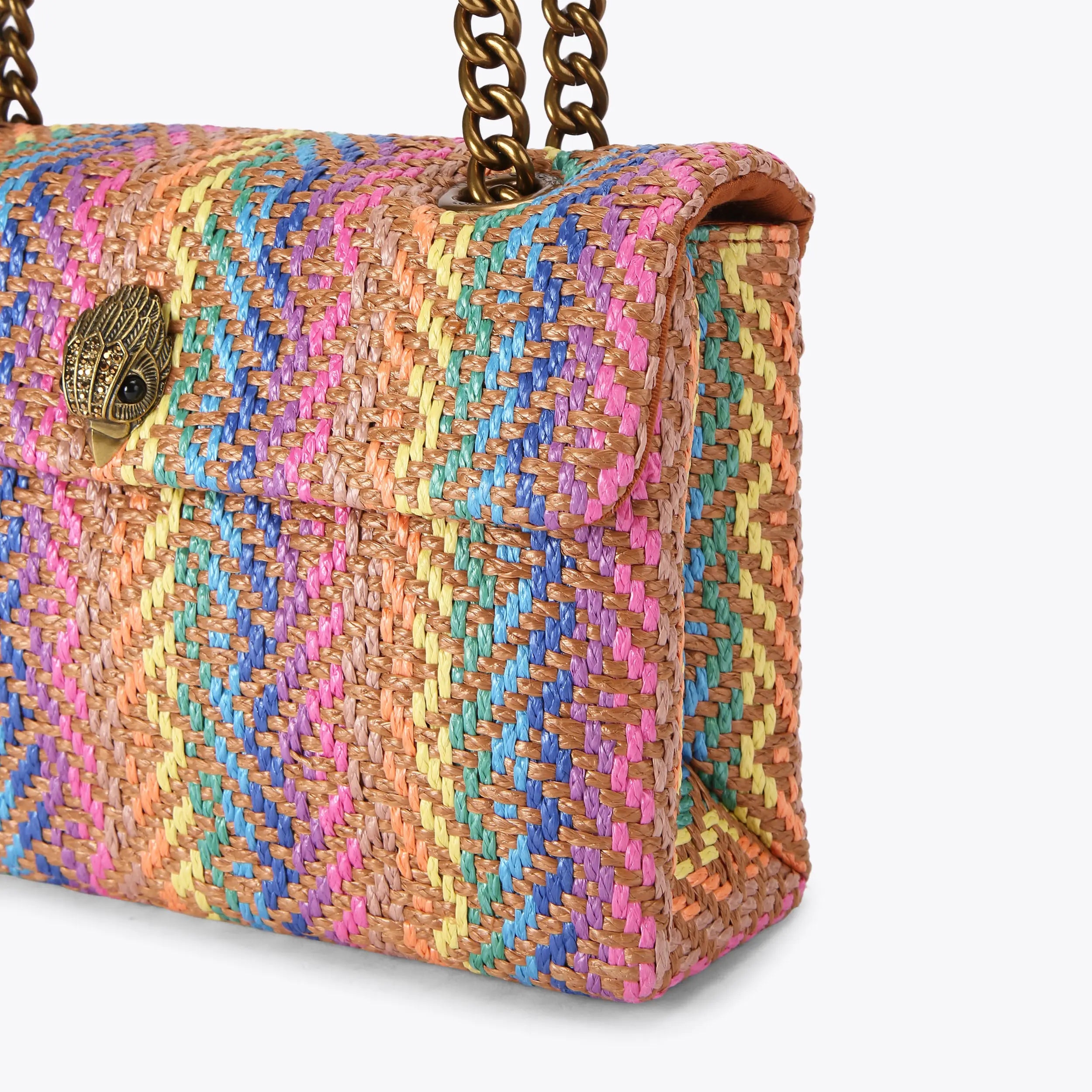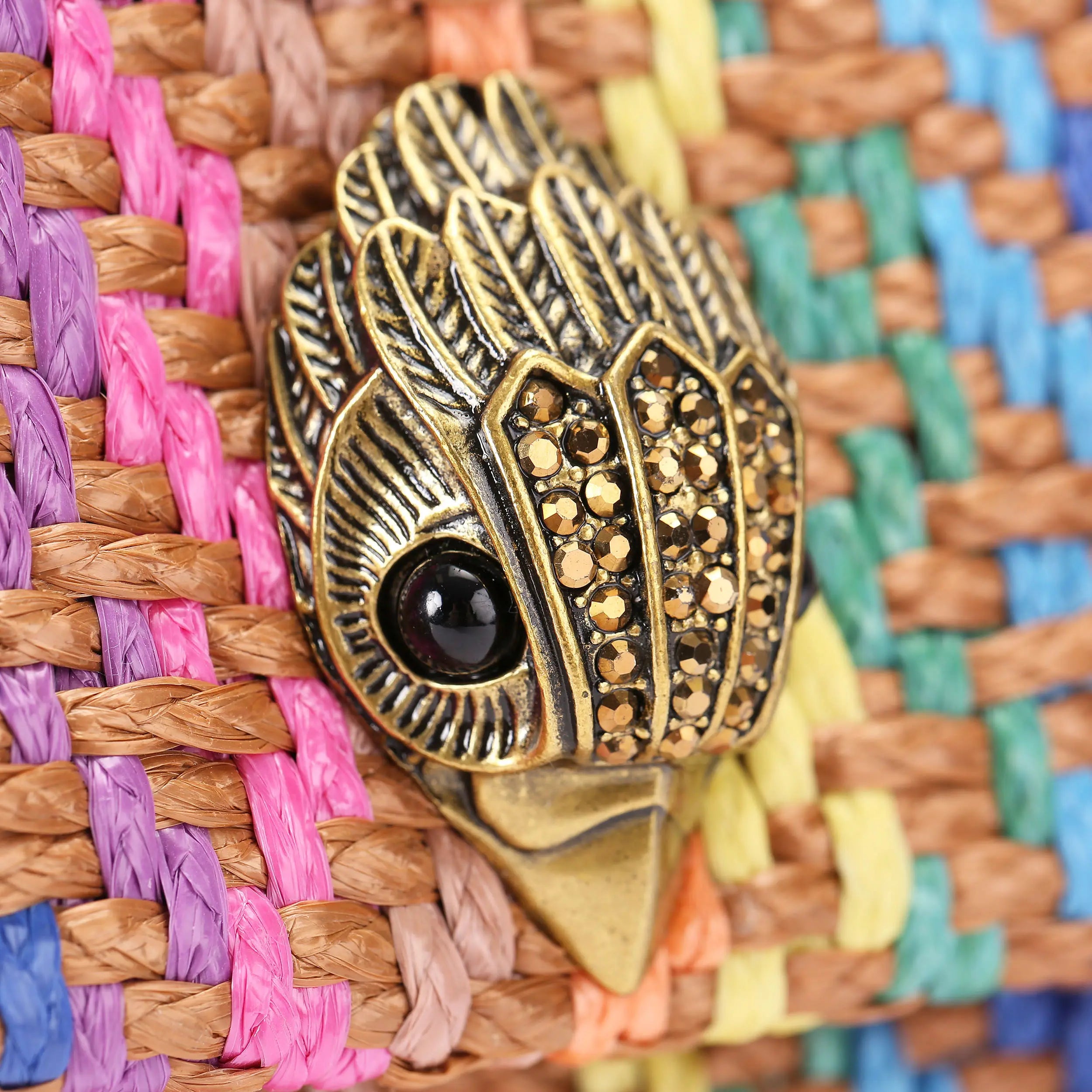 The Kensington Soft purse is crafted from a rainbow woven synthetic weave. The antiqued brass eagle head features crystals and black bead eyes on the front flap.