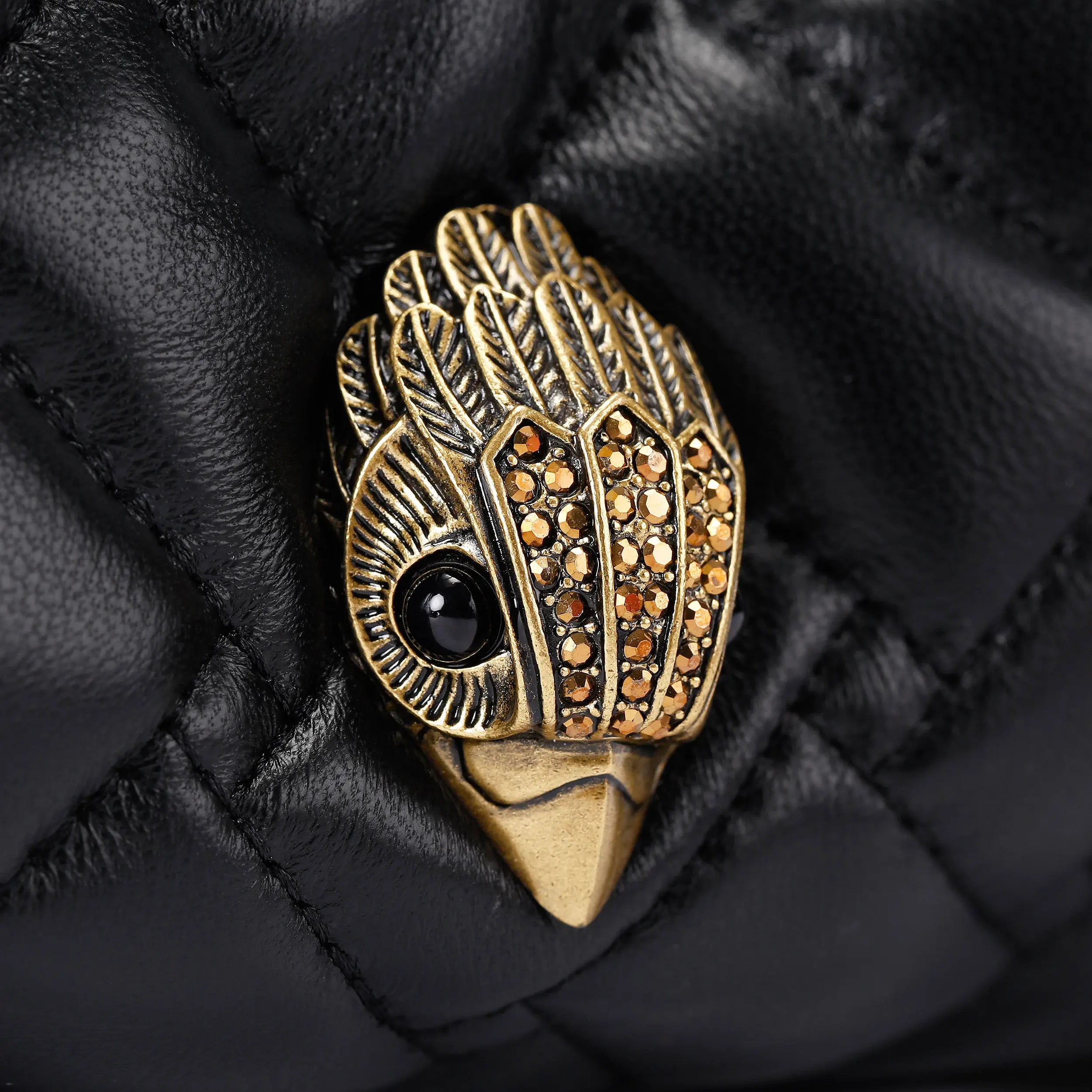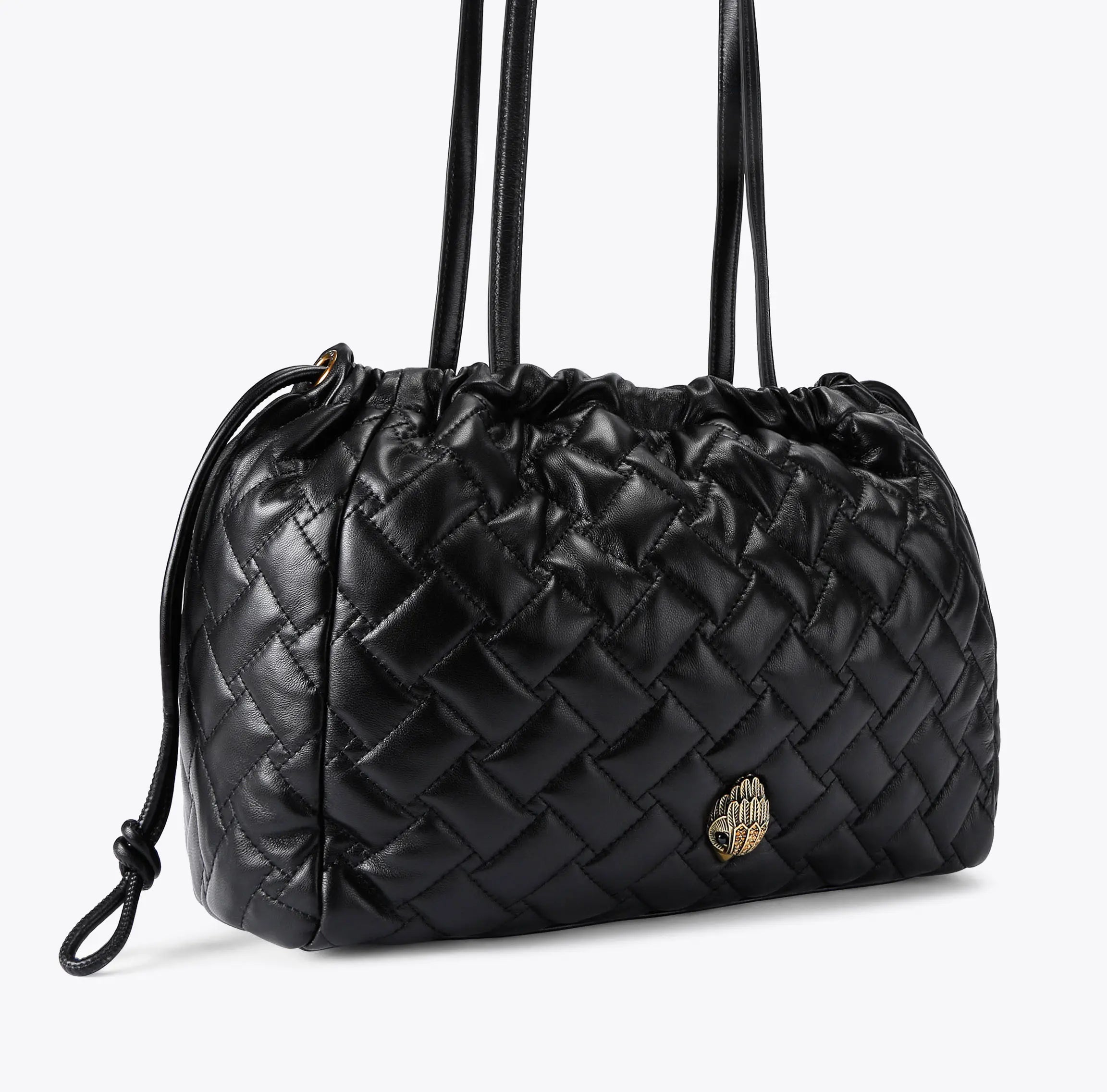 This Kensington String Tote is crafted from a soft black leather with overstitch quilting. There is an antiqued brass eagle head on the front.