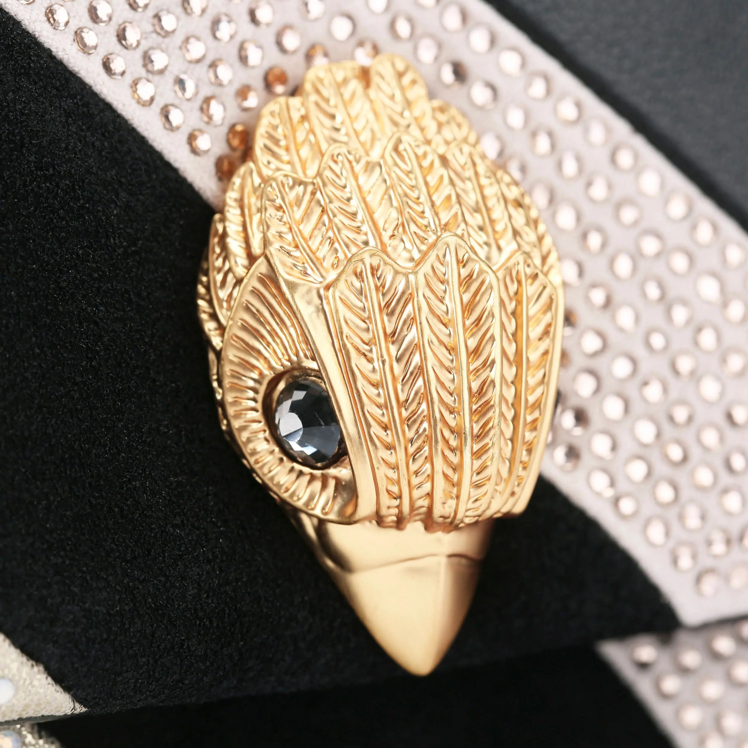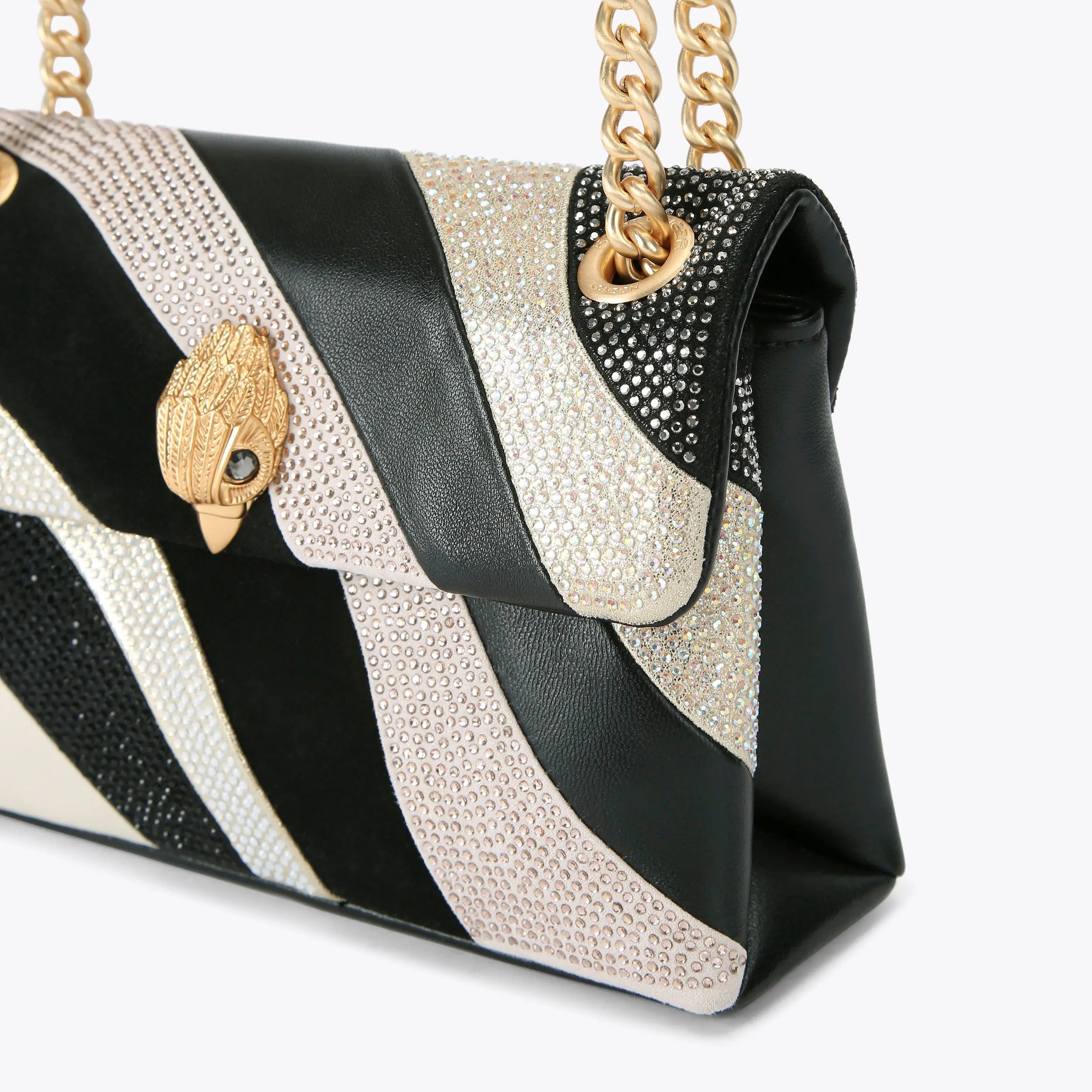 This Mini Kensington bag is crafted from a black and white leather with wave design and parts are crystal embellished. The brushed gold eagle head sits on the front flap.