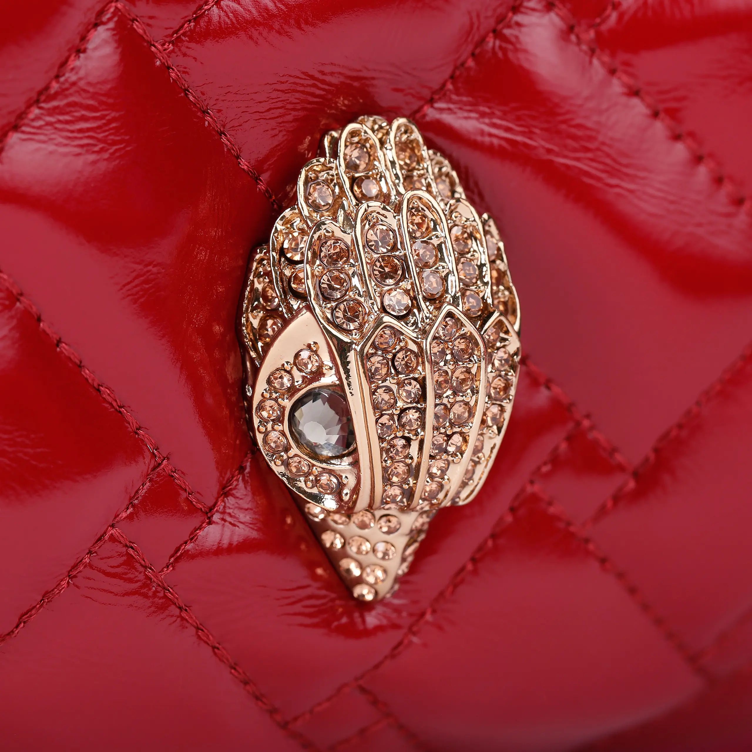 This Small Kensington String Tote is crafted from a supple maroon leather with overstitching quilting across the exterior. There are two knot tied straps to tighten the bag and two top handles.