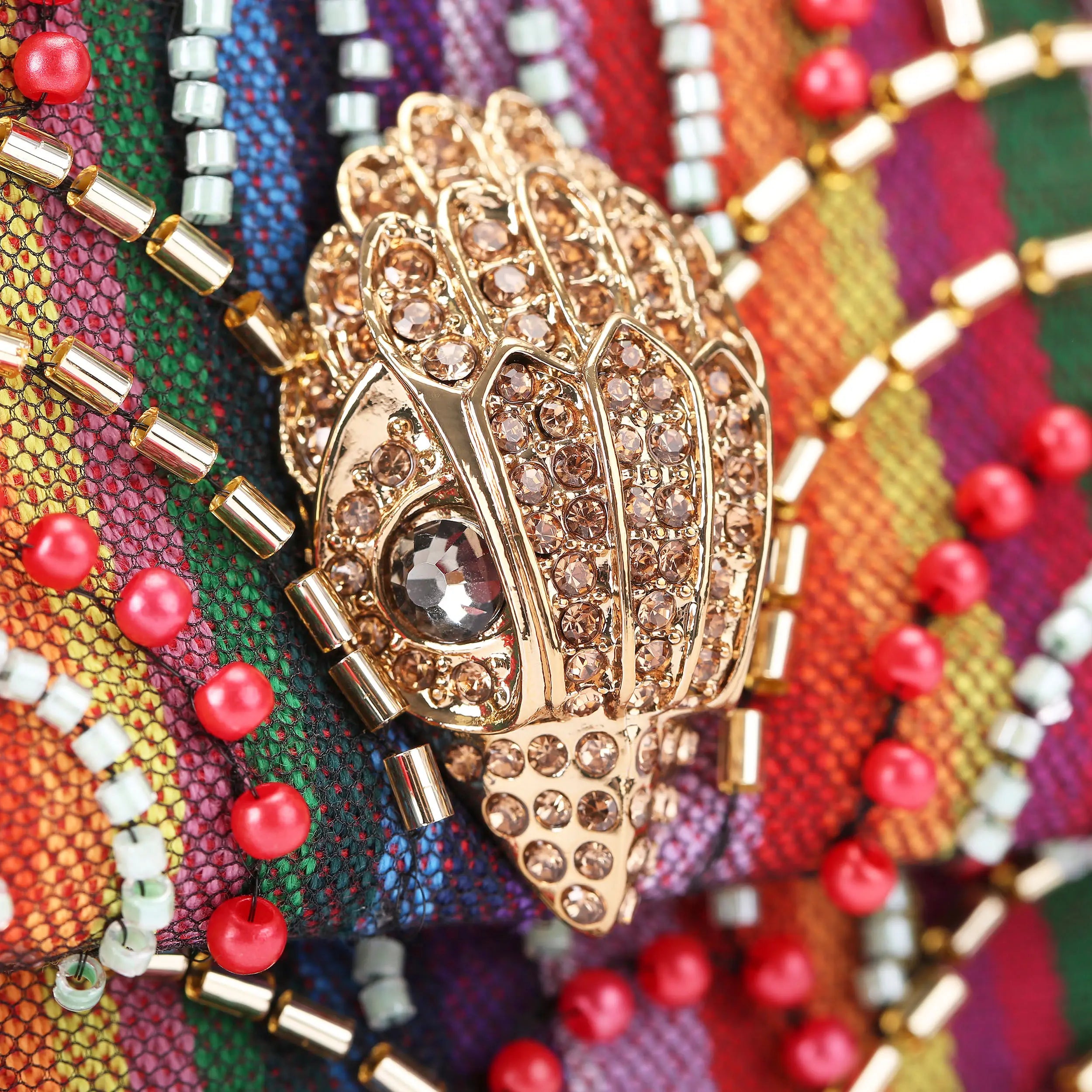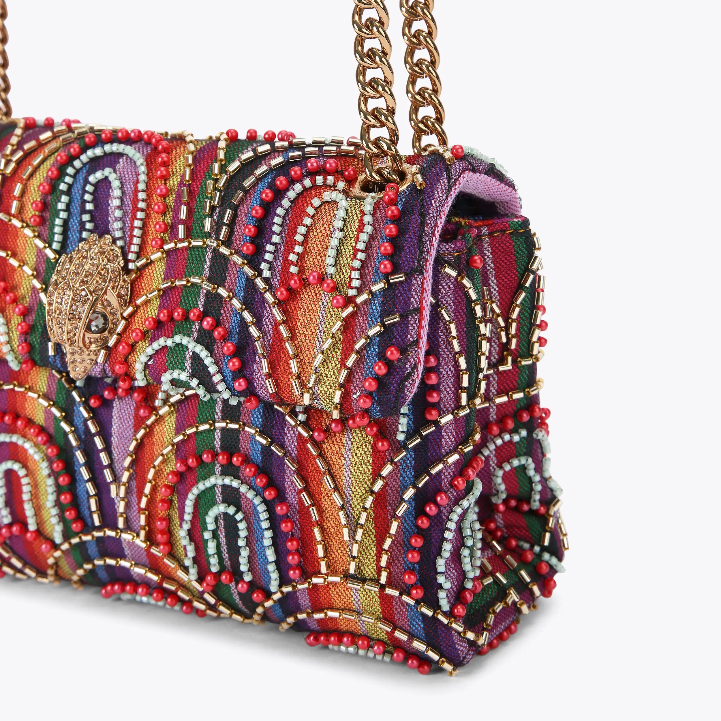 The Medium Soft Kensington purse is crafted from a striped fabric which is embellished with beads crating a simple rainbow design. The gold metal eagle head sits on the front flap of the bag.