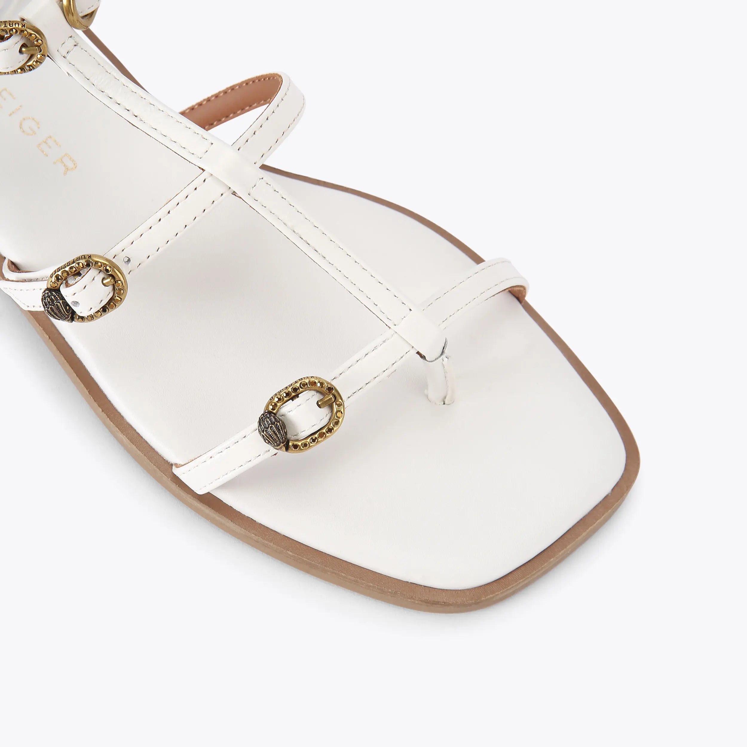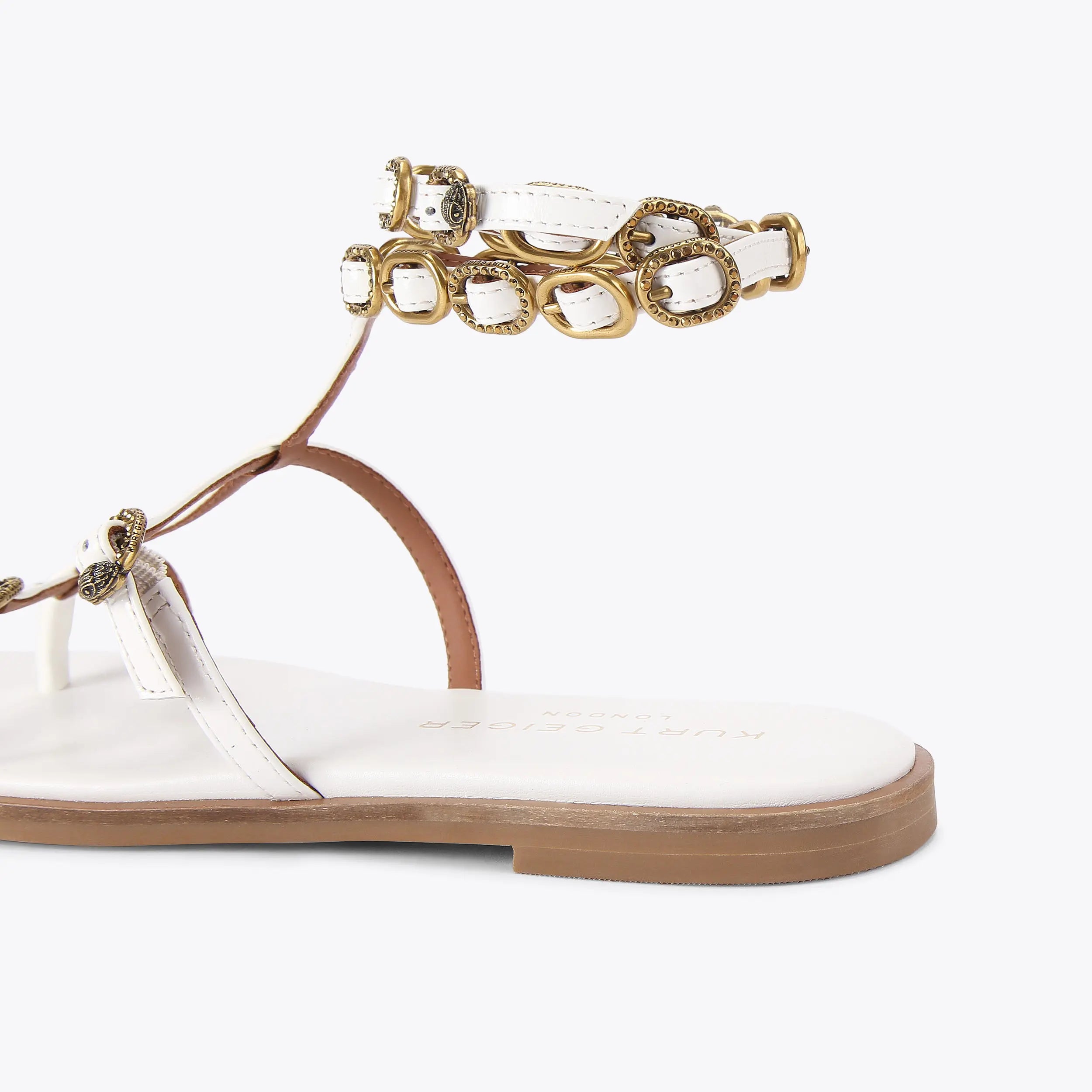 This Regent Block Gladiator sandal is crafted from a white leather. There are multiple antiqued brass buckles featuring micro eagle heads across the strappy upper. The heel is in a block style.