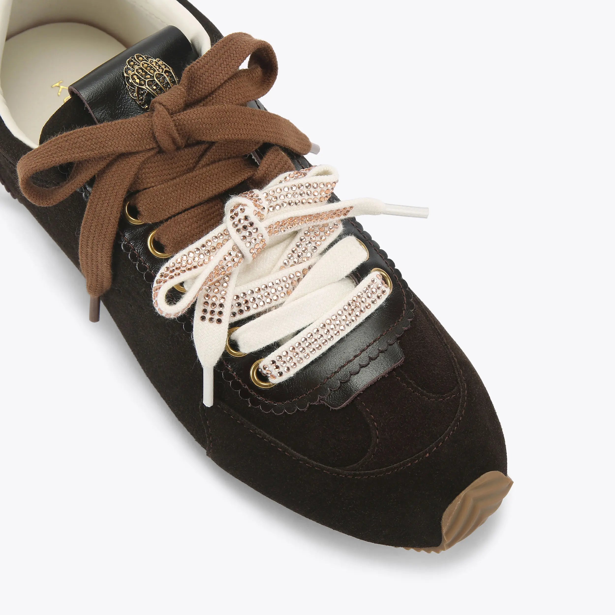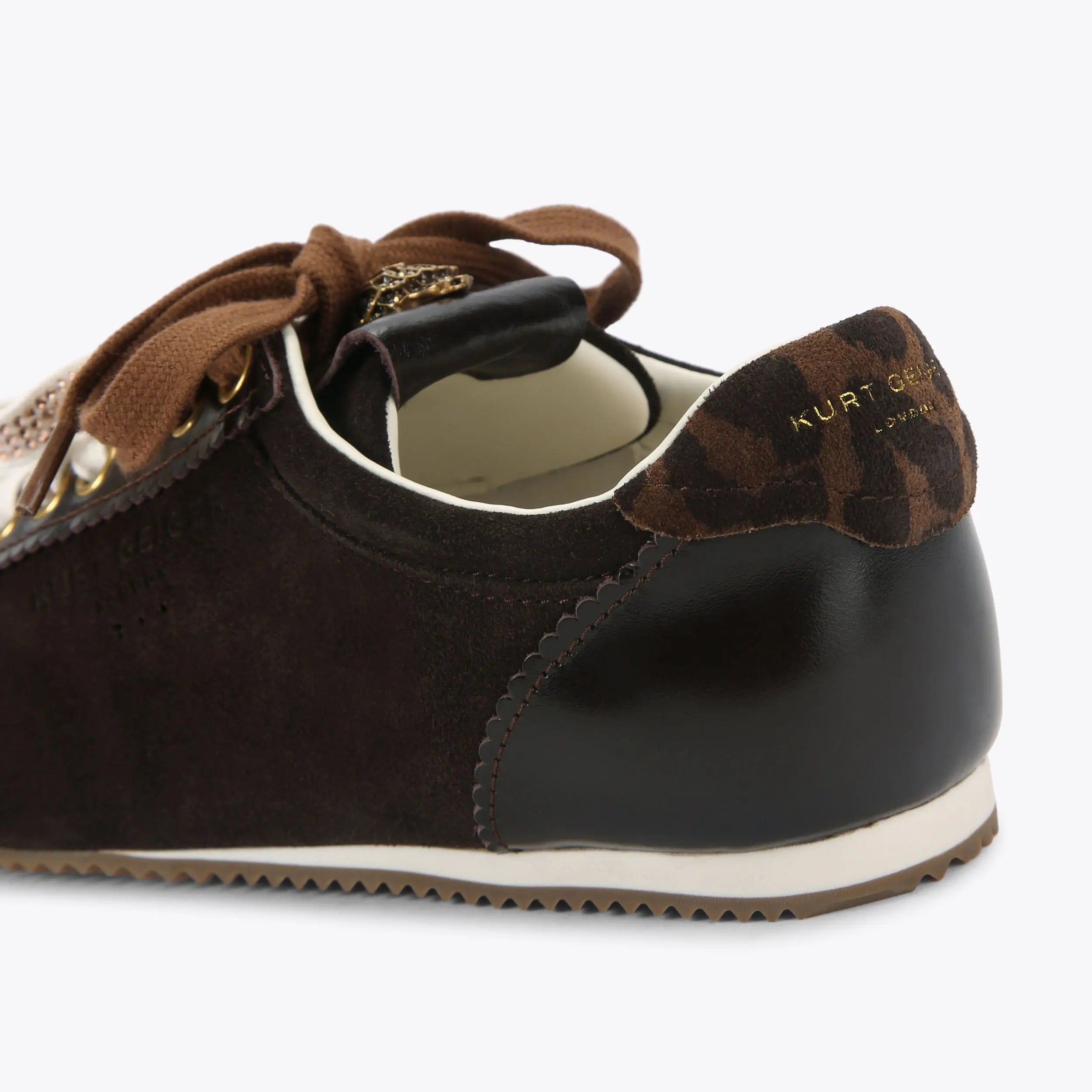 This Islington Sneaker is crafted from a brown suede leather. The front is laced up with crystals on the laces in a multi-lace detail. There is an antiqued brass eagle head with crystals sat on the tongue and a leopard print rear pull tab.