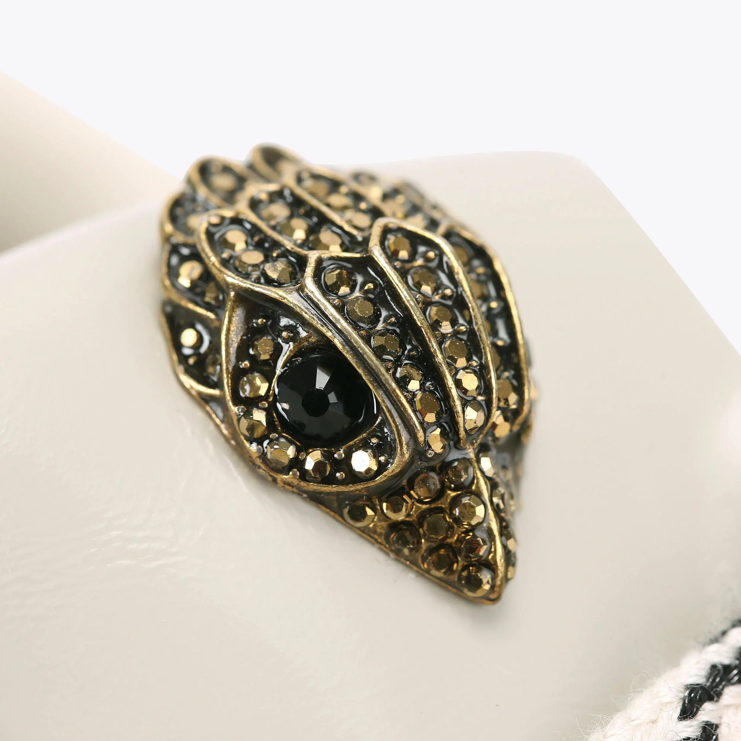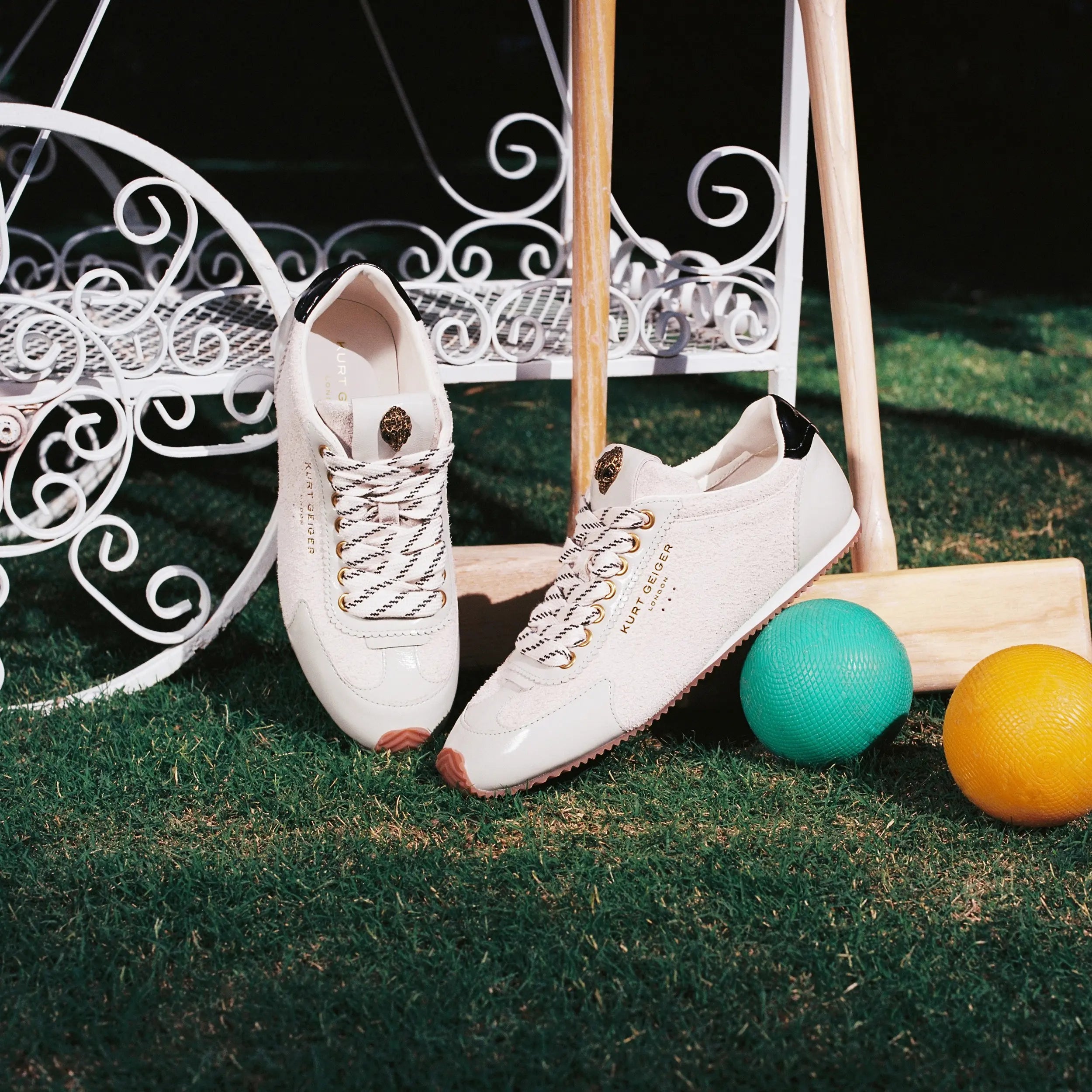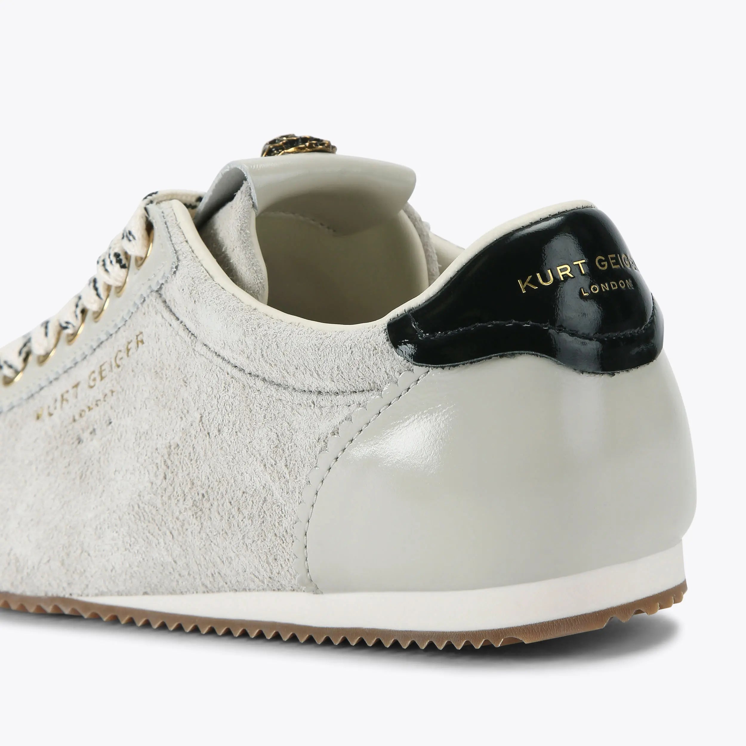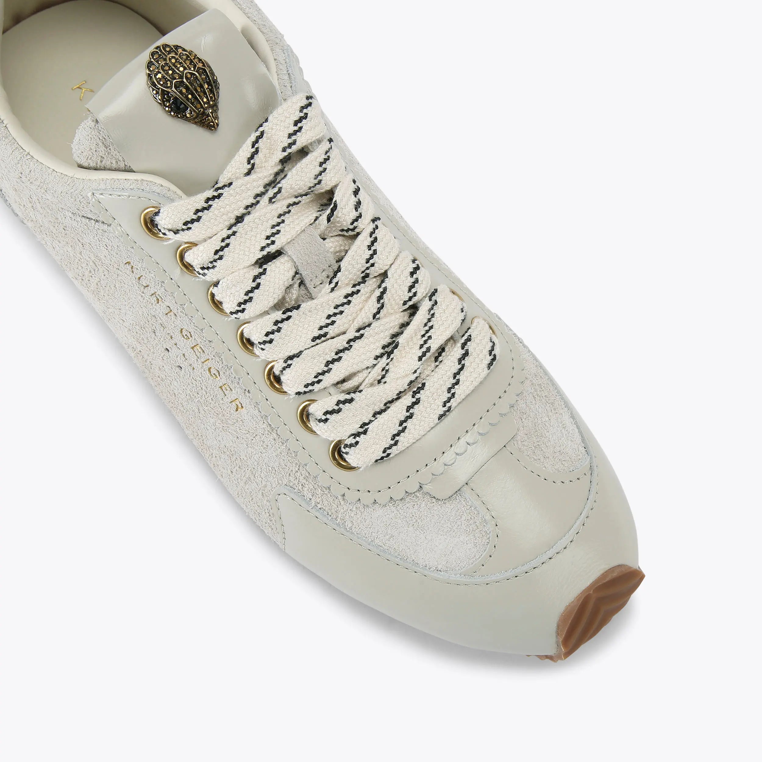 This Islington Sneaker is crafted from a beige suede with patent toe and heel. The front is laced up with wide fabric laces. There is an antiqued brass eagle head with crystals sat on the tongue.